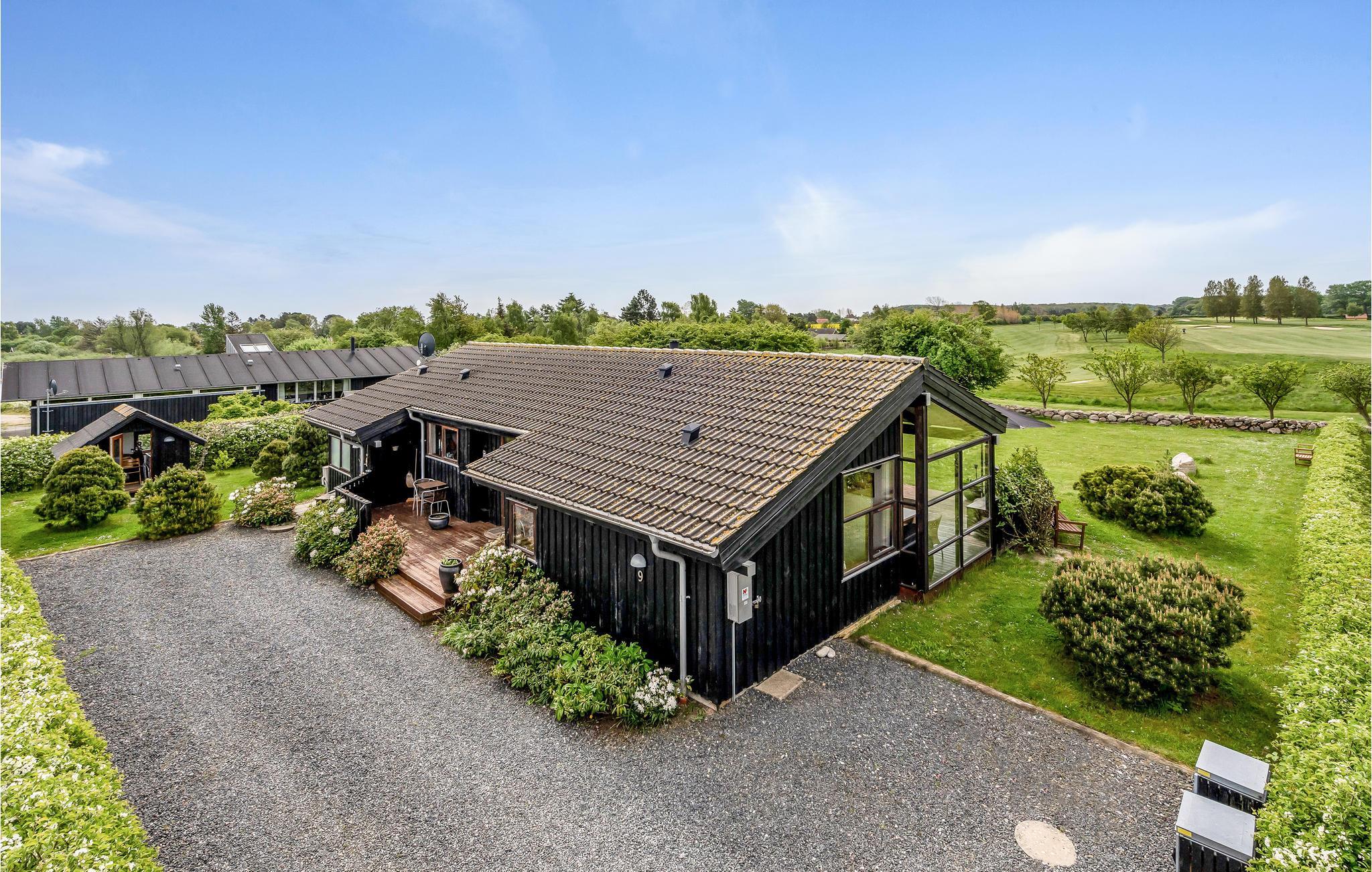 Velindrettet træhus på Langeland med udsigt til golfbanen og moderne faciliteter.