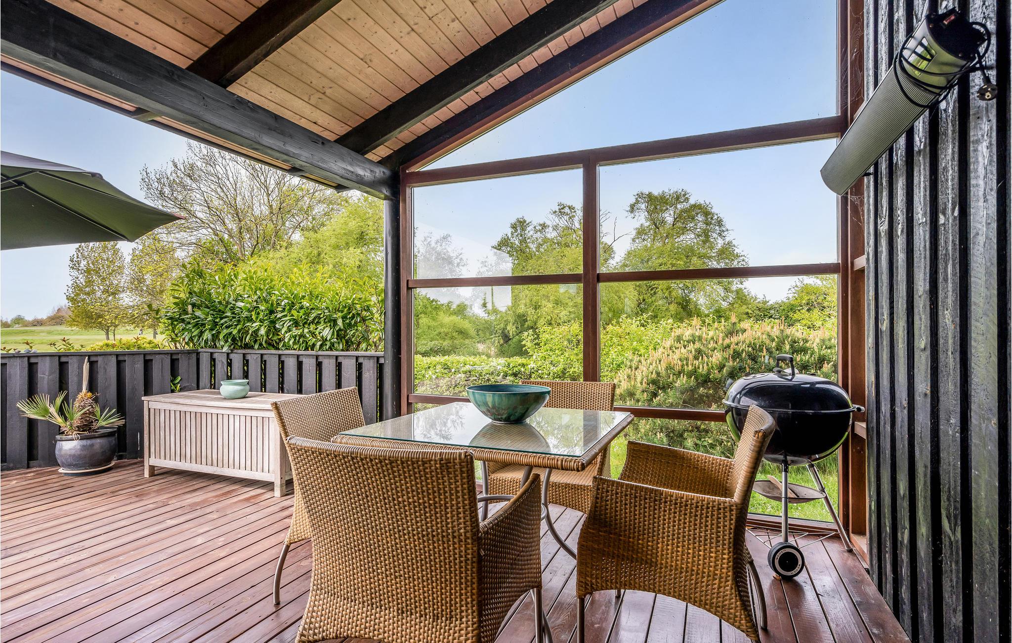 Hyggeligt træhus med terrasse og udsigt over golfbane på smukke Langeland.