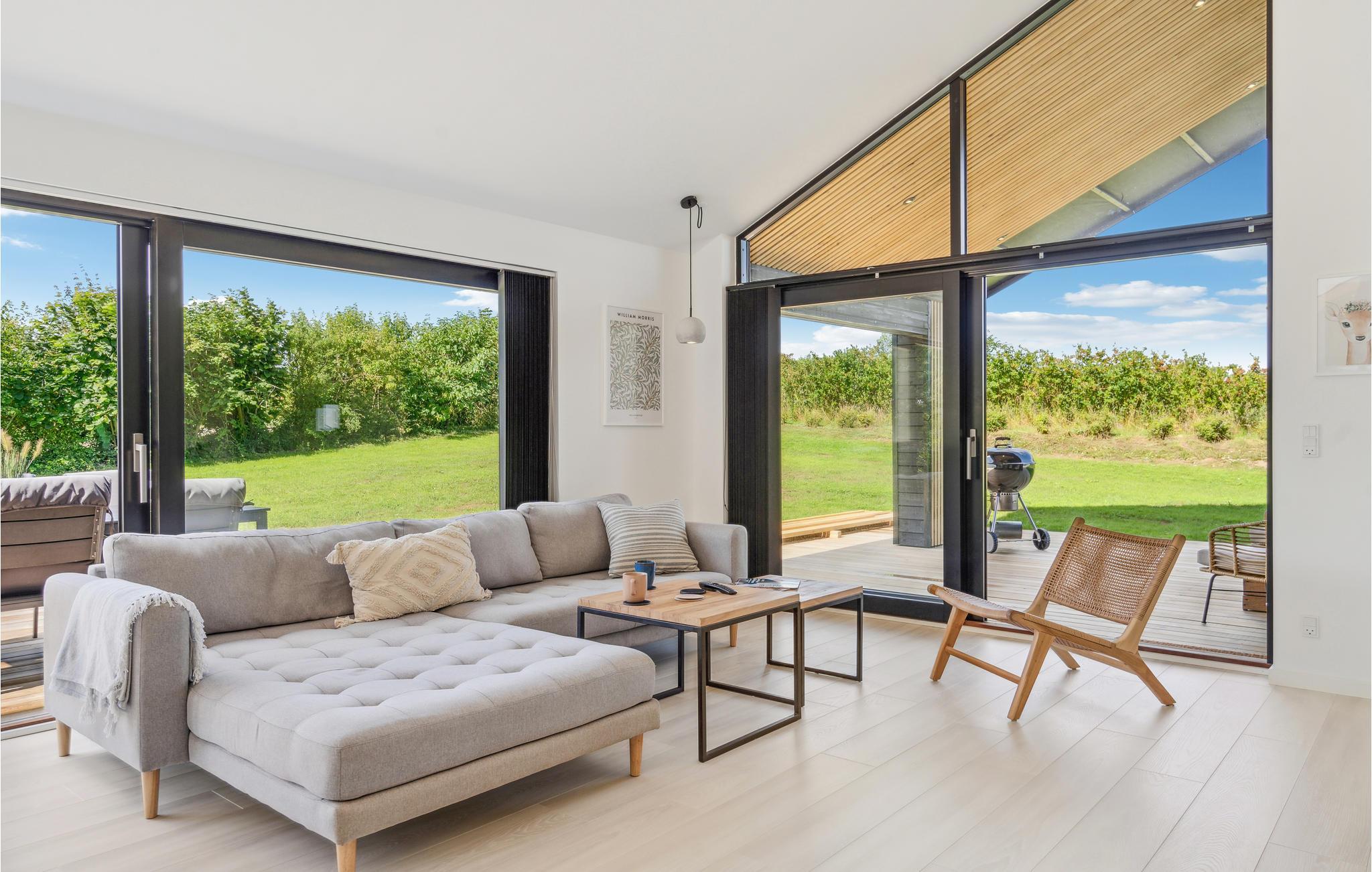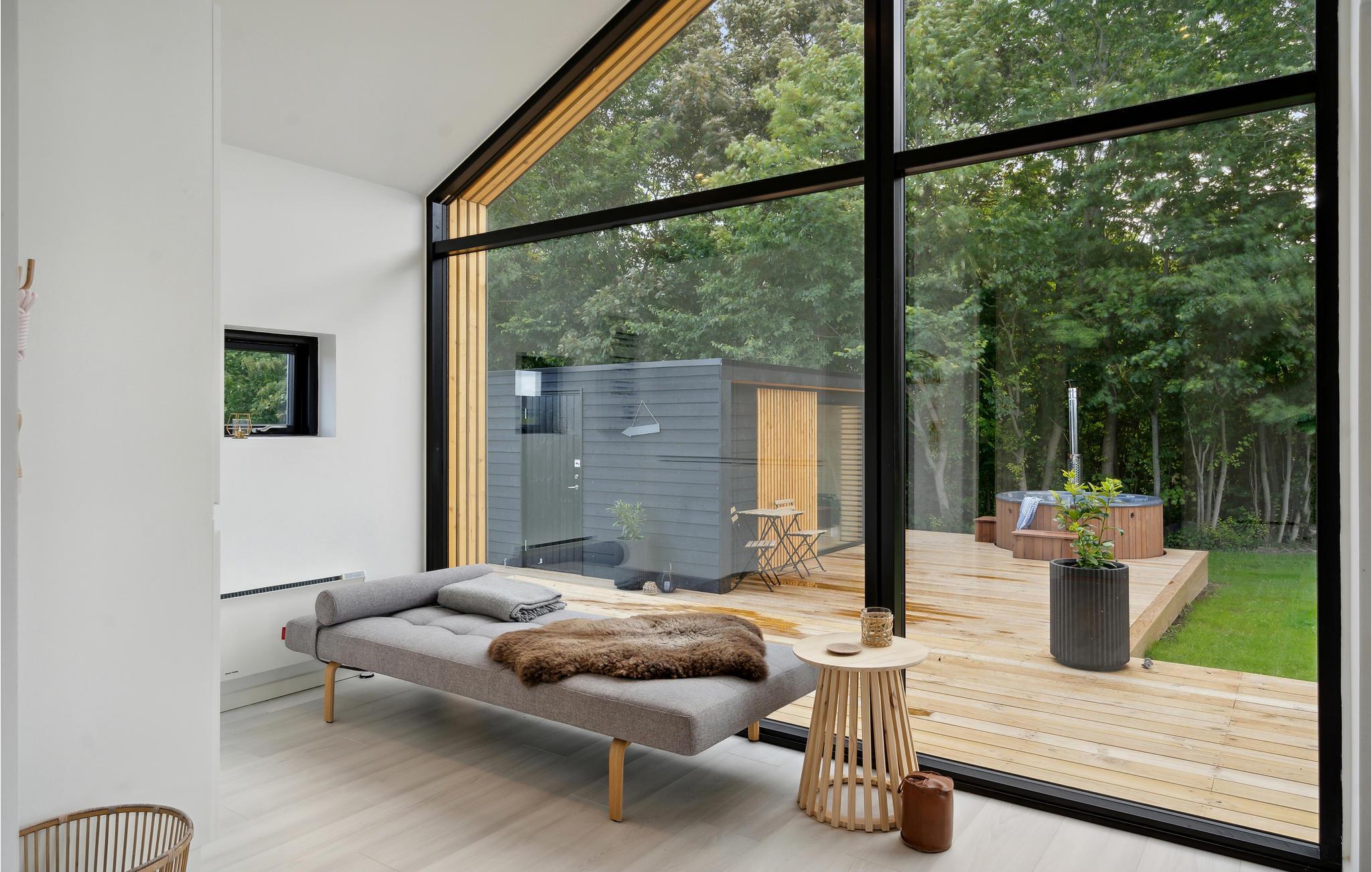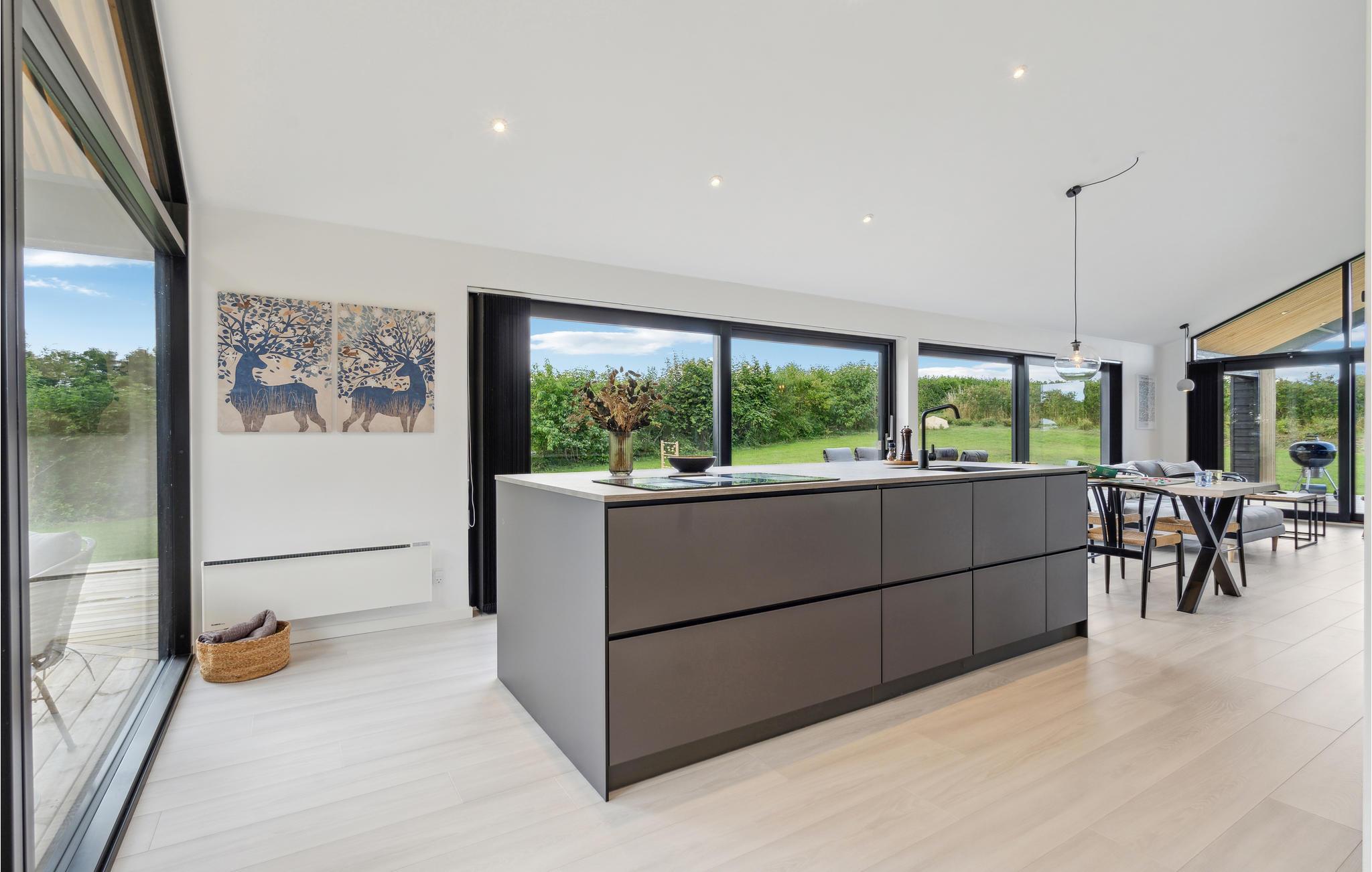 De store sorte vinduesrammer skaber en fantastisk atmosfære i opholdsrummet, hvor I kommer til at tilbringe en god del af jeres ferie. Her sidder man midt i den grønne have i et rum, hvor ude og inde fuldstændig smelter sammen. Hyg jer med madlavningen på køkkenøen, mens I kigger ud på den grønne grund og find senere brætspillene frem, når aftensmaden er overstået. Efter en lang dag på farten kan I fortsætte aftenen i sofaen med popcorn og en god serie i fjernsynet.