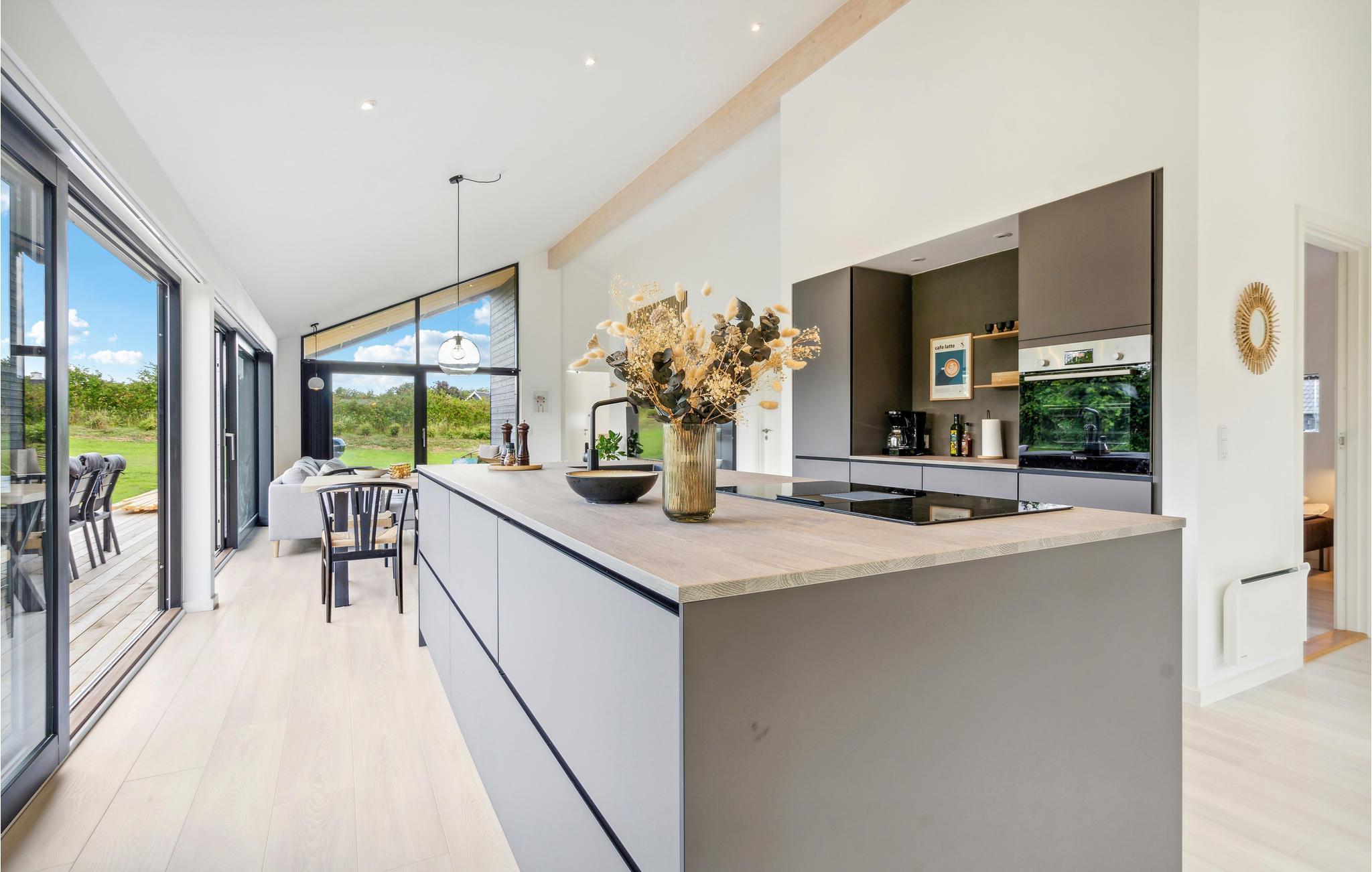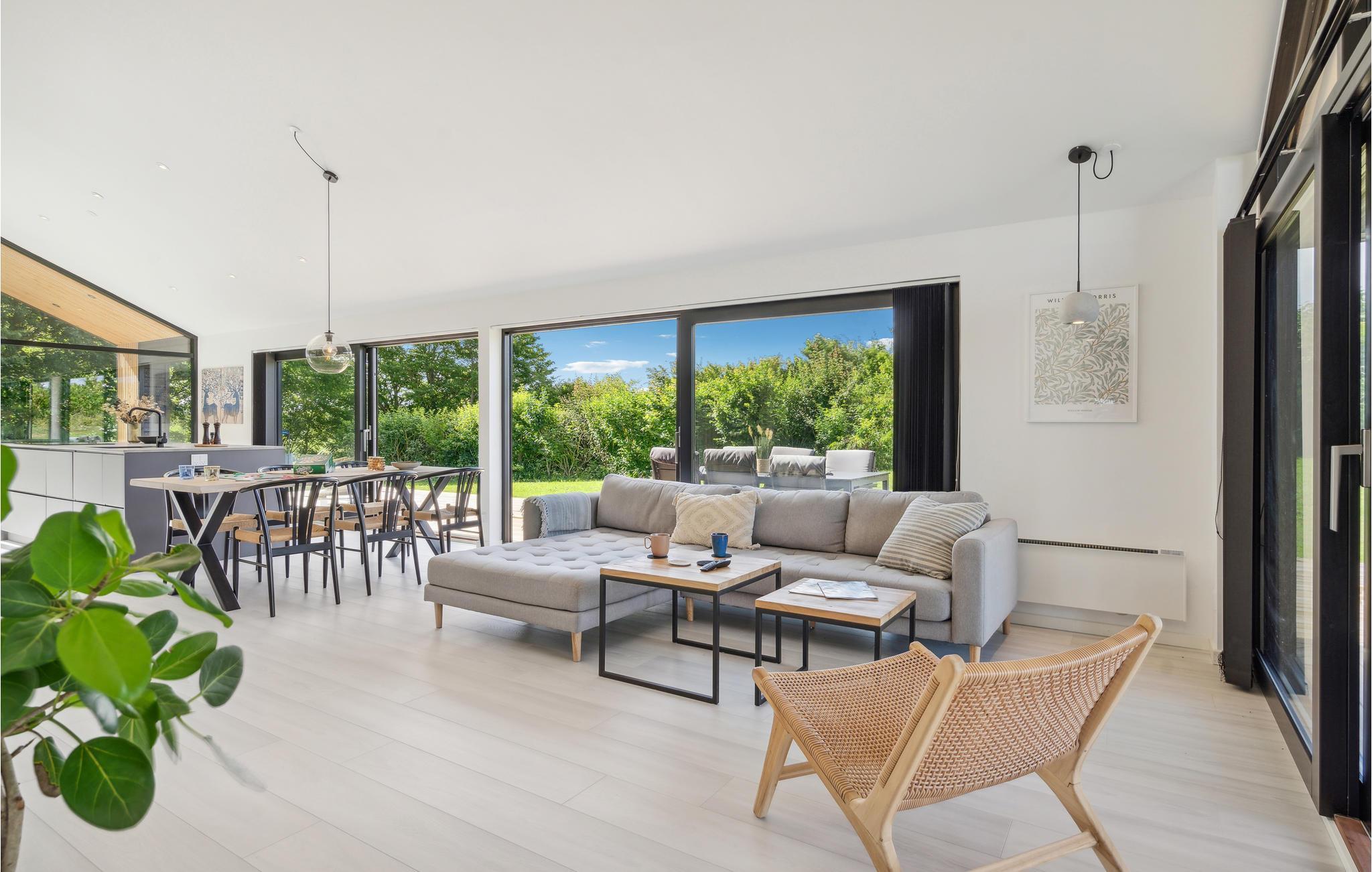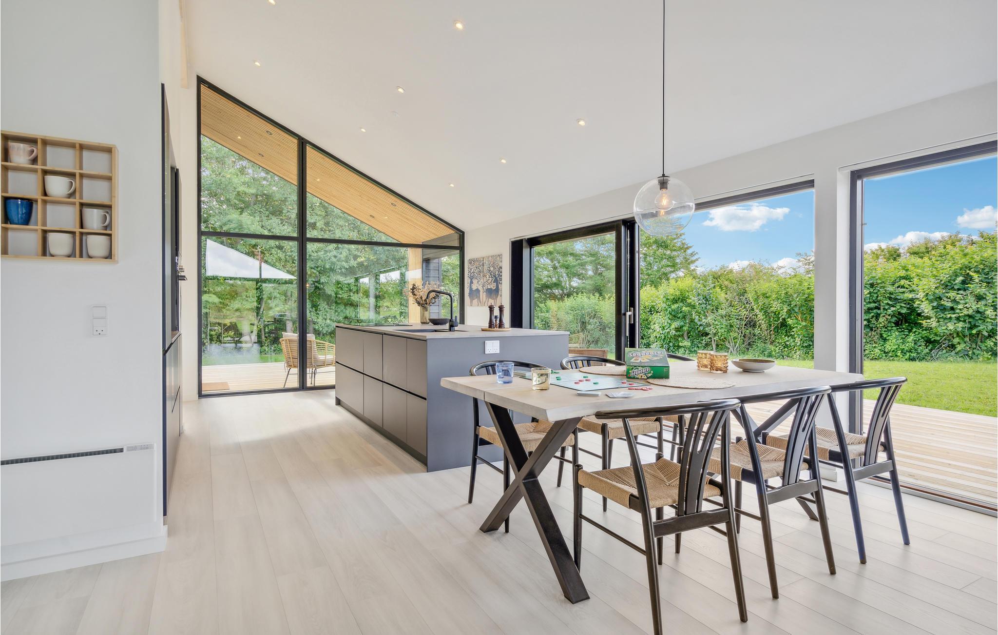 De store sorte vinduesrammer skaber en fantastisk atmosfære i opholdsrummet, hvor I kommer til at tilbringe en god del af jeres ferie. Her sidder man midt i den grønne have i et rum, hvor ude og inde fuldstændig smelter sammen. Hyg jer med madlavningen på køkkenøen, mens I kigger ud på den grønne grund og find senere brætspillene frem, når aftensmaden er overstået. Efter en lang dag på farten kan I fortsætte aftenen i sofaen med popcorn og en god serie i fjernsynet.