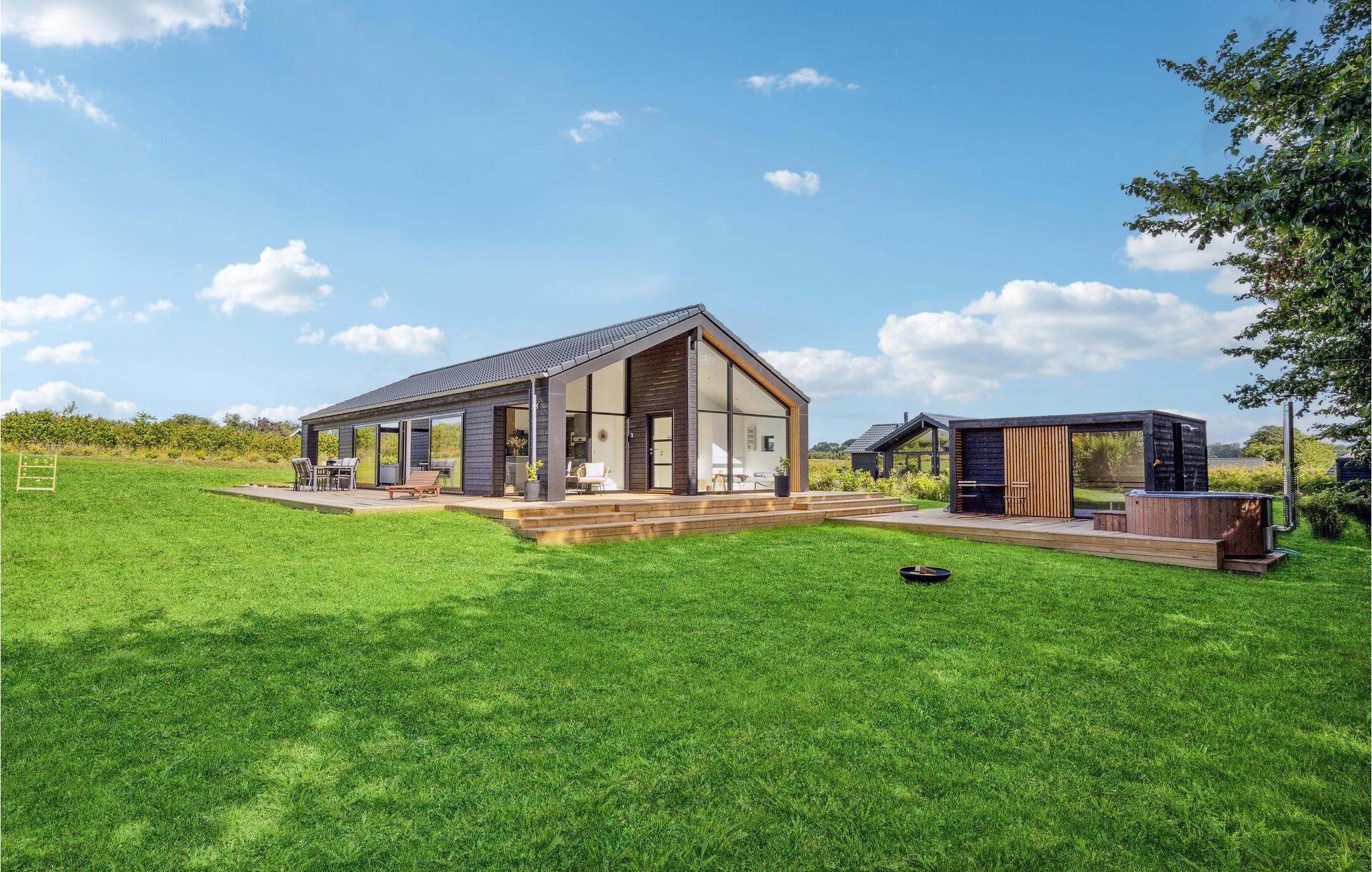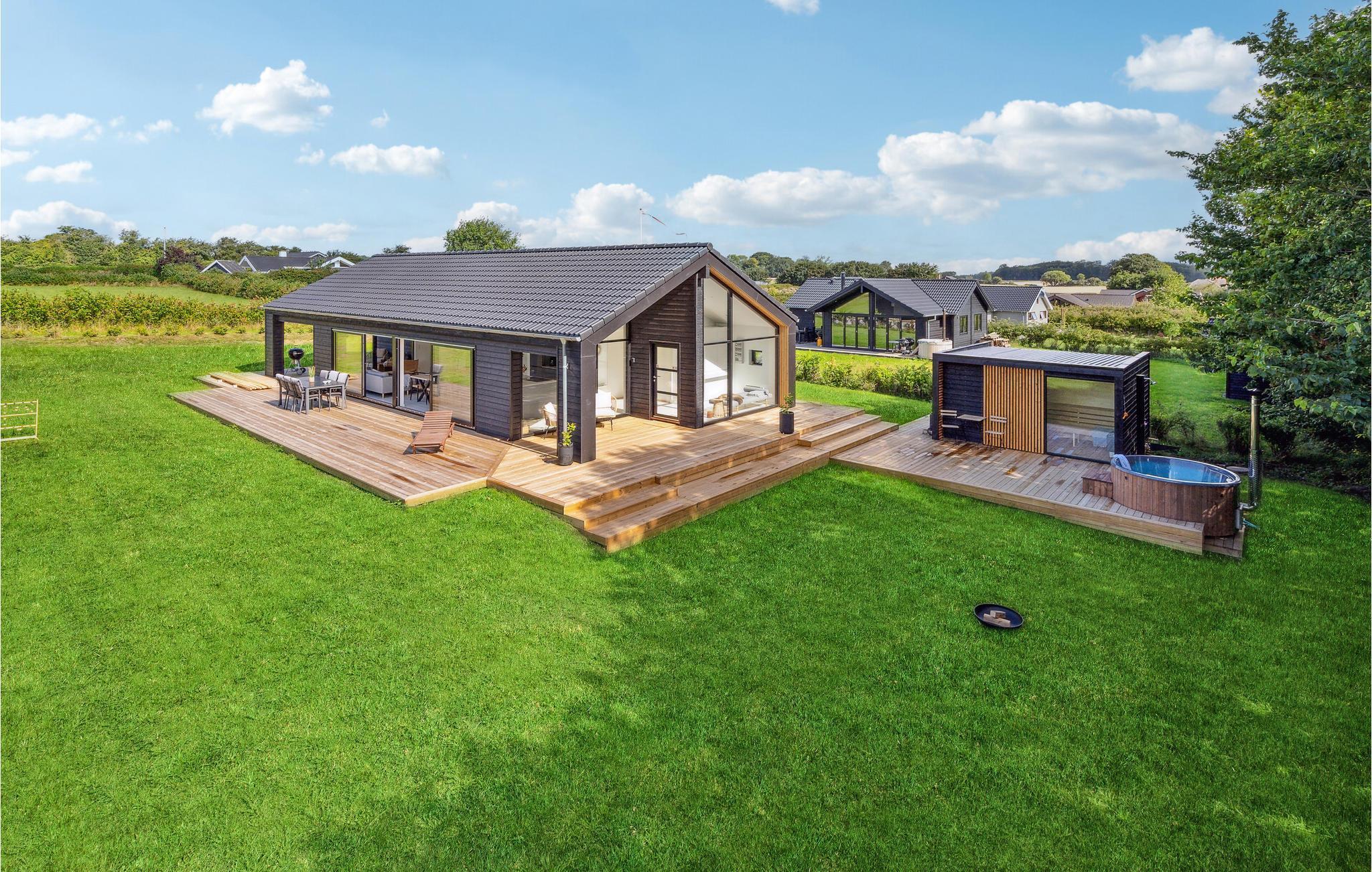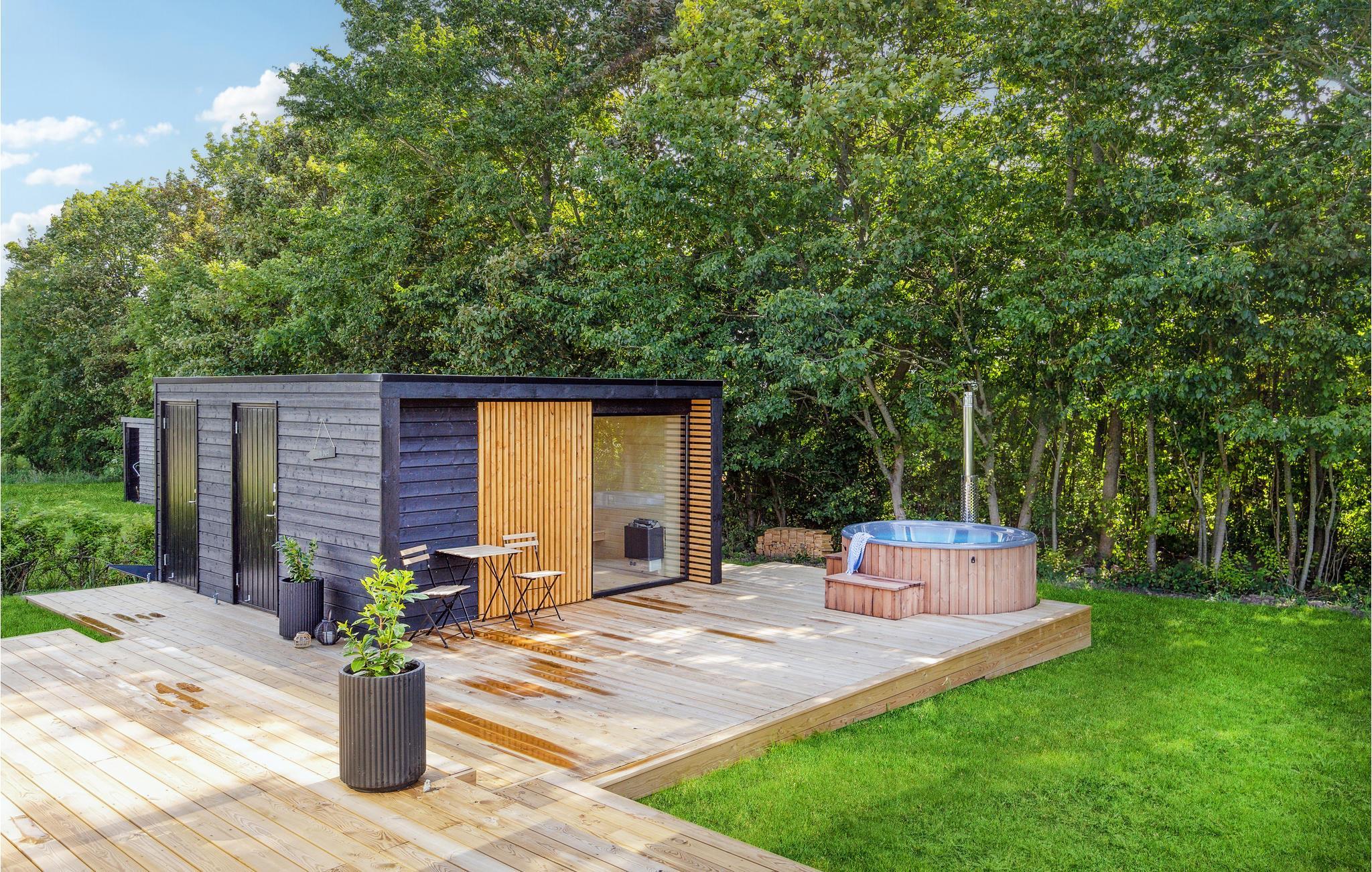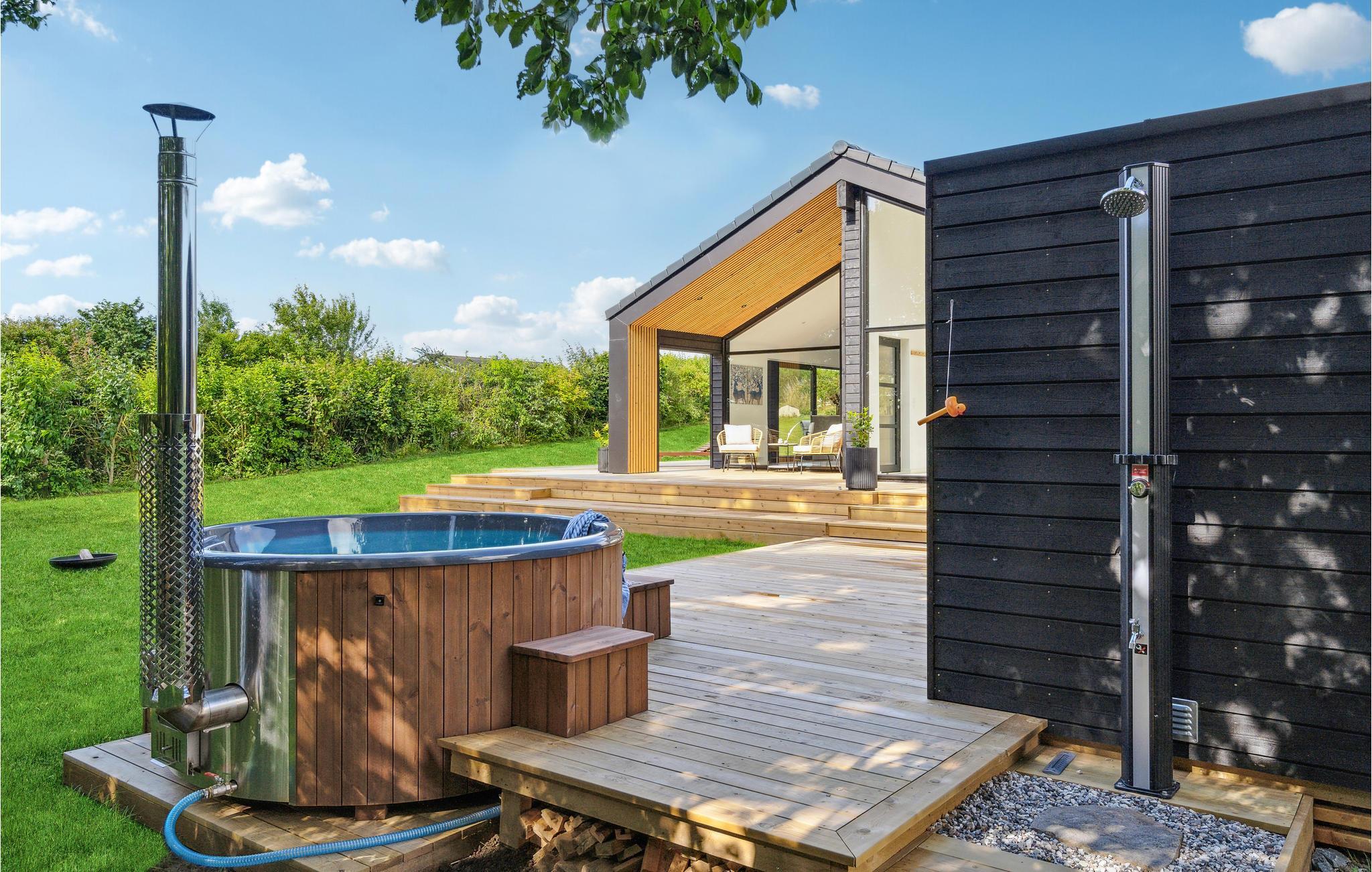 Lækkert sommerhus tæt på Bukkemoses strand med spabad, sauna og vildmarksbad for den perfekte ferie.