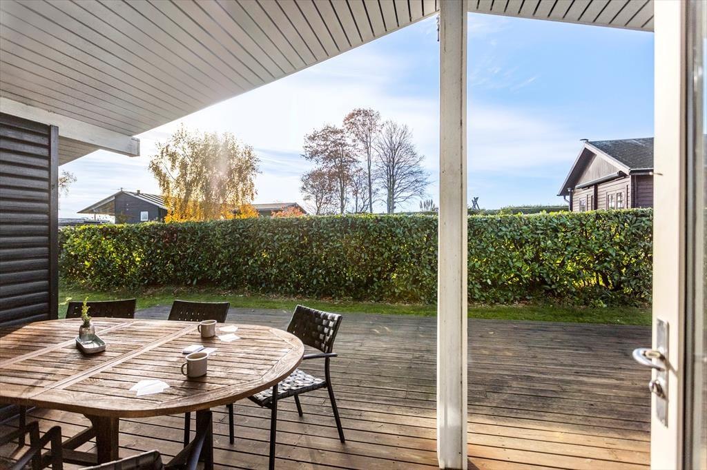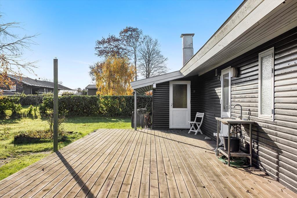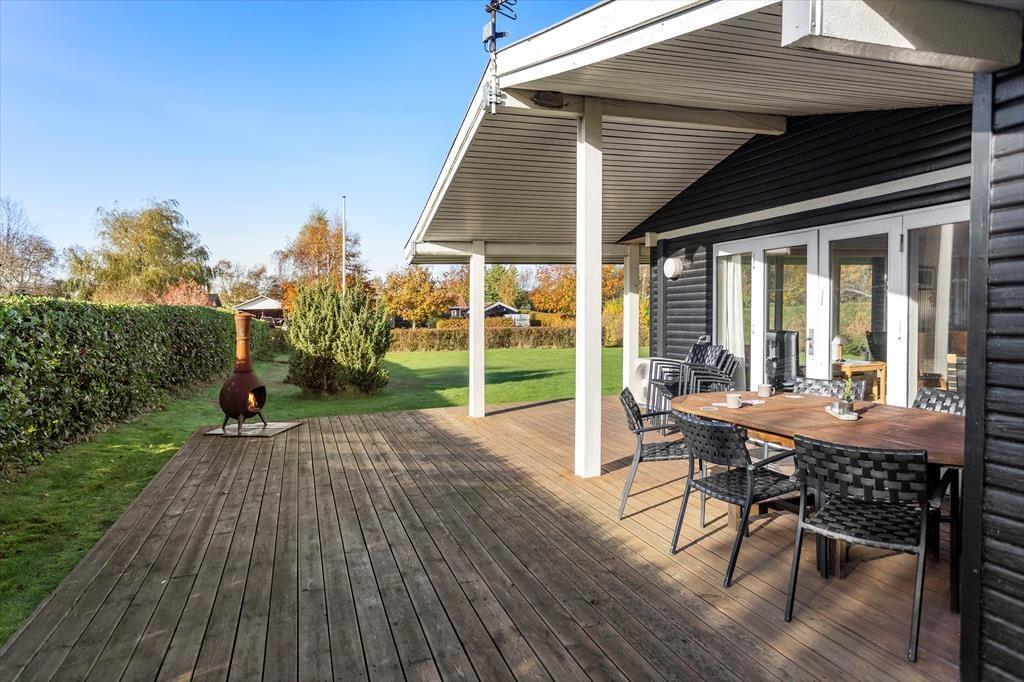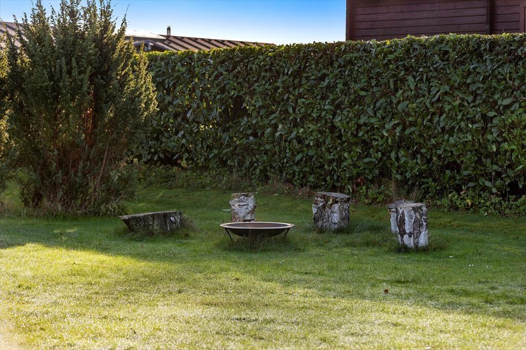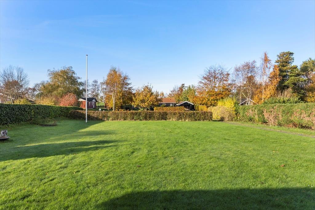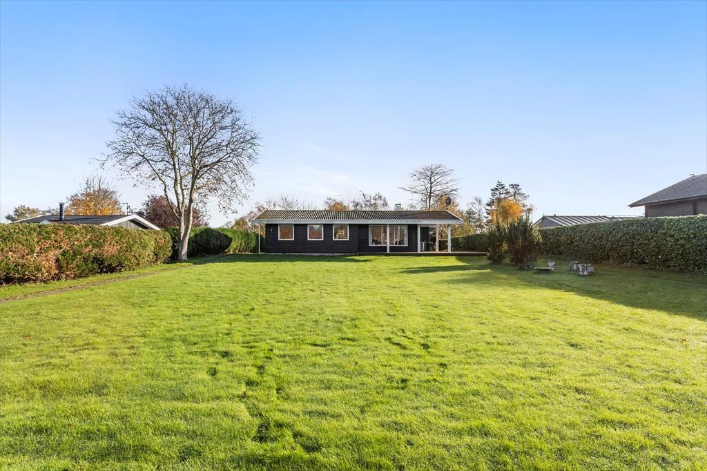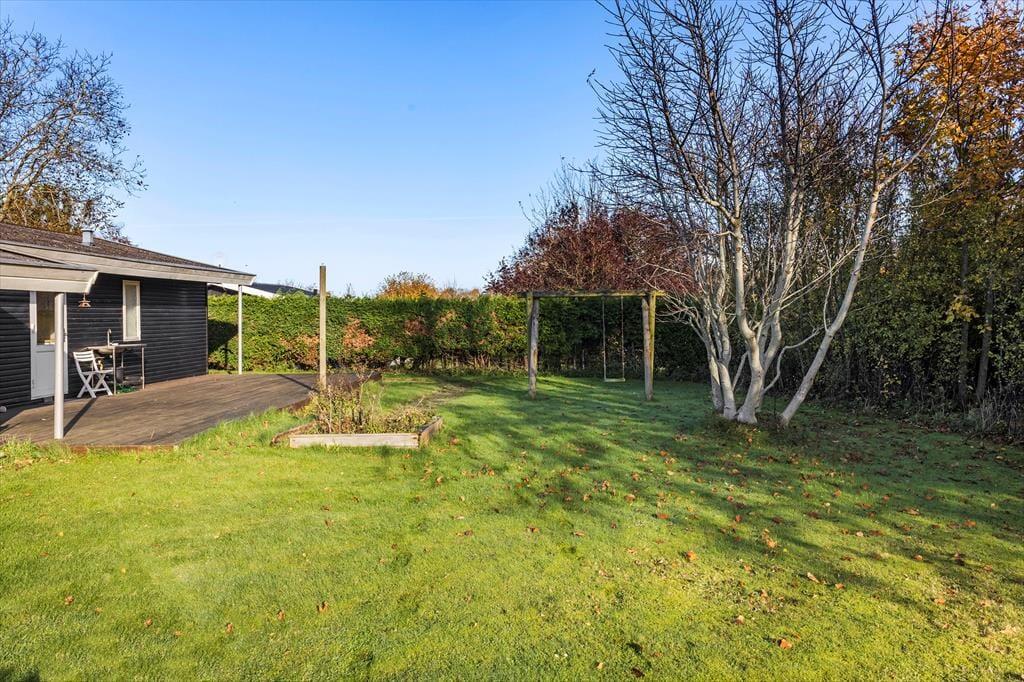 Grunden er stor og grøn med en dejlig have, hvor du kan slappe af i fred og ro. Fra den hyggelige terrasse kan du nyde solen hele dagen, og på køligere dage er det oplagt at tage et tæppe om skuldrene og nyde stilheden med en kop kaffe. Fra haven er der et lille kig til Langelands Golfbane, og området omkring huset summer af natur og liv. Det er et sted, hvor man naturligt sænker tempoet og nyder de små øjeblikke – uanset om det er et spil i haven, en god bog på terrassen eller bare lyden af vinden i træerne.