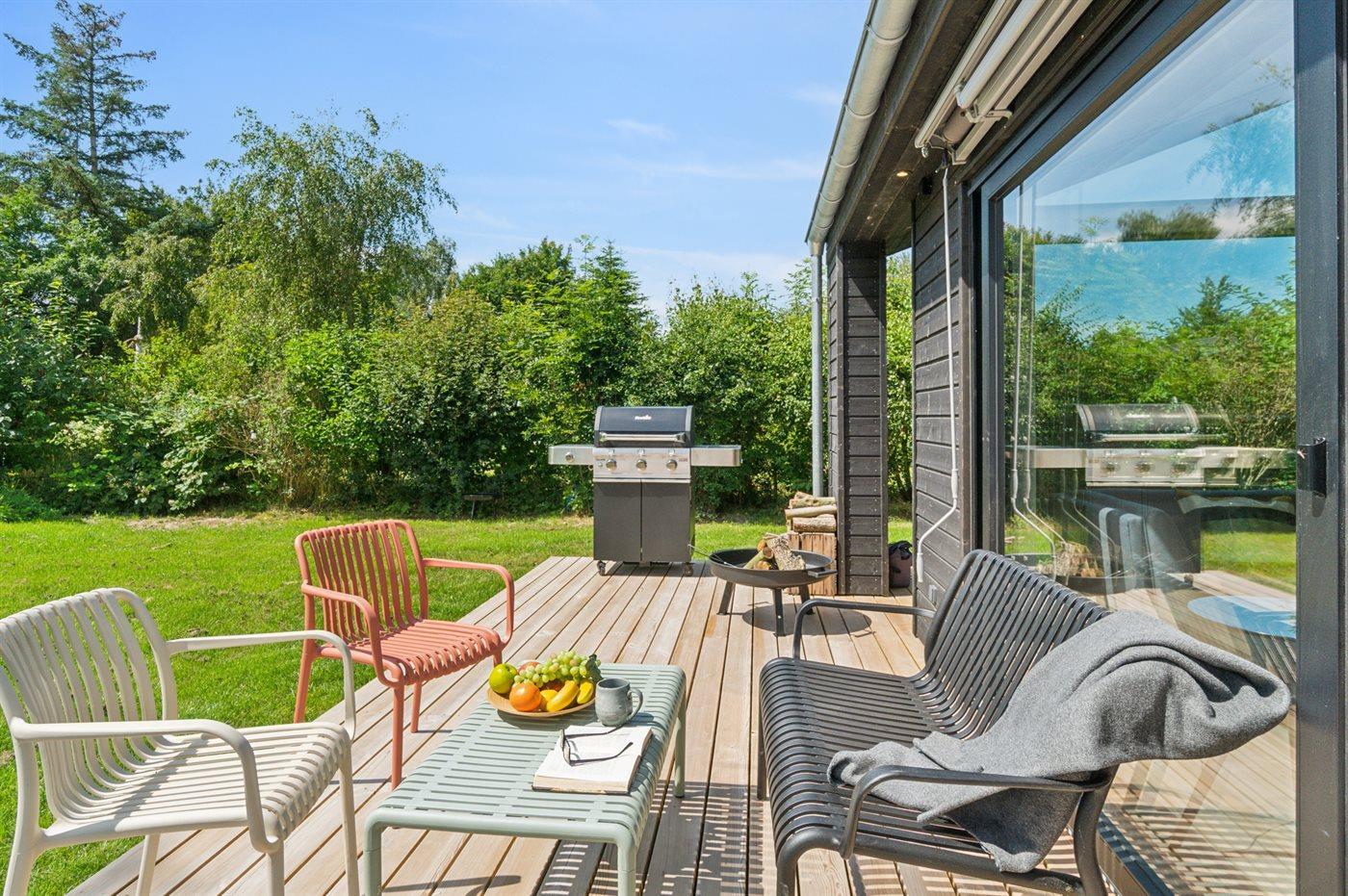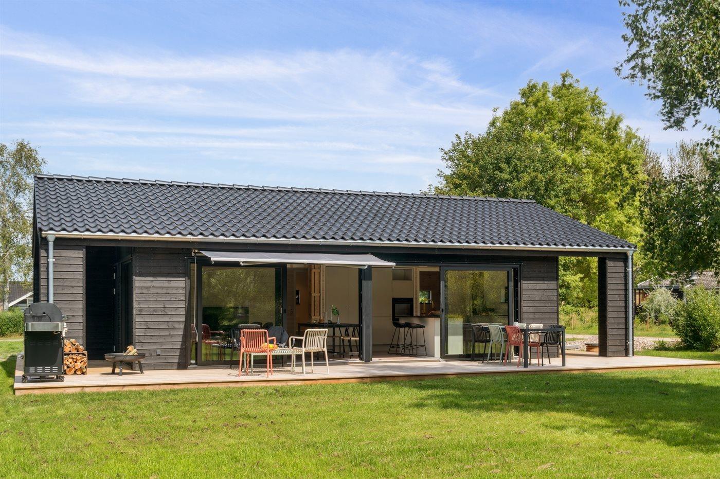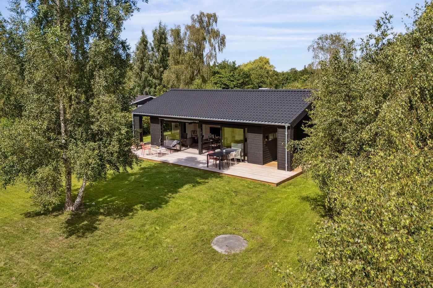 Moderne sommerhus fra 2025 nær Dalby Strand med stor have, overdækket terrasse og kun 450 m til stranden.
