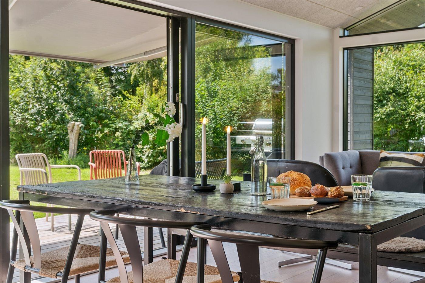I det store lyse fællesrum med køkken, spiseplads og stue ud i ét og på det store terrasseområde er der rig mulighed for hygge og samvær med venner og familie. I hver ende af huset er et dejligt overdækket terrasseområde med mulighed for at finde skygge og læ og, hvor de lange sommeraftener kan nydes.