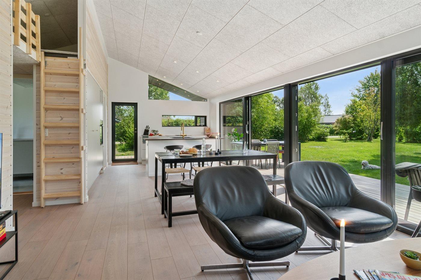 Moderne sommerhus fra 2025 nær Dalby Strand med stor terrasse, bålplads og oplader til elbil.