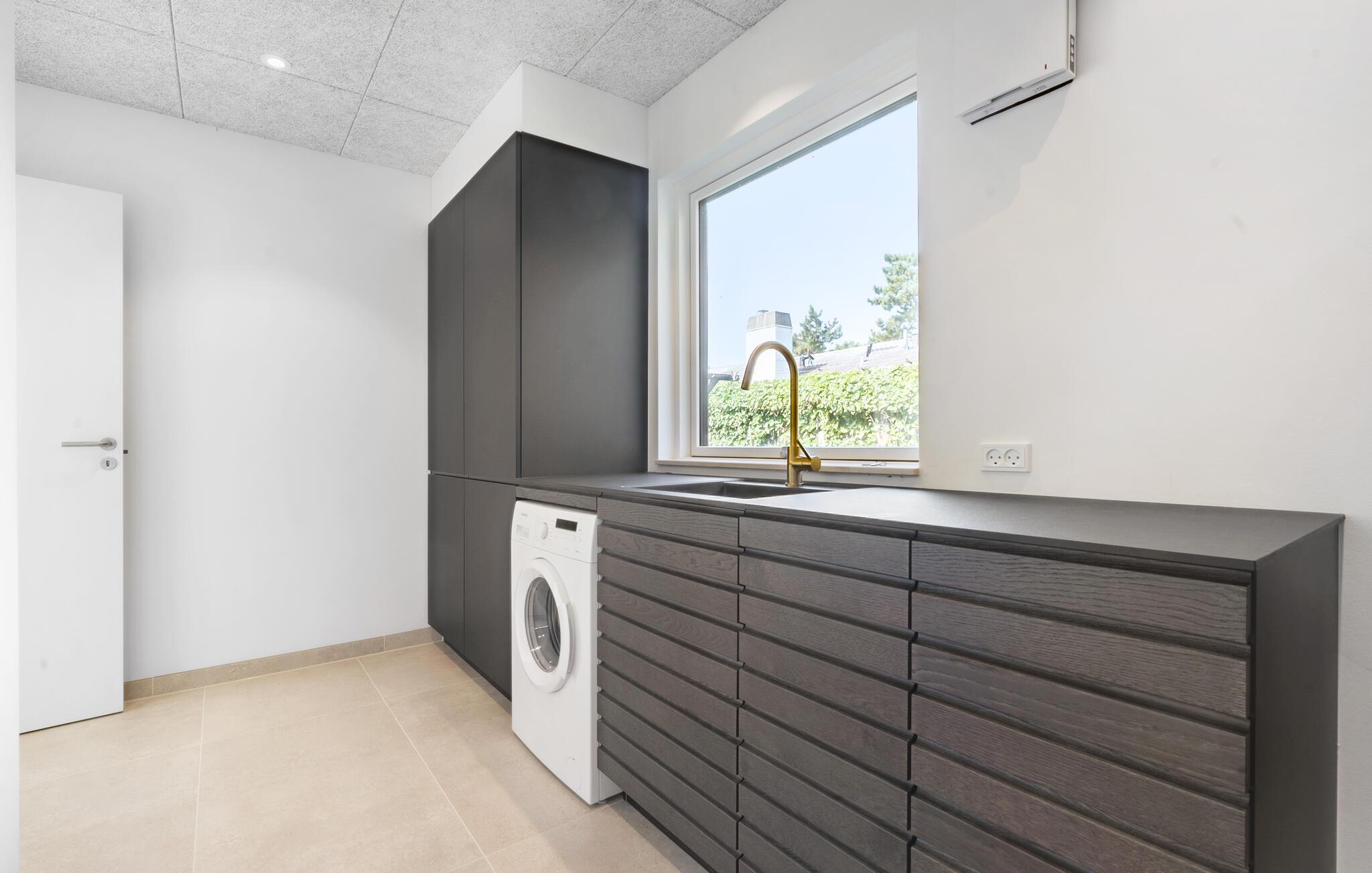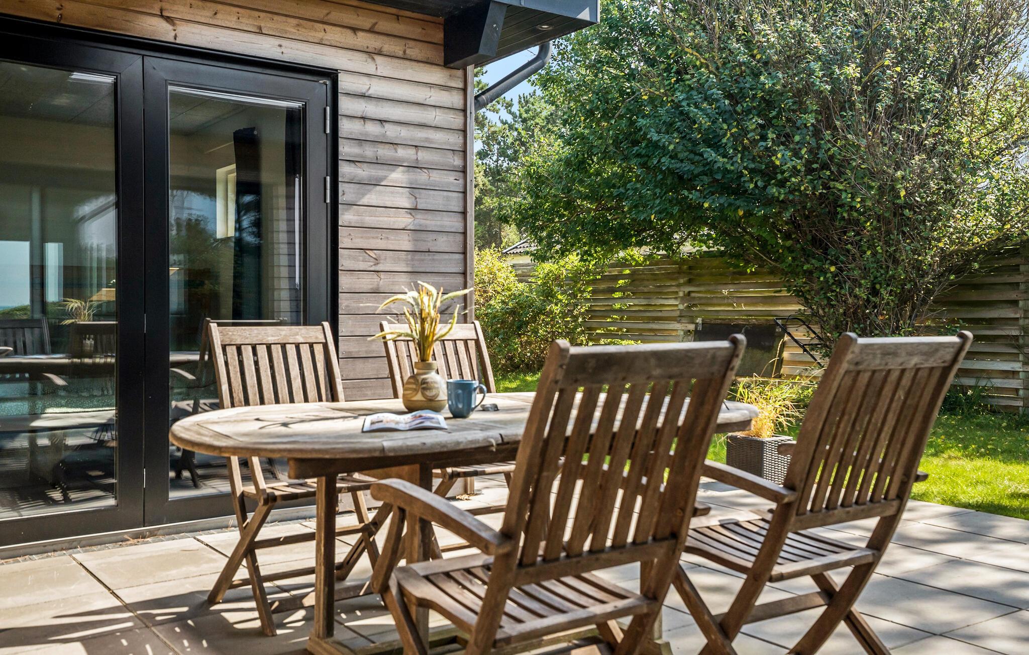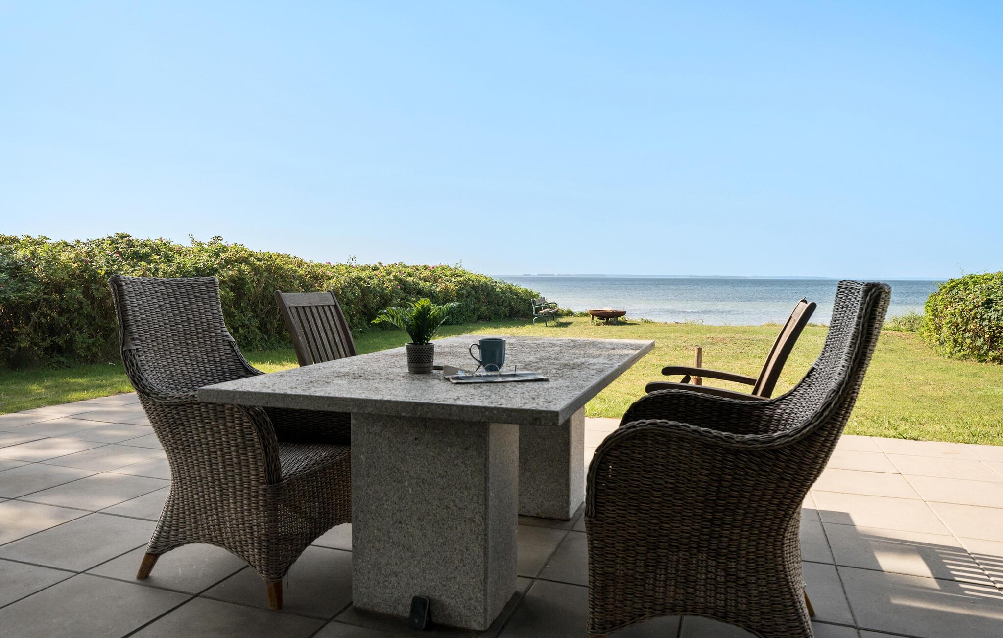Udendørs venter en smukt anlagt privat have, som fører direkte ned til vandet. Snup en frisk dukkert, når I føler for det og skyl derefter sandet af under udebruseren. Der er flere terrasser, så I kan altid finde en plet i solen, når I vil nyde en kop kaffe udendørs. Mens den store grillmiddag gøres klar, kan børnene snuppe et spil fodbold på græsplænen.