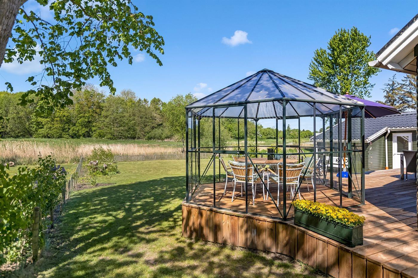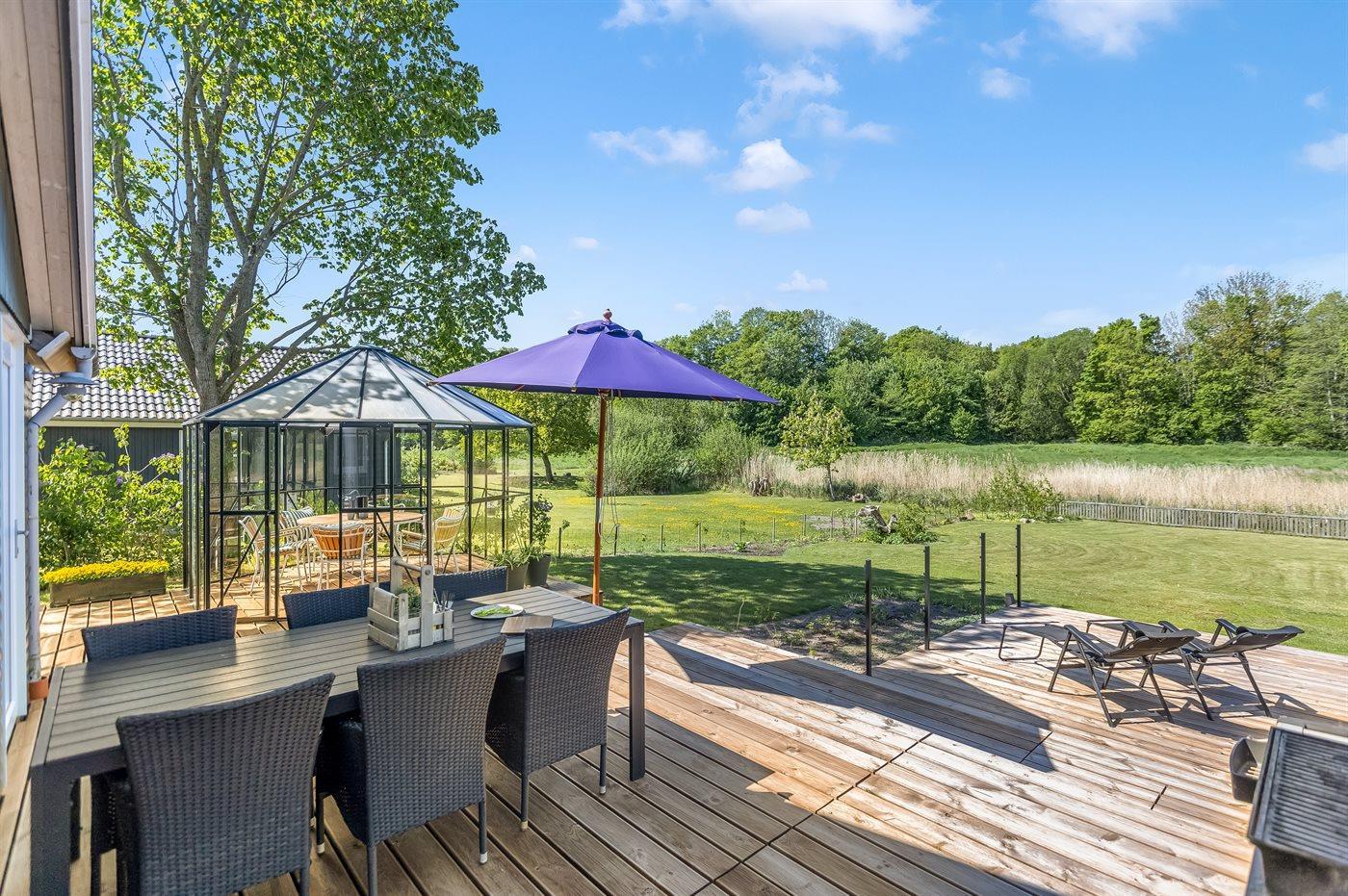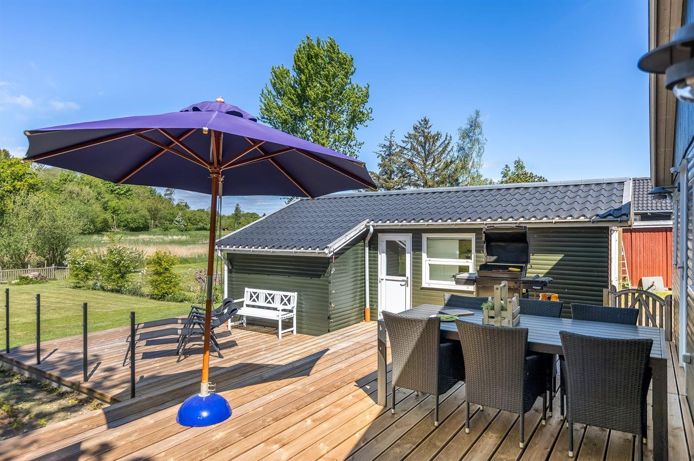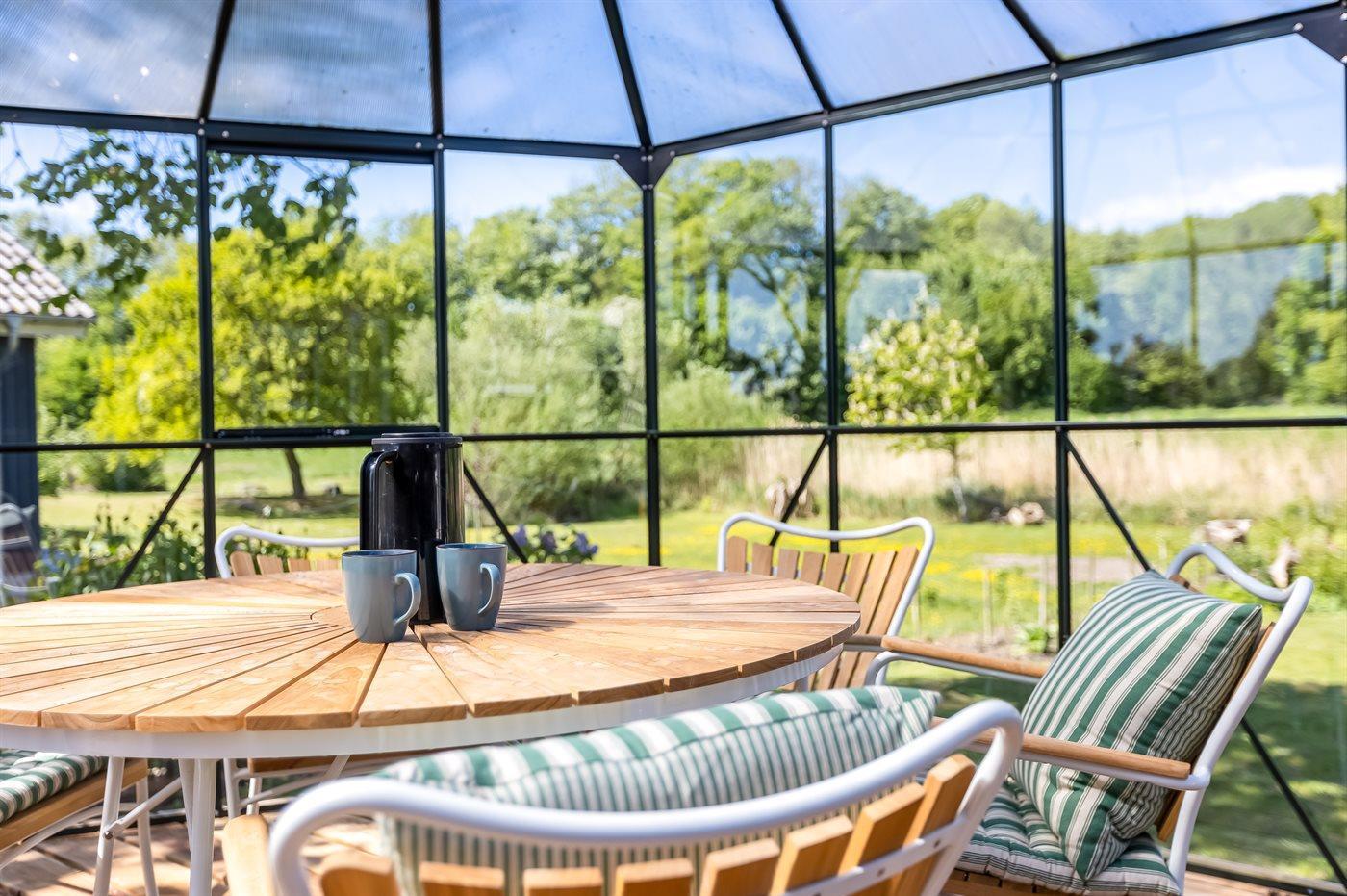 De smukke terrasser, der omgiver huset, ligger i forskellige niveauer og der findes gode siddepladser således du har mulighed for at nyde solen dagen igennem. Til huset hører også en udestue, hvor du kan sidde og slappe af med en god bog, hvis vejret skulle drille – et dejligt opholdssted hele året rundt.