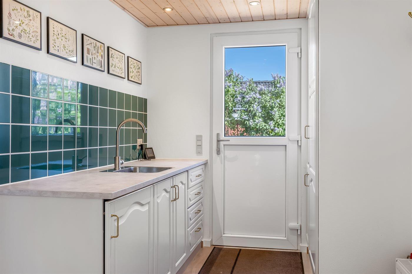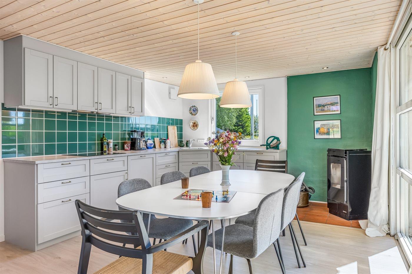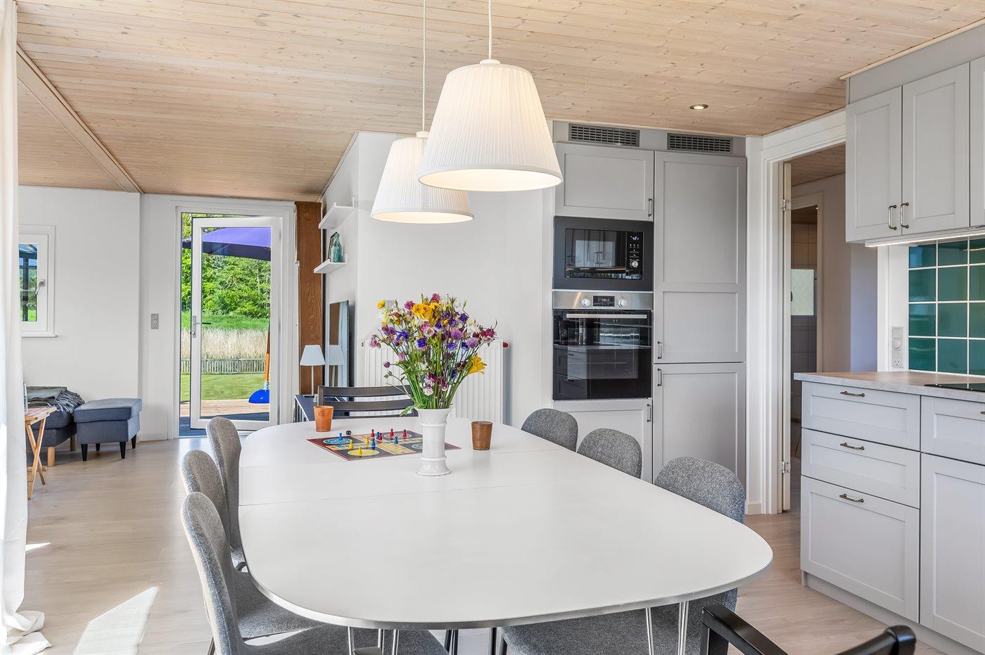 Køkkenet er udstyret med 1 køleskab. Der er 4 induktionskogeplader, varmluftovn, mikrobølgeovn samt opvaskemaskine.