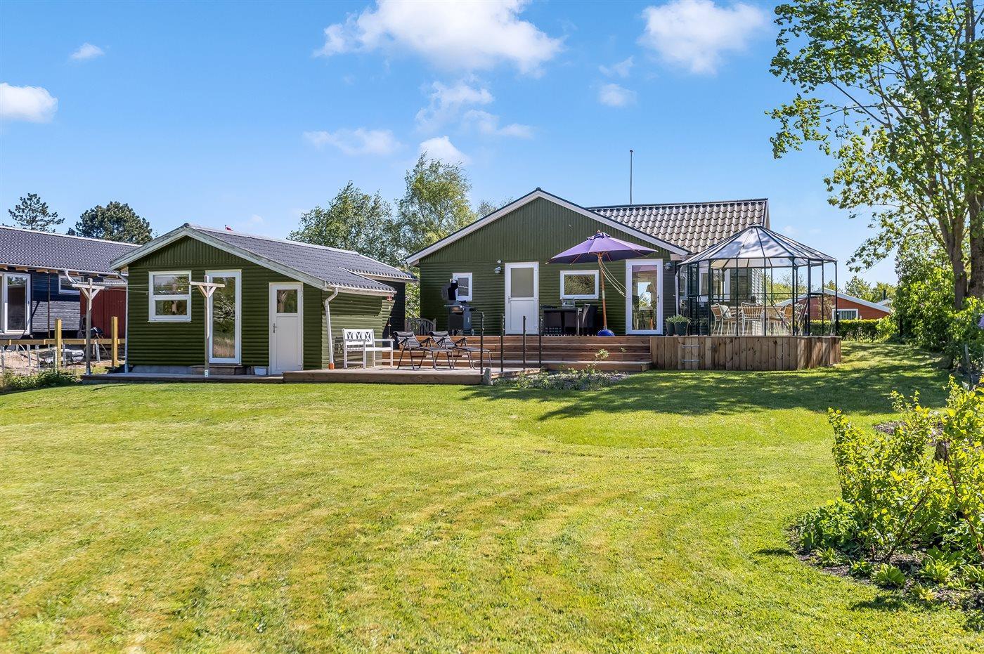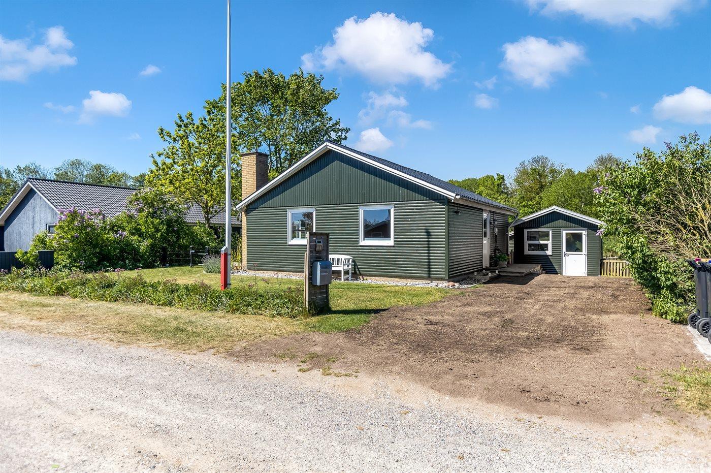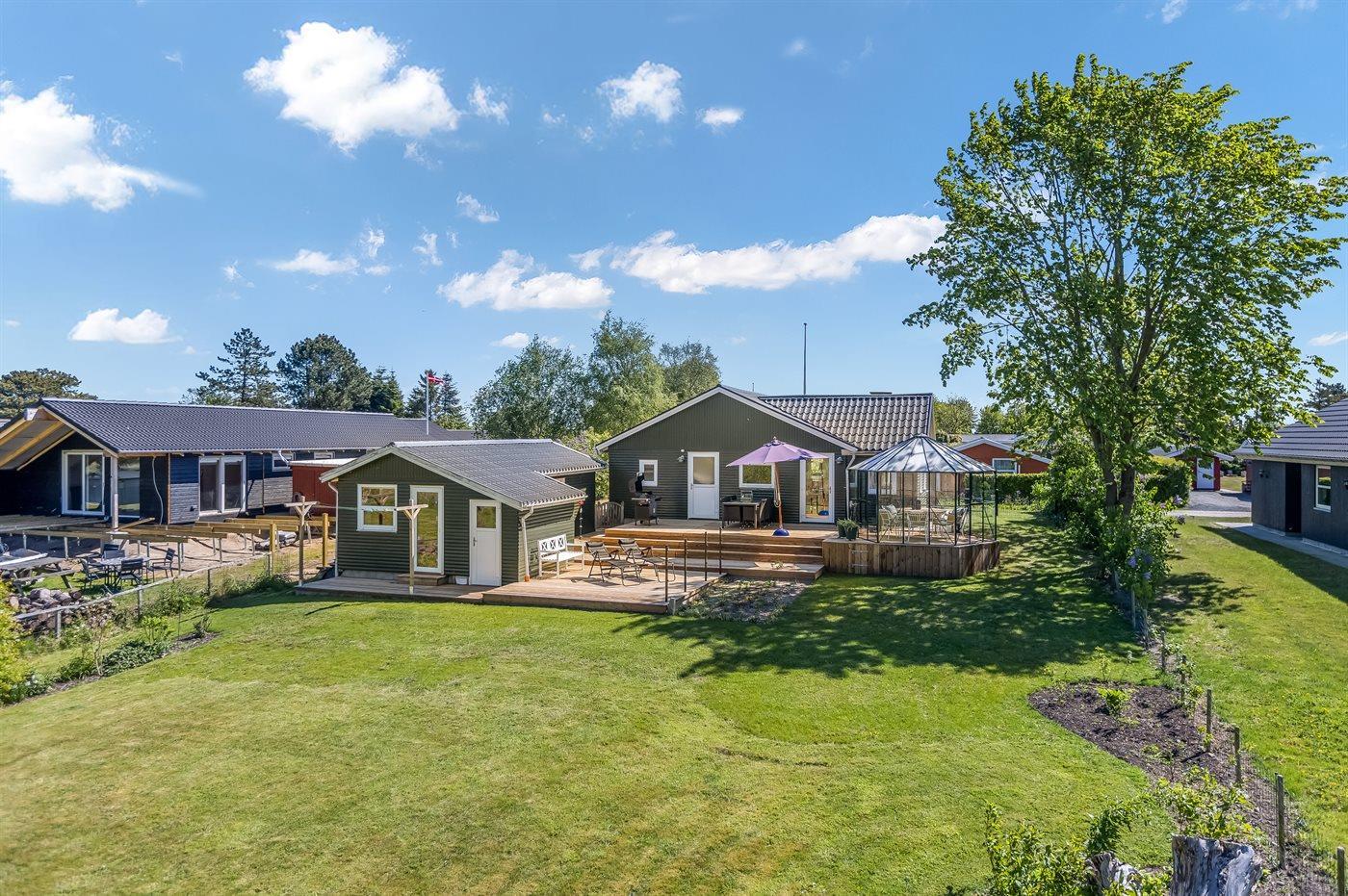 Ferieboligen er beliggende på en 929 m² stor havegrund. Grunden er indhegnet. Der er 500 m til havet. Nærmeste forretning er beliggende i en afstand af 4500 m. Til ferieboligen hører åbent terrasseareal. Ligeledes er der adgang til udestue. Der ligger en legeplads i en afstand af 300 m. Grill til rådighed. Der er installeret stik til opladning af elbil. Type 2 stik. Med 7 kW ladeeffekt. Parkering ved ferieboligen.