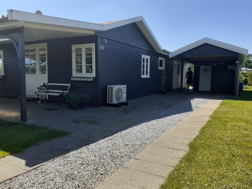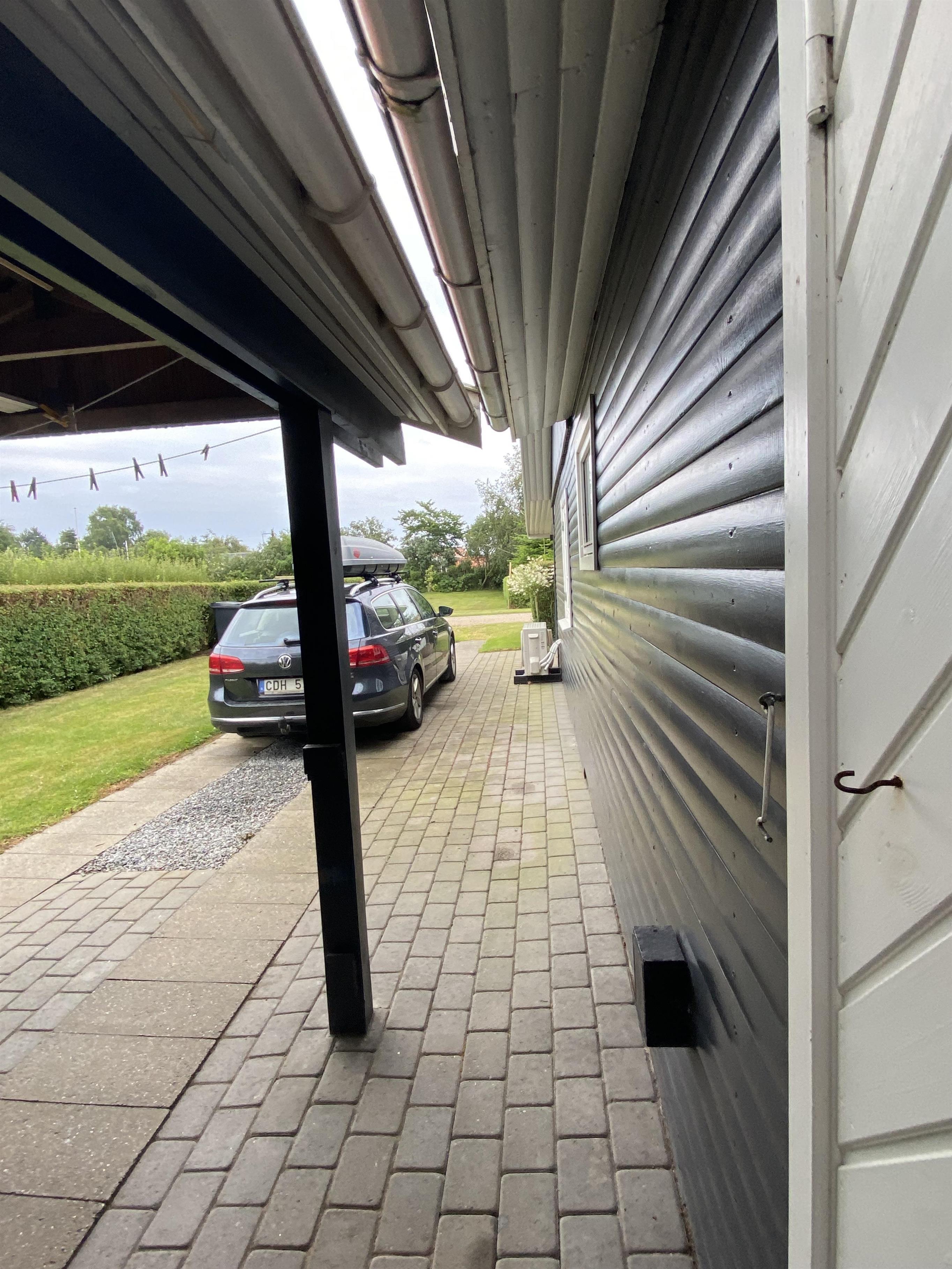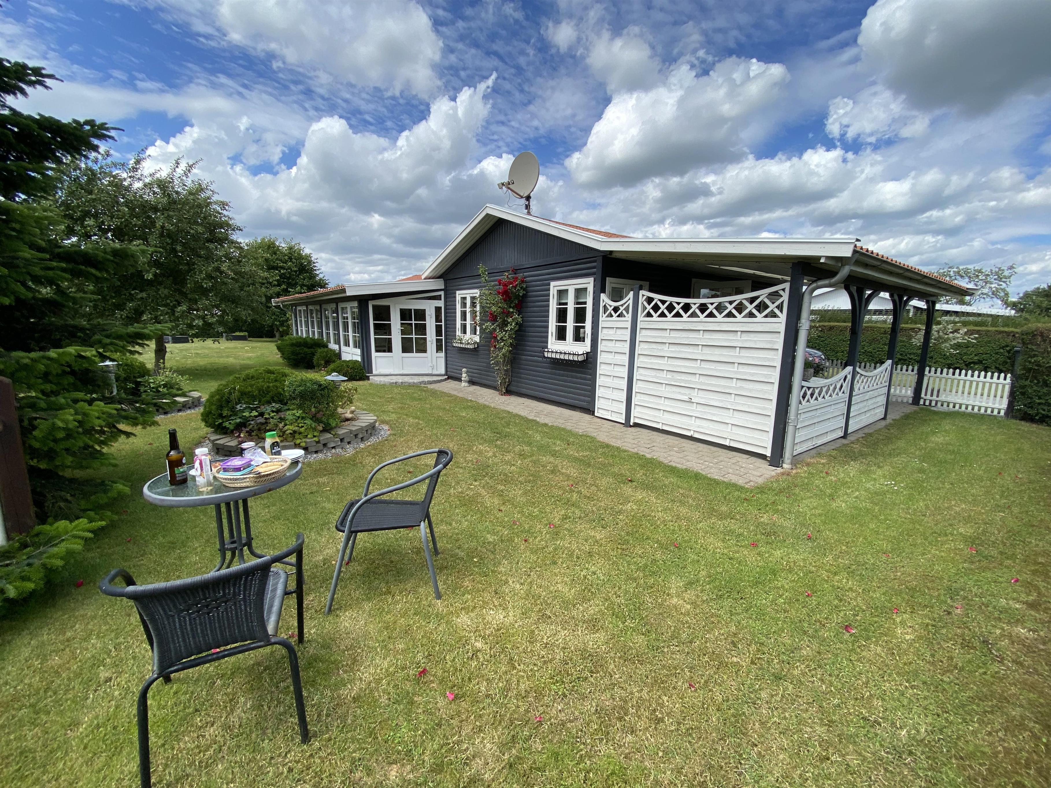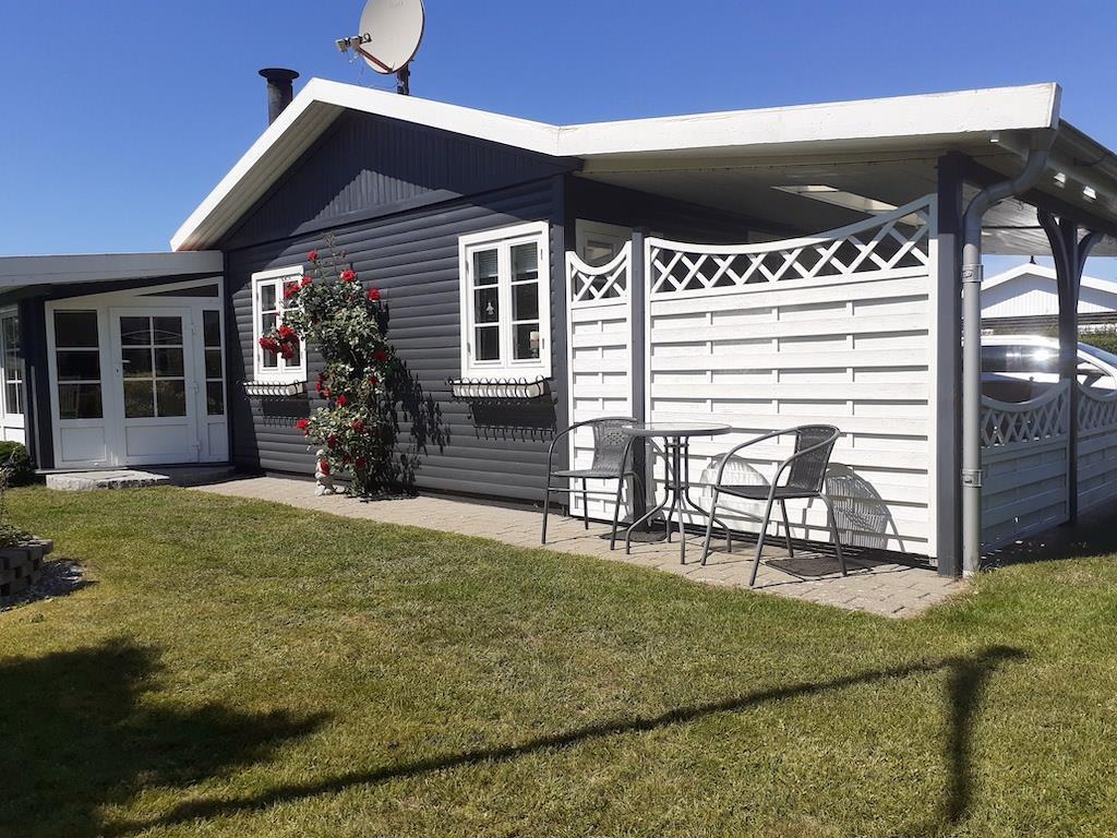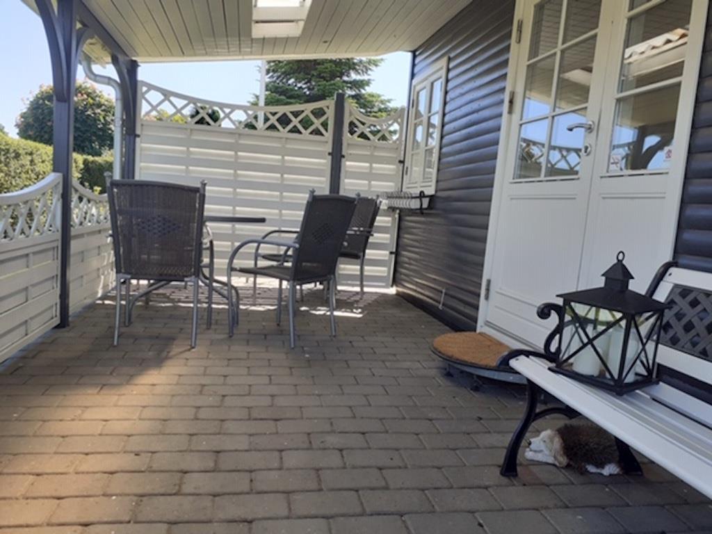 Udenfor er der både en åben og en overdækket terrasse. Der er havemøbler, grill og to liggestole. Der er også p-plads på grunden.