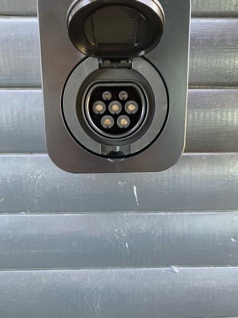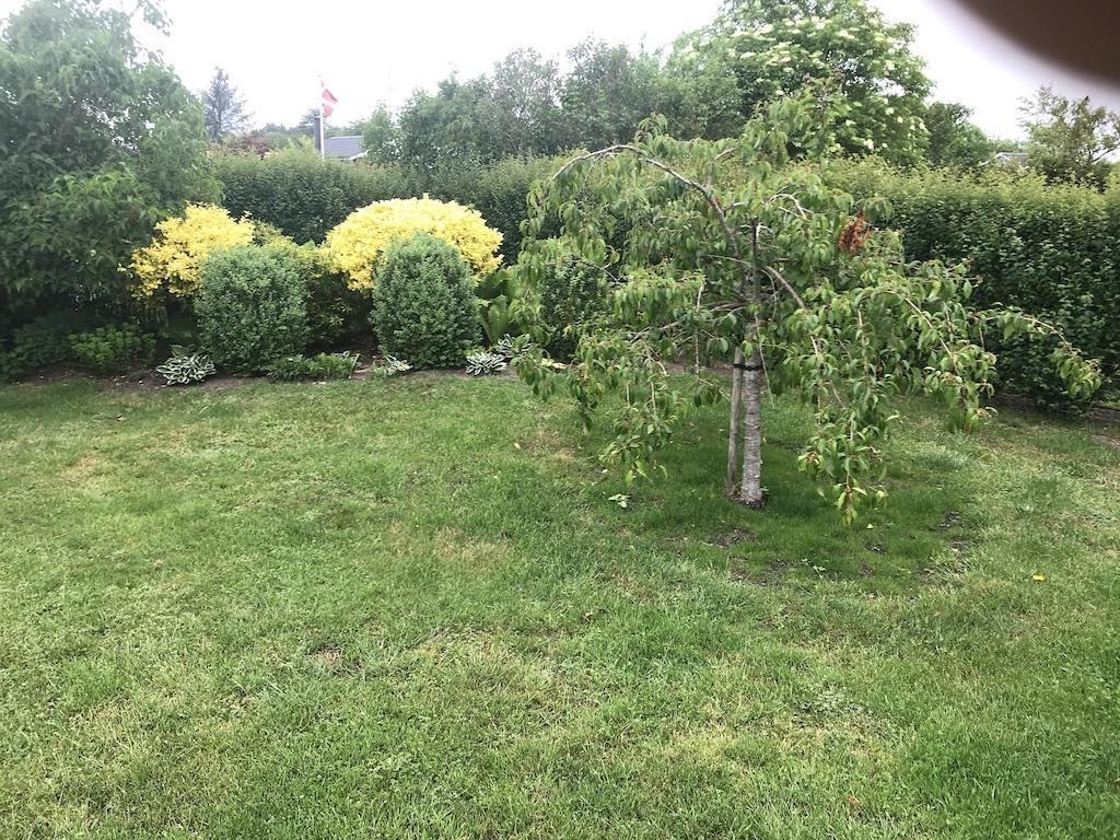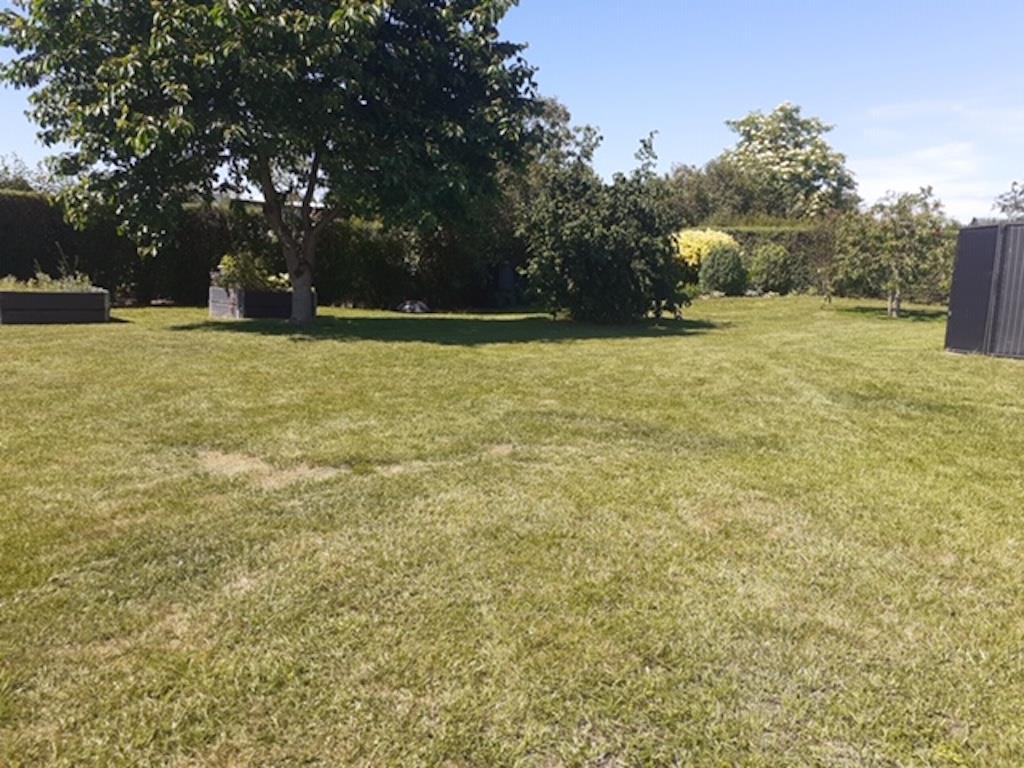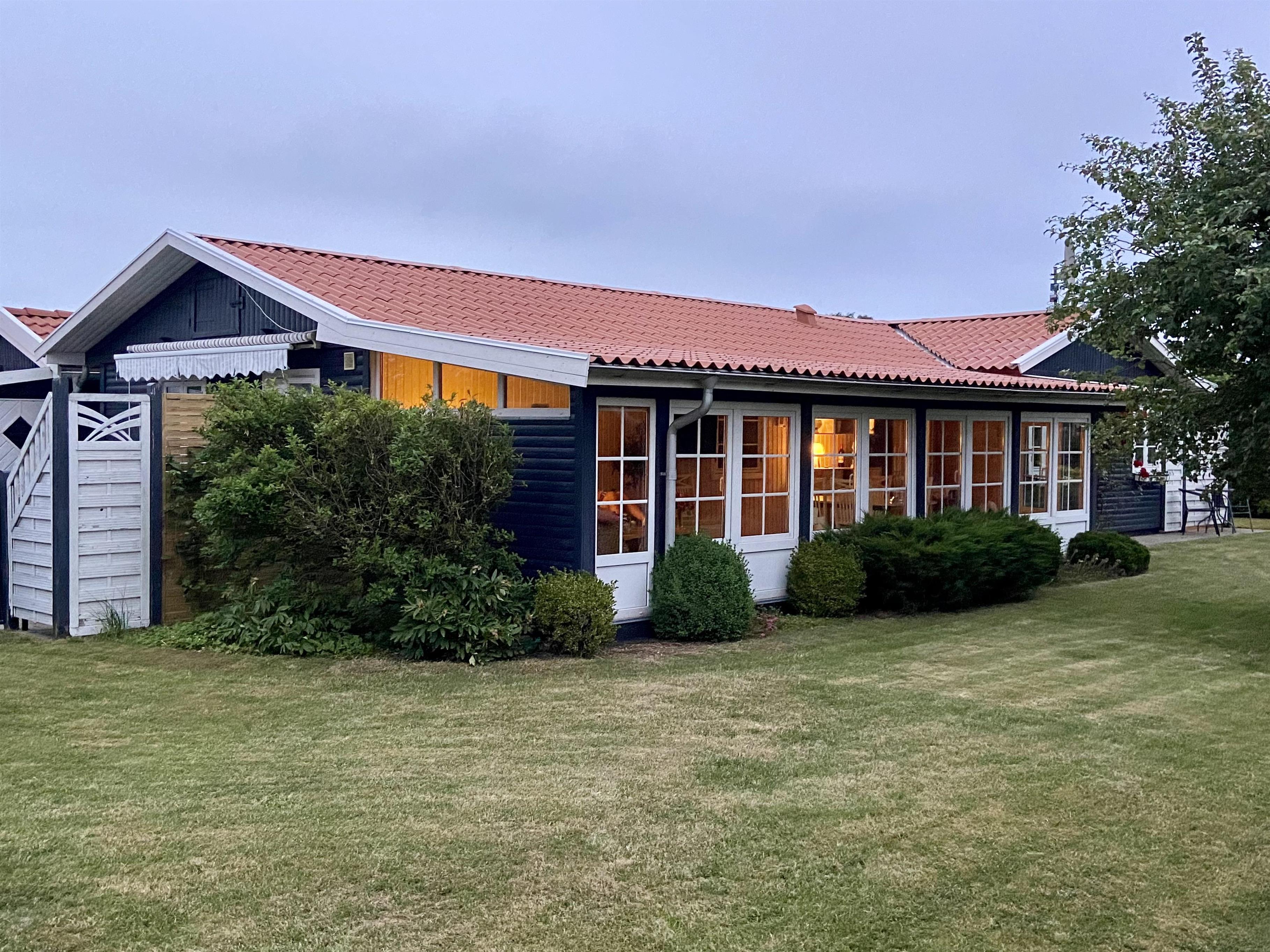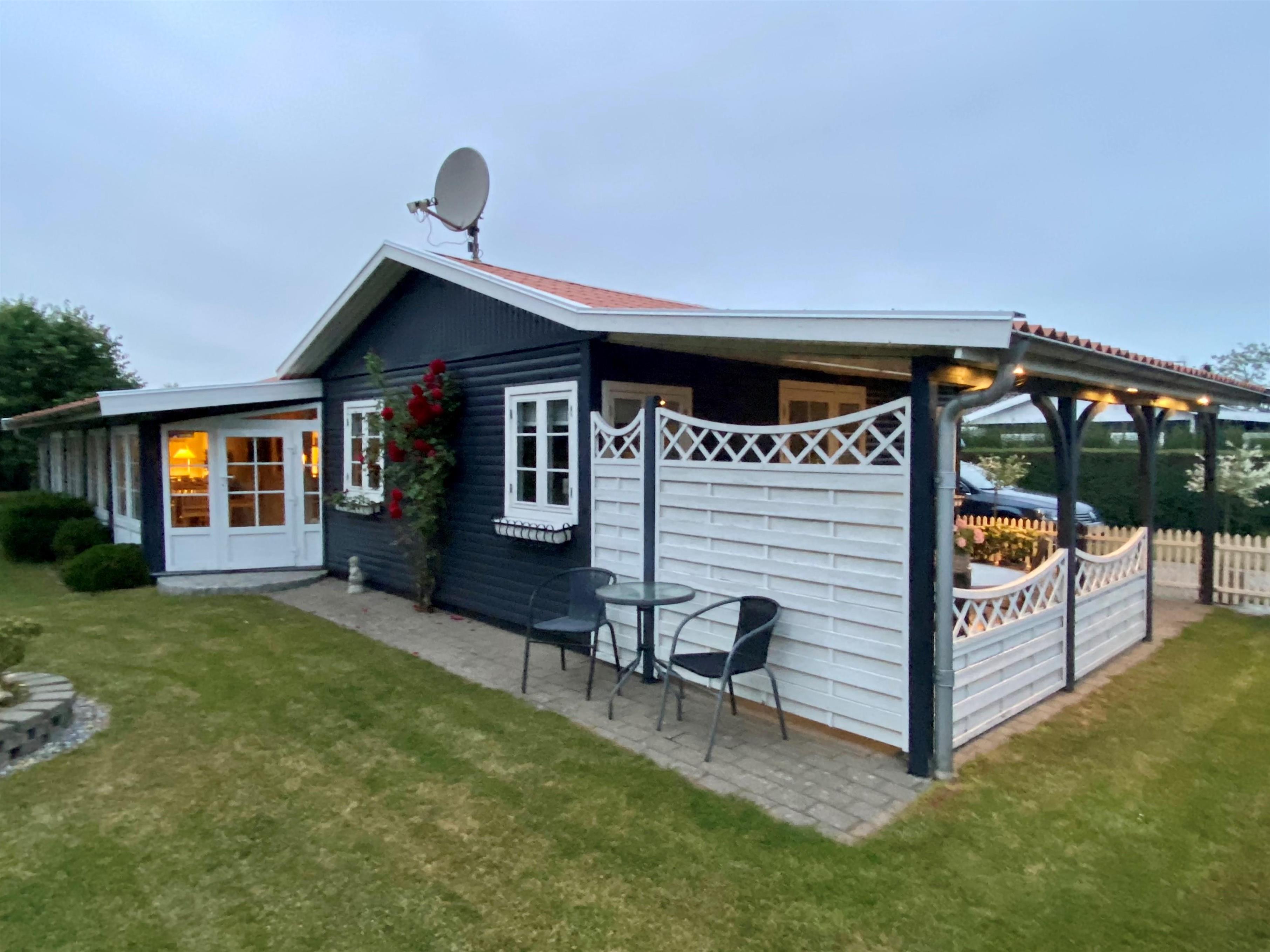 Udenfor er der både en åben og en overdækket terrasse. Der er havemøbler, grill og to liggestole. Der er også p-plads på grunden.