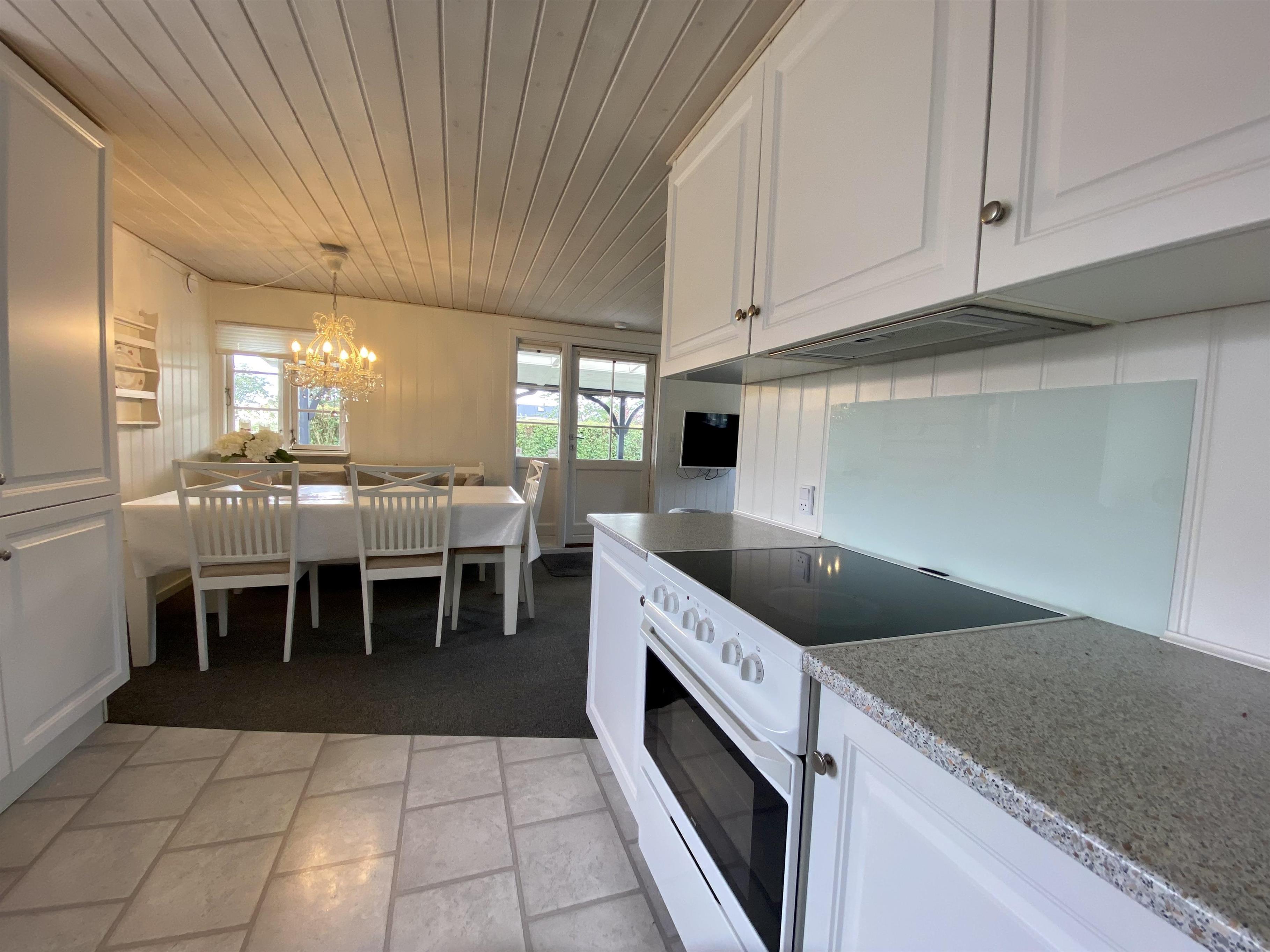 Køkkenet ligger i åben forbindelse med stuen og er indrettet med komfur, køle/fryseskab og opvaskemaskine.
