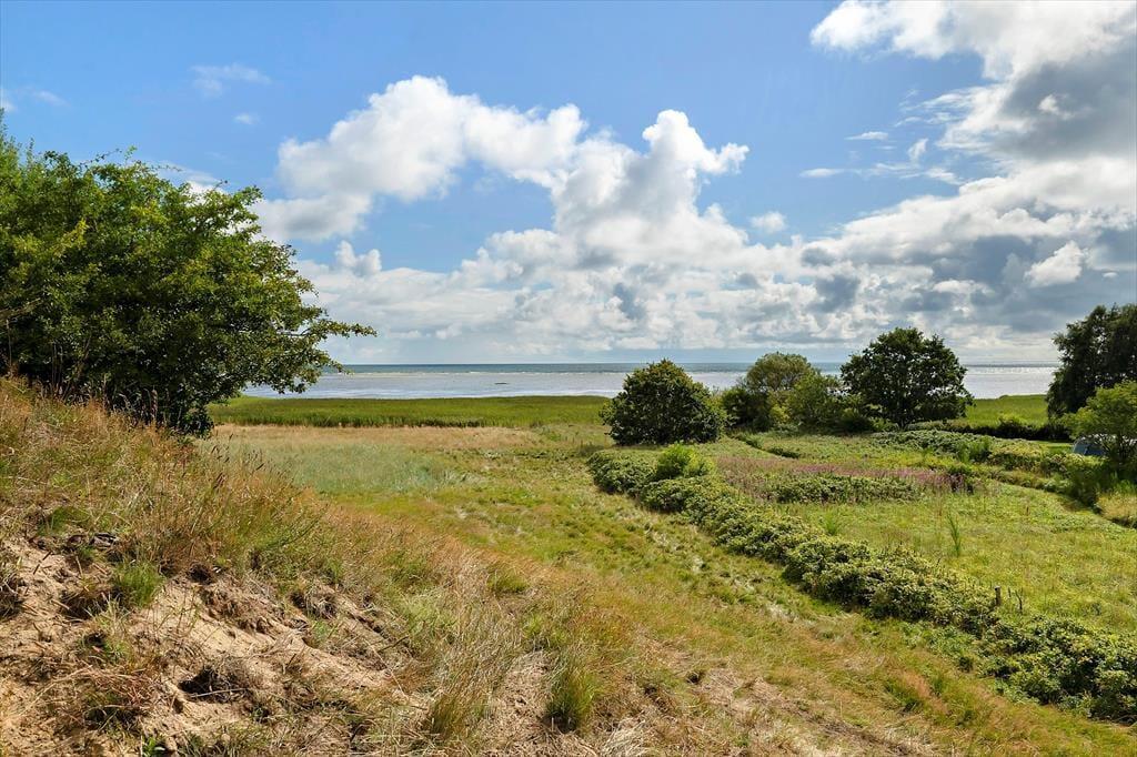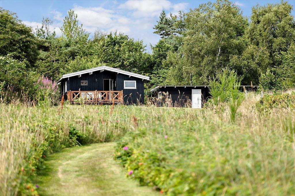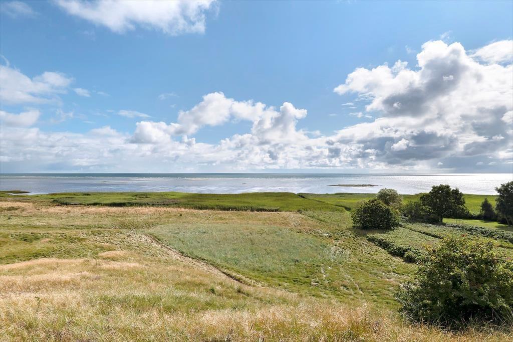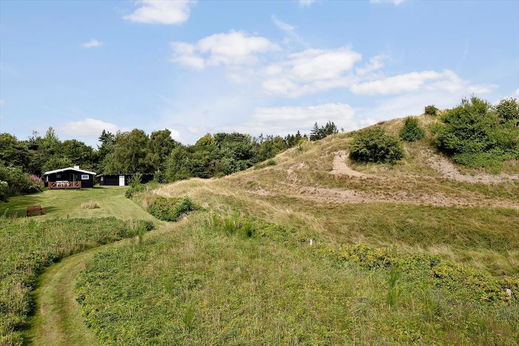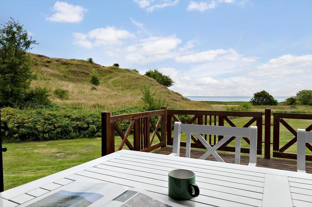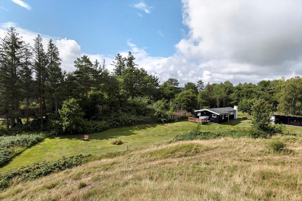 Fra sommerhusets østvendte terrasse har I den fineste udsigt til det bakkede kystlandskab og til Kattegats blå vand. Terrasseområdet ligger en smule hævet og er delvist overdækket, og syd for huset ligger endnu en skøn terrasse, hvor I kan sole jer og nyde den naturskønne ro. Grunden er stor, så I har masser af plads til at boltre jer, og hvis det ikke rækker, er I naboer til den frie natur.