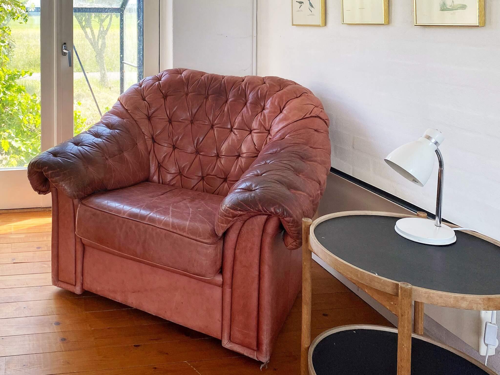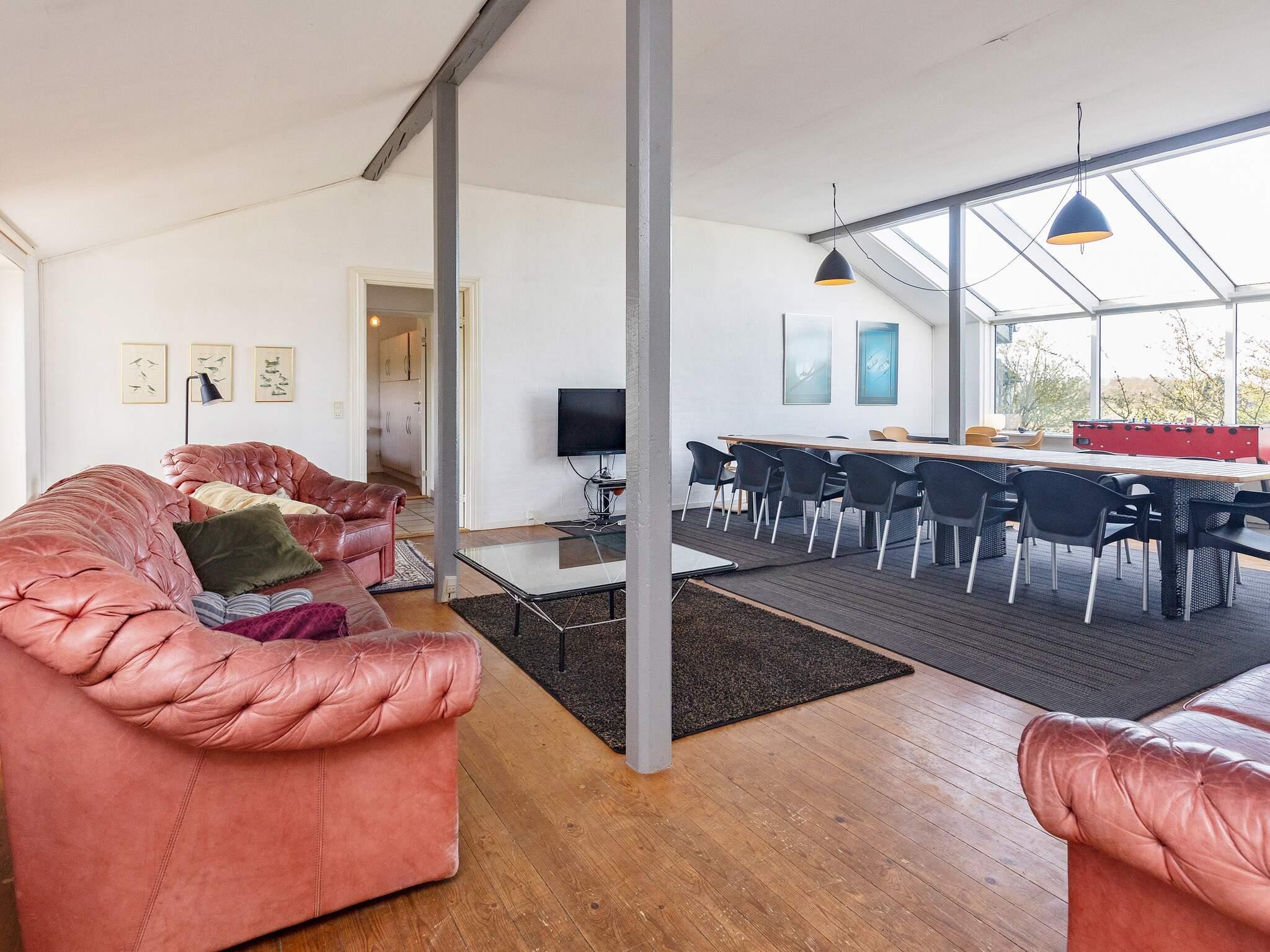Slap af i sommerhusets opholdsrum, som er åbent til kip og har pejs, stort vinduesparti og ovenlys.