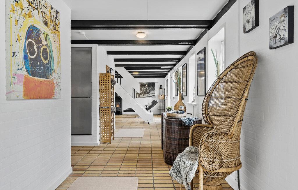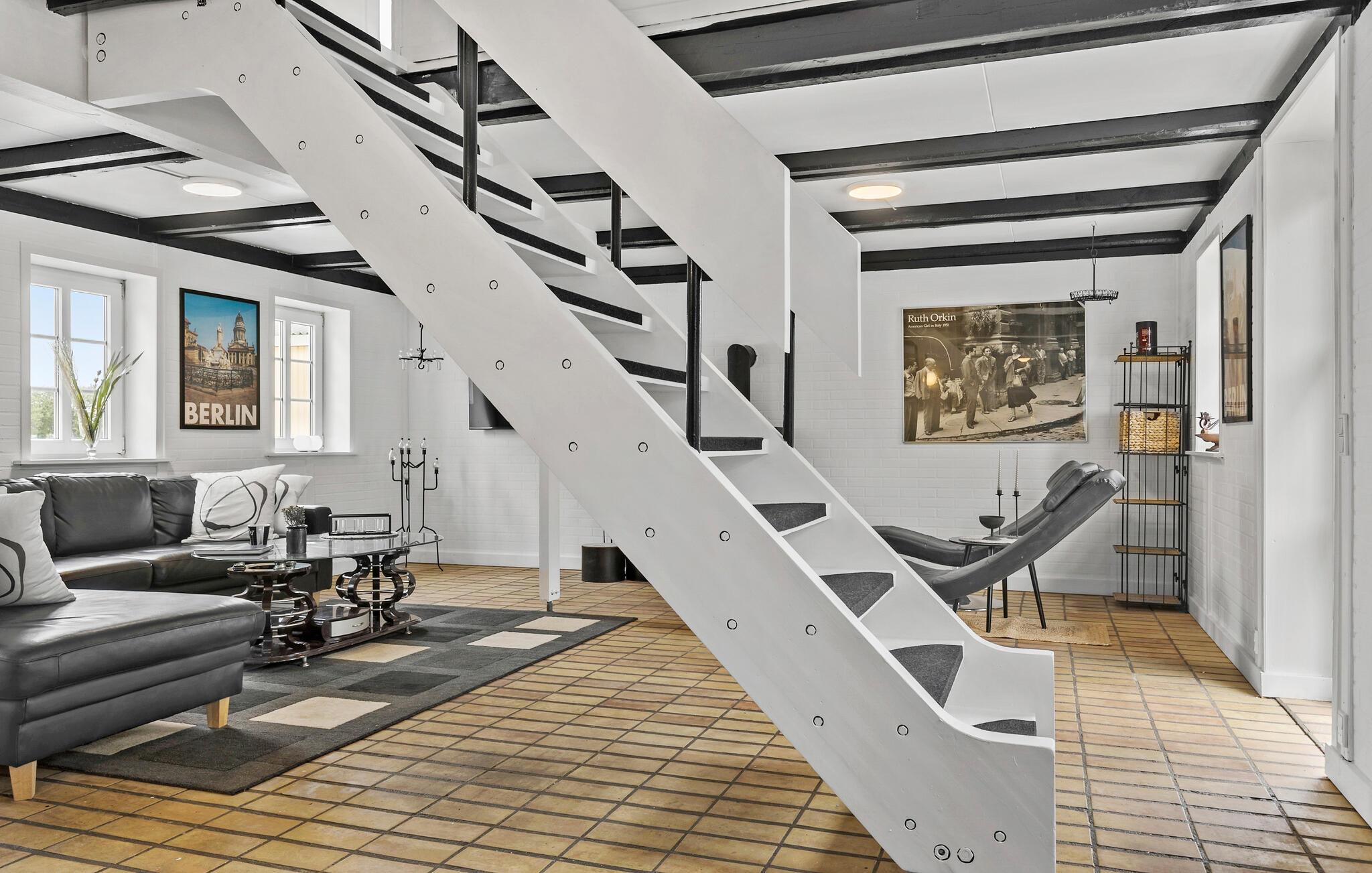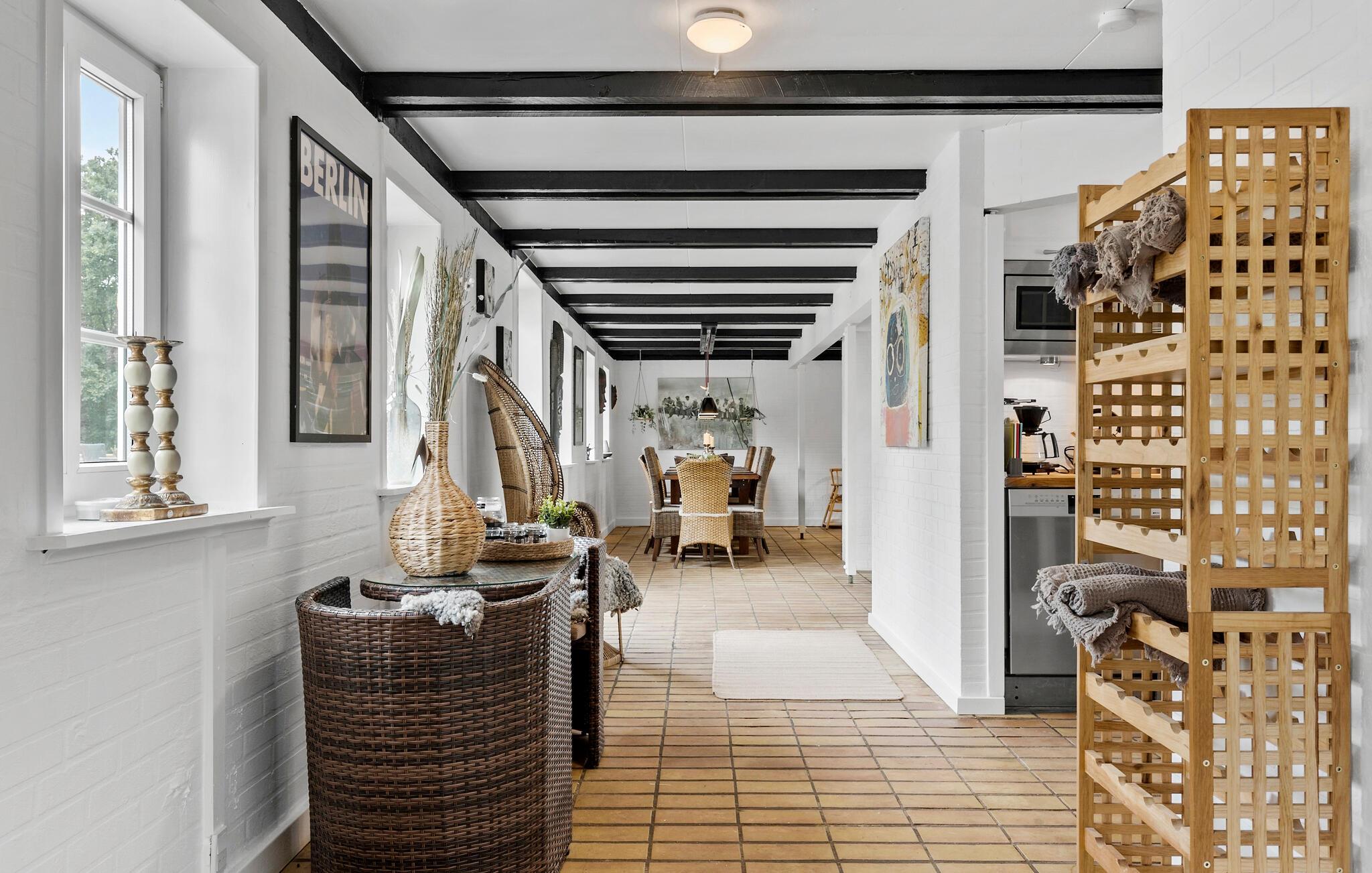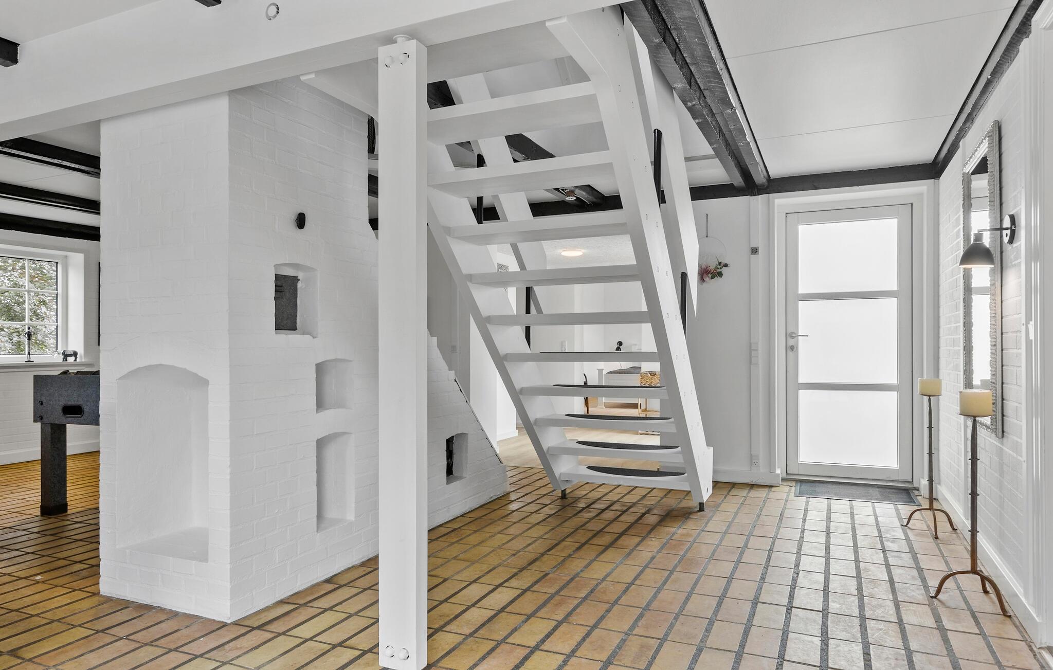 Glæd jer til jeres ferie sammen med hele familien eller en gruppe venner i dette komfortable og store feriehus, som byder på en lys atmosfære, charmerende loftsbjælker og en tiltalende indretning. Her er der noget for enhver smag. Læg jer for eksempel til rette i liggestolene i stuen og nyd den dejlige varme fra brændeovnen. Tænd op i brændeovnen og glæd jer over lyset fra vinduerne ud mod haven. På førstesalen kan I rigtig nyde udsigten over omgivelserne. Her kan I se langt og nyde omgivelserne uanset årstiden.