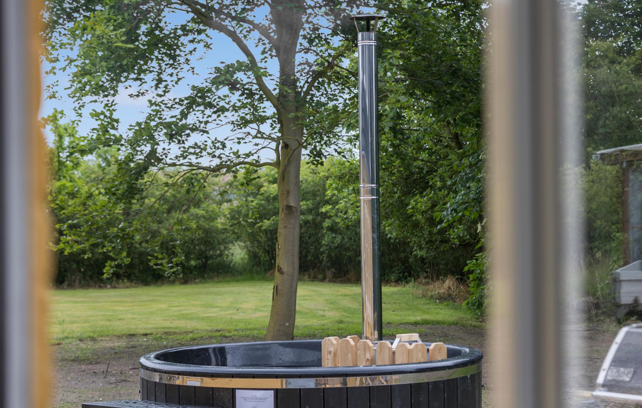 Sommerdagene kan I nyde på den dejlige træterrasse. Drik en kop kaffe her, grill om eftermiddagen eller læn jer tilbage i vildmarksbadet.