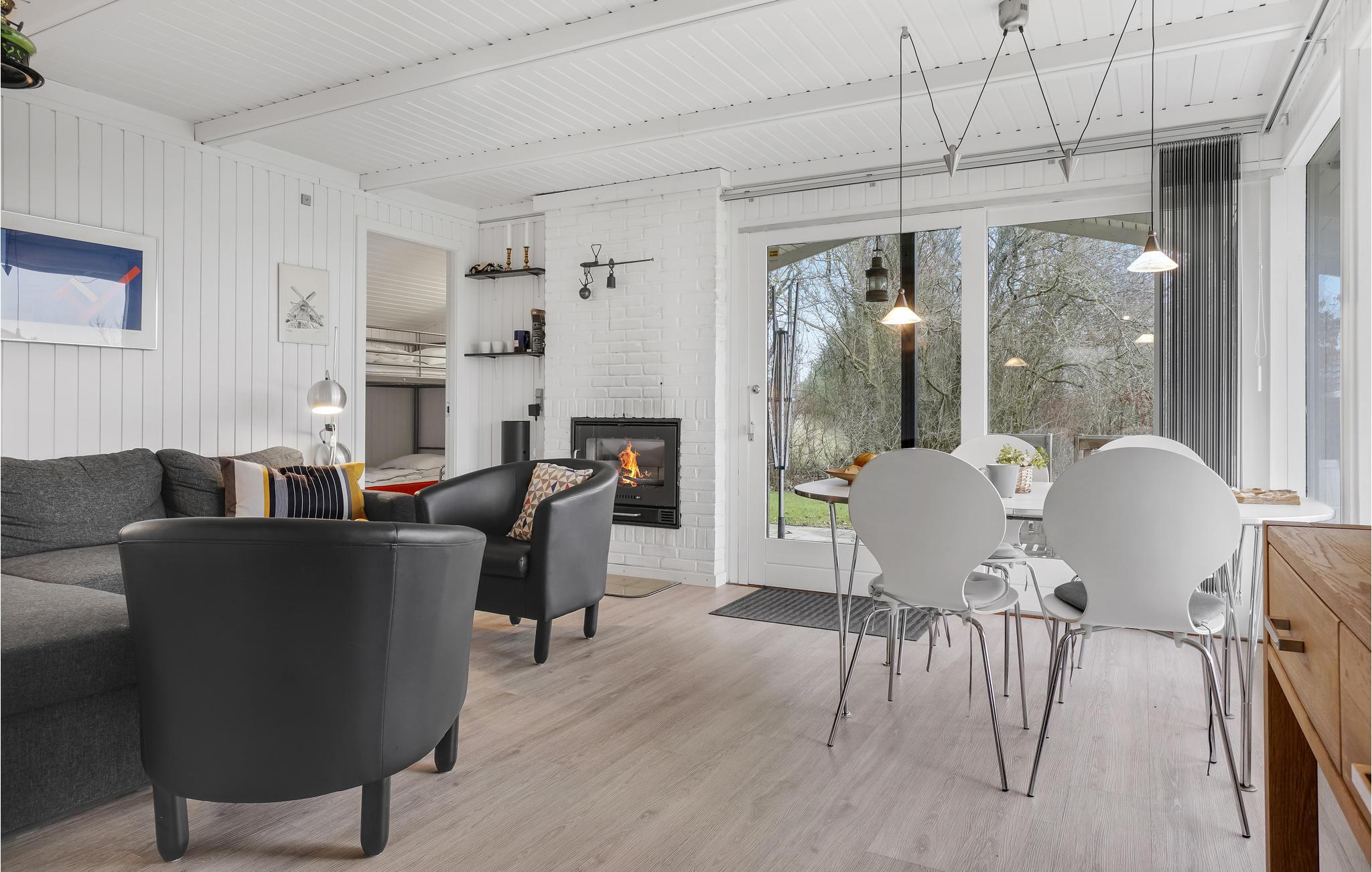 Huset byder velkommen i en skøn beliggenhed på en grund omgivet af træer i gåafstand til fjorden. De lyse værelser danner de ideelle rammer for en hyggelig ferie i en hjemlig atmosfære. Nyd måltider sammen foran gulv til loft vinduerne med en smuk udsigt til haven. Efter en begivenhedsrig dag inviterer den behagelige sofa til film- eller spilleaften, her kan I hygge jer sammen, mens flammerne knitrer i brændeovnen. Nyd solen udenfor huset, mens jeres børn render glade rundt på den store græsplæne. Afslut dagen med en lækker grillmiddag på terrassen og nyd de lange sommeraftener.