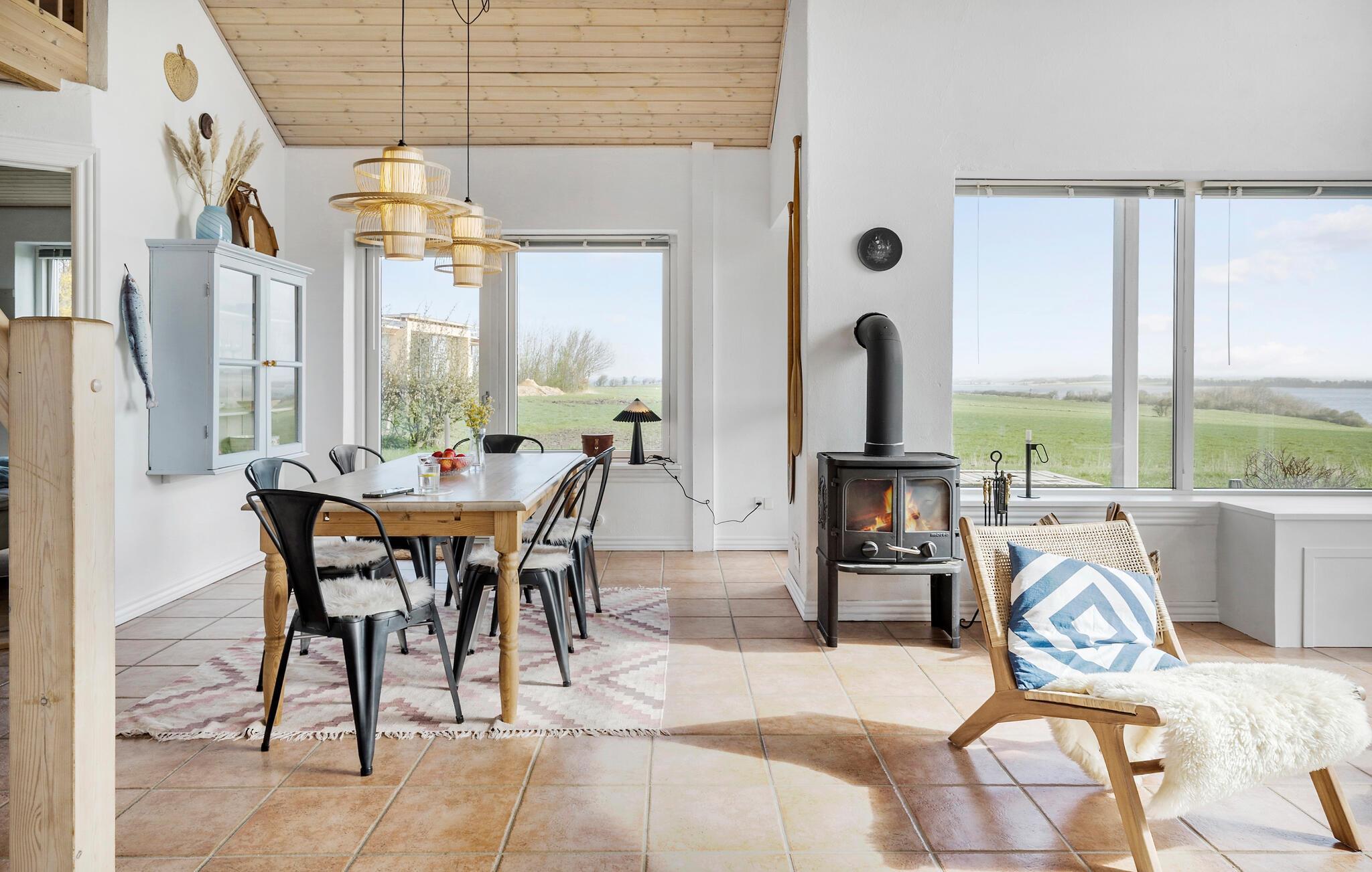 Superflot helårsisoleret hus bygget i røde mursten. Hyggeligt indrettet med gamle afsyrede møbler og brændeovn. Overalt i stuen er der panoramudsigt over Limfjorden. Huset råder over ikke mindre end fem delvis overdækkede terrasser. Rundt om huset er der fliser og en stor græsplæne til udendørs aktiviteter.