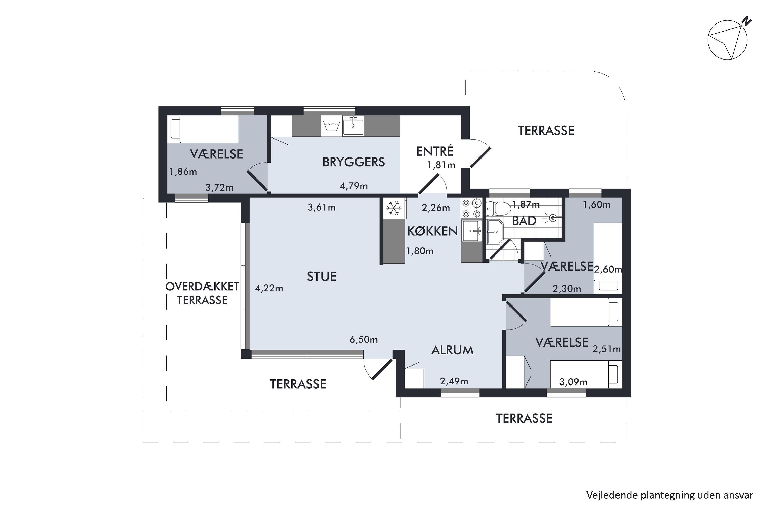 Hyggelig og velmøbleret opholdsstue med god spiseafdeling til 4 personer, TV med danske og tyske kanaler, stereoanlæg med CD samt radio. I åben forbindelse med stuen er der godt køkken med keramisk komfur med ovn, mikrobølgeovn og køleskab med lille separat fryser. Nyere badeværelse med bruseniche og gulvvarme. Praktisk, stort indgangsparti med vaskemaskine samt mulighed for opbevaring af sko og overtøj. Husets sovepladser fordeler sig på 3 gode soverum: 1 med 2 enkeltsenge og 2 med hver 1 enkeltseng. Internetadgang.