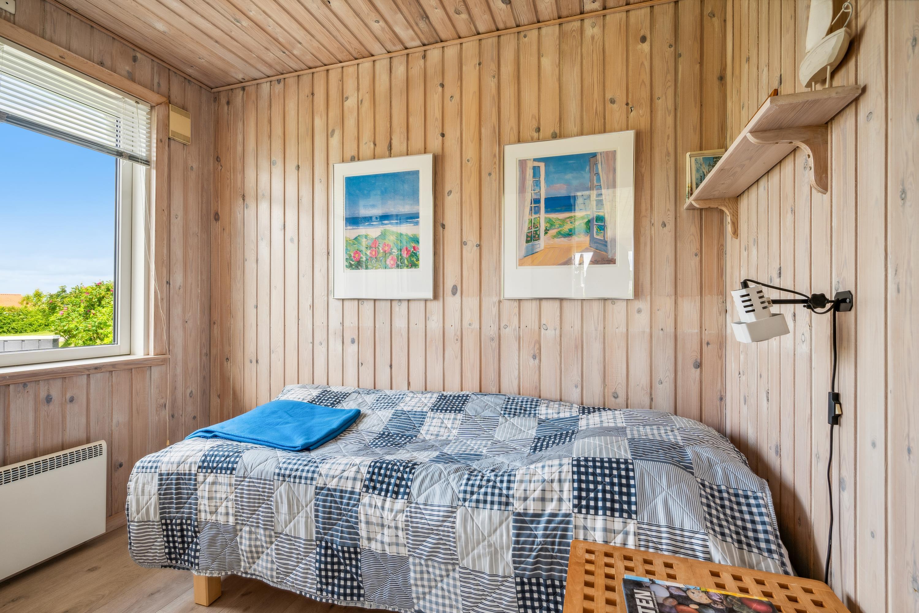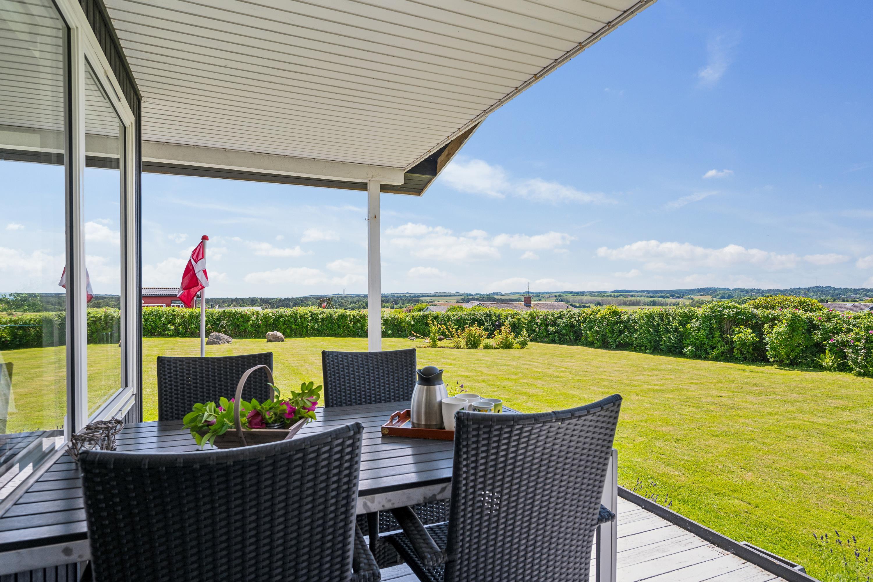 Ældre, moderniseret og meget velholdt feriehus beliggende tæt på børnevenlig strand og med skøn udsigt over Kattegat. Dejlig, delvist overdækket sydvestvendt træ-/fliseterrasse med havemøbler, liggestole, parasol og grill. Desuden er der bålplads, sandkasse og legeredskaber på grunden.