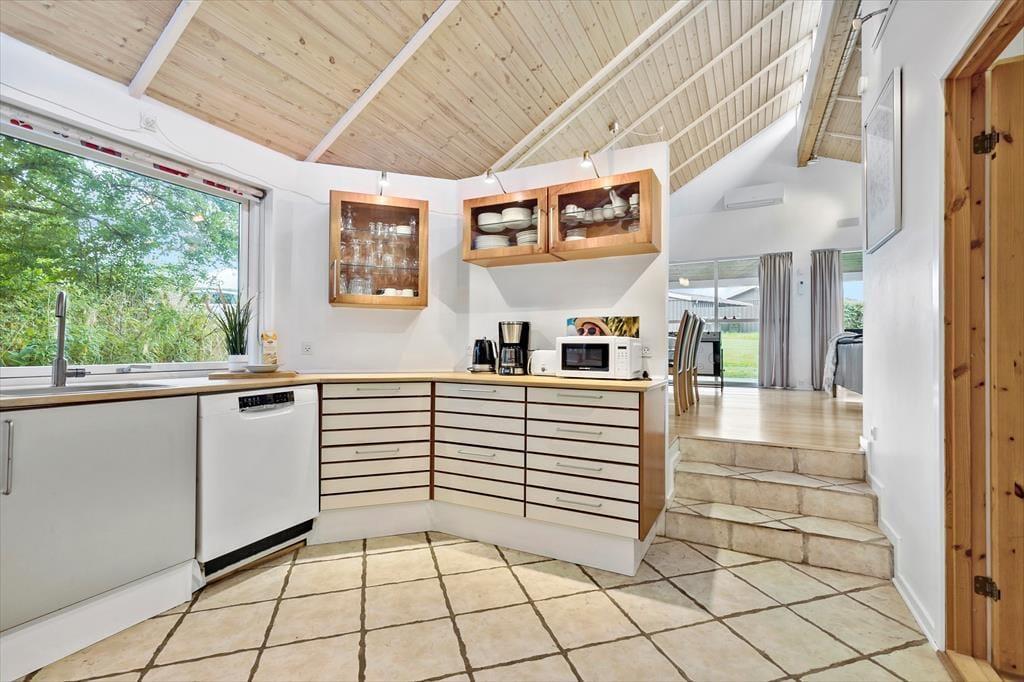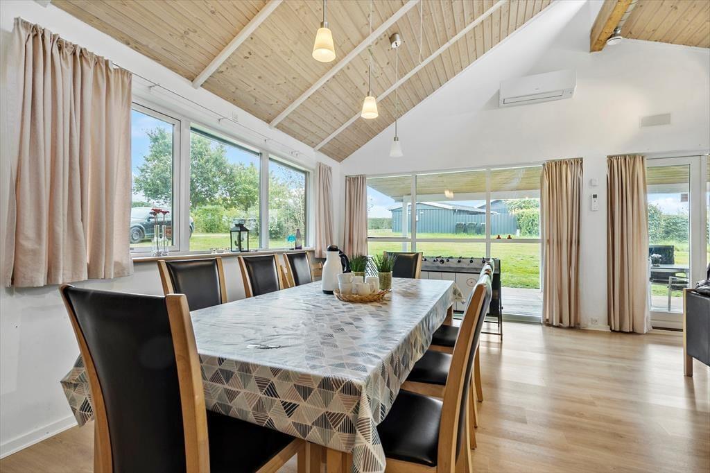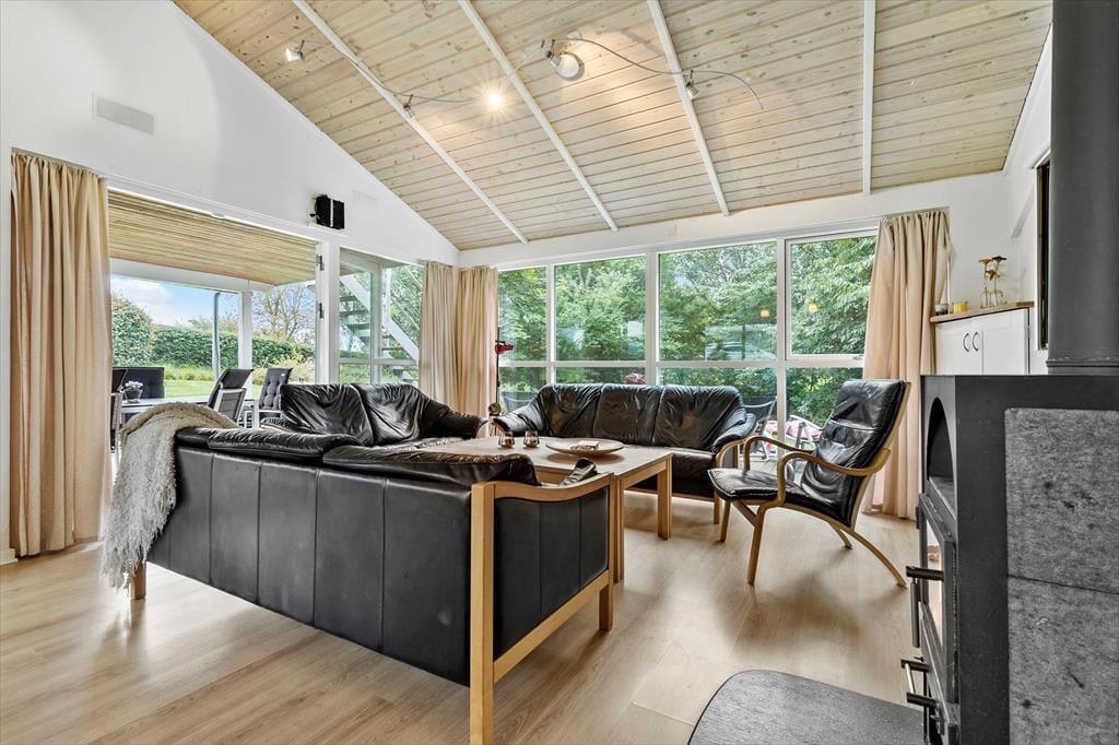 Indenfor byder feriehuset på et stort og åbent opholdsrum, hvor I kan nyde hyggelige stunder sammen. De tre rummelige soveværelser giver god plads til afslapning, og hemsen er oplagt til børnene eller som ekstra sovepladser. Huset har to badeværelser – det ene med både sauna og spabad – hvilket gør det nemt at forkæle sig selv efter en dag med oplevelser. Køkkenet er fuldt udstyret, og her kan I tilberede feriens måltider med udsigt til de smukke omgivelser.