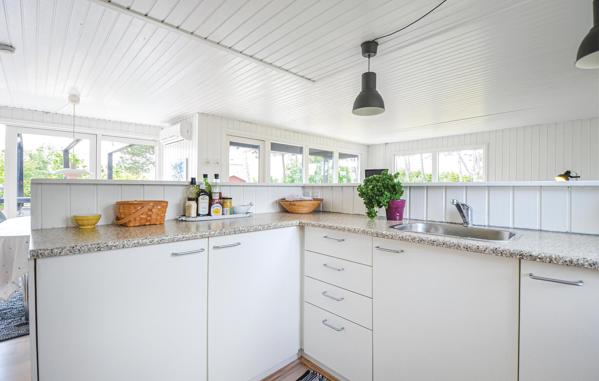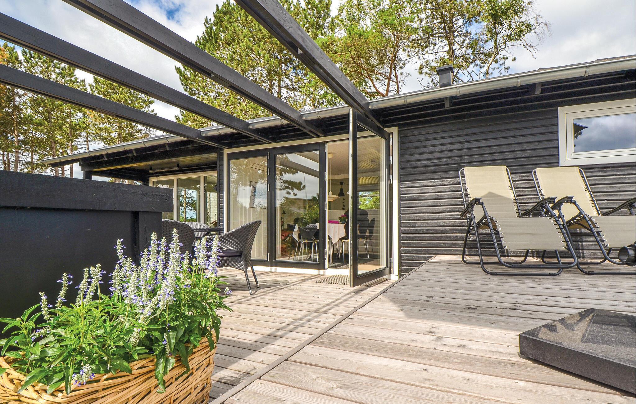 Hold ferie i 2. række til havet med en pragtfuld udsigt over vandet fra den store træterrasse, hvor I kan se øen Hjelmen i det fjerne. Huset er indrettet med gode store soveværelser, et dejligt spisekøkken og pæn møbleret stue holdt i god feriestil. Nyd udelivet på de store terrasser med grillmad og feriehygge. Stranden og området er attraktivt med den "vilde" natur, det friske vand, en blanding af sand og sten og gode muligheder for kystfiskeri. Fra huset går et stisystem direkte til vandet. Huset er udstyret med en hurtig fiberforbindelse.(50 / 50 mbit). Der er ingen afskærmning omkring terrassen.
