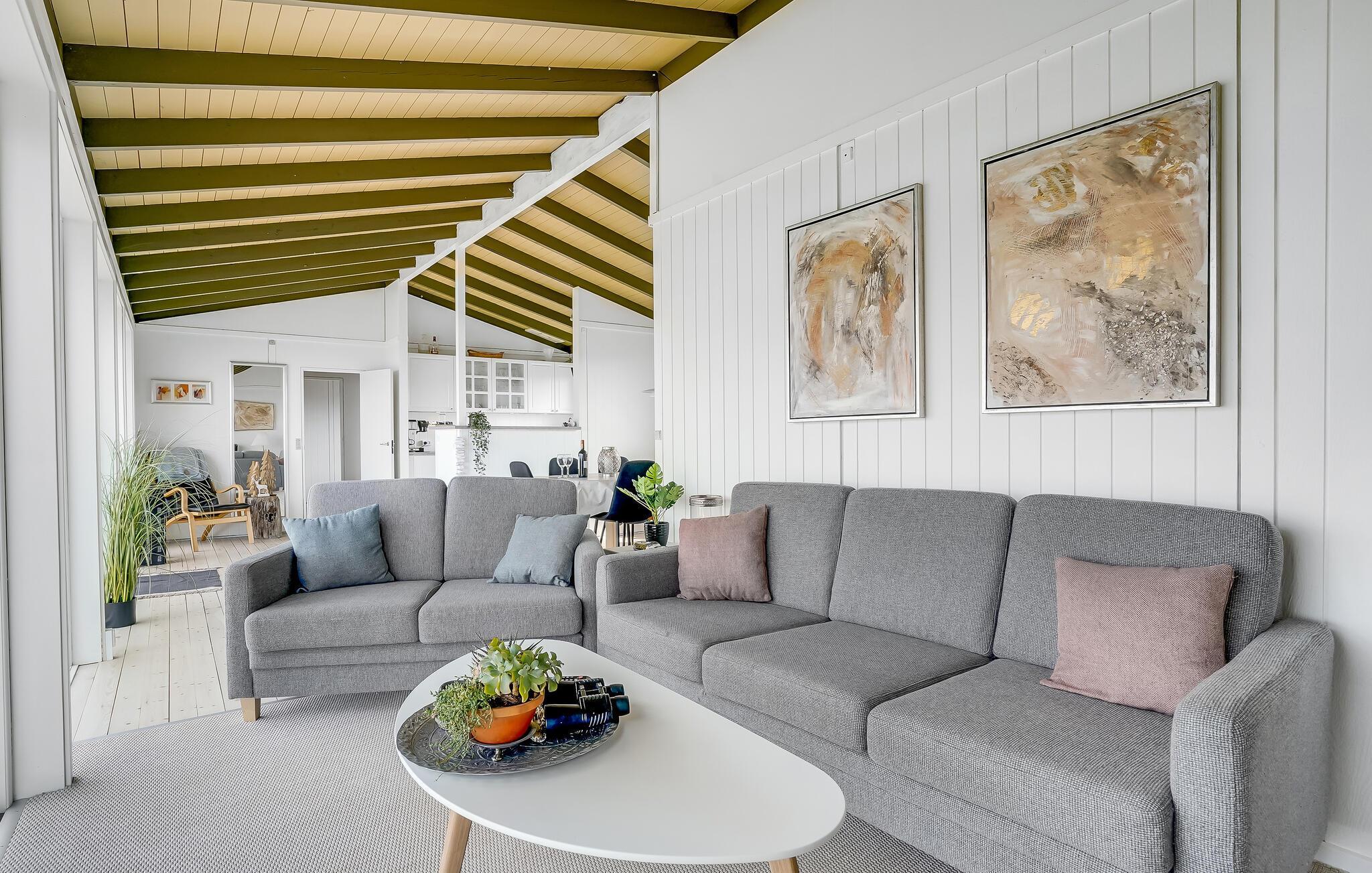Hjertet i huset er det skønne alrum med spiseafsnit og sofahjørne, som får masser af lys ind gennem de store vinduespartier. De tre soveværelser er indrettet med to dobbeltsenge og to enkeltsenge, og stilen er pæn og ensartet. Soveværelset med enkeltsenge befinder sig i annekset. I kommer helt sikkert til at sove sødt her.
