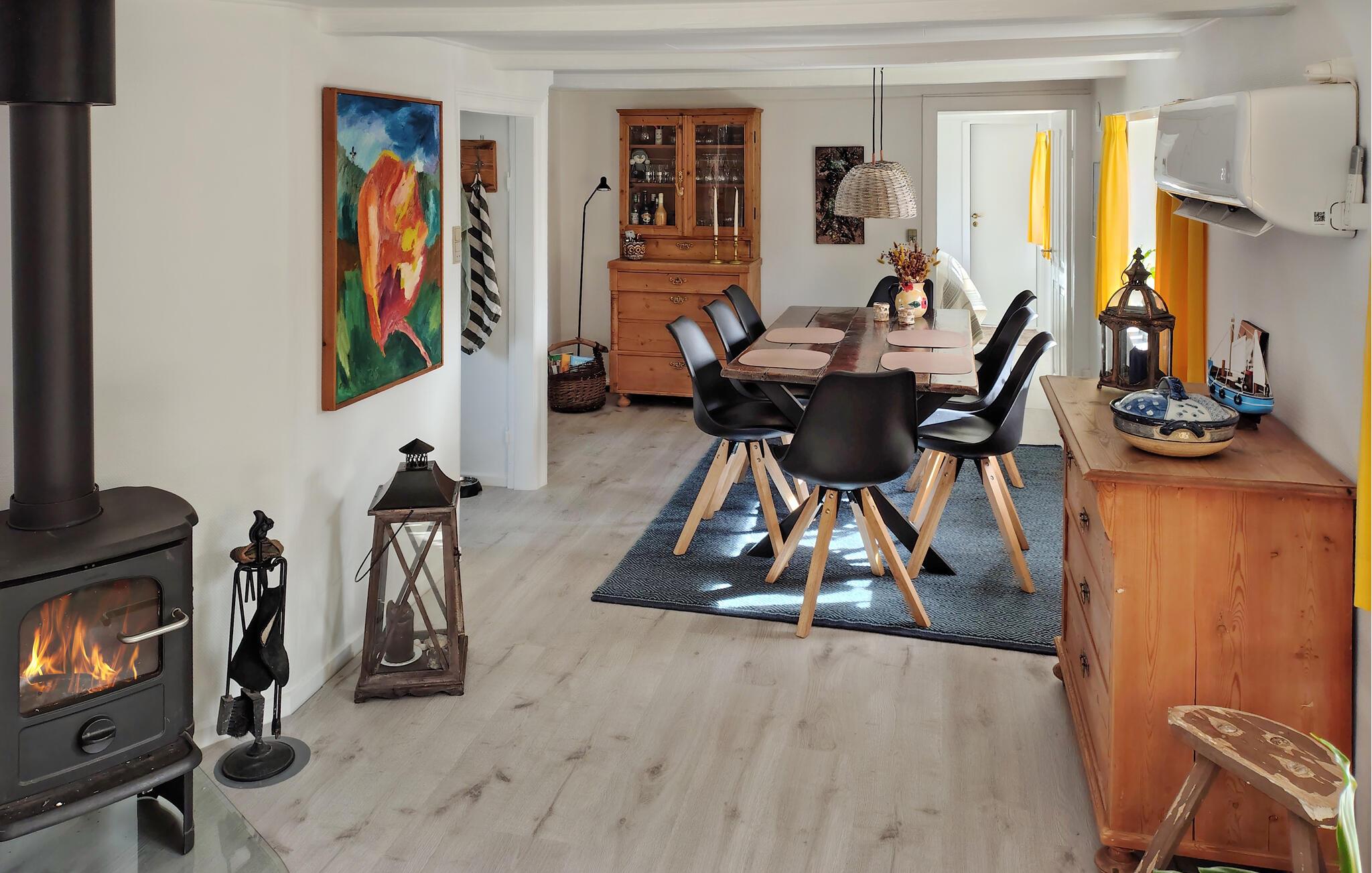 Tilbring en dejlig ferie i dette indbydende sommerhus, der er komfortabelt indrettet og skaber ideelle rammer for et ophold, som I vil huske med glæde i lang tid. En smuk udsigt over fjorden fuldender feriestemningen. Der er behagelig gulvvarme i badeværelset. Om aftenen kan I slappe af ved brændeovnen og lytte til flammens knitren.