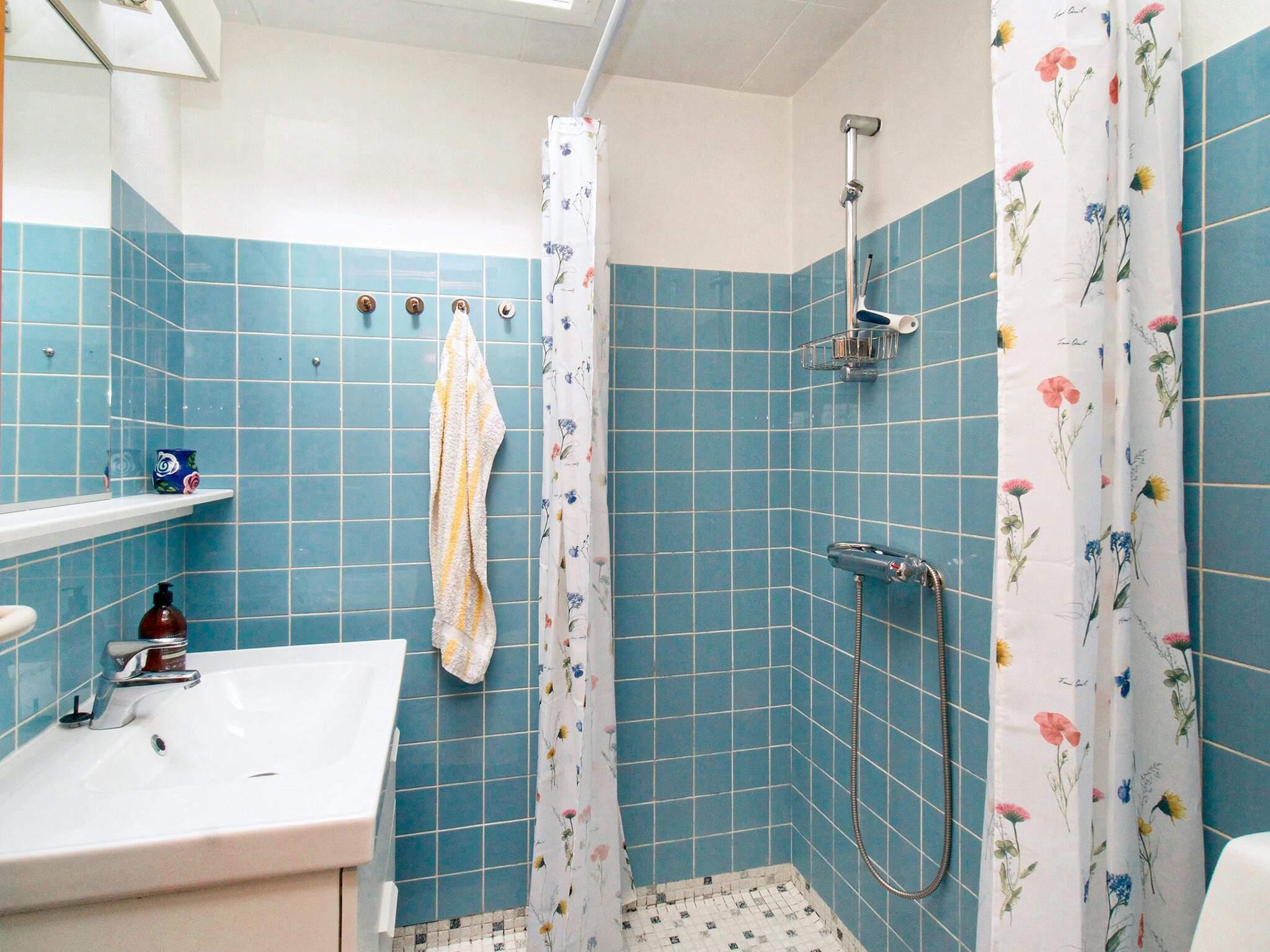 Køkkenet er fuldt udstyret med køle-/fryseskab, opvaskemaskine og ovn/komfur, hvilket gør madlavningen nem og praktisk. Fra køkkenet fører en lille gang til det andet, mindre badeværelse. Indretningen er enkel og hjemlig, med fokus på funktionalitet og afslappet feriestemning.