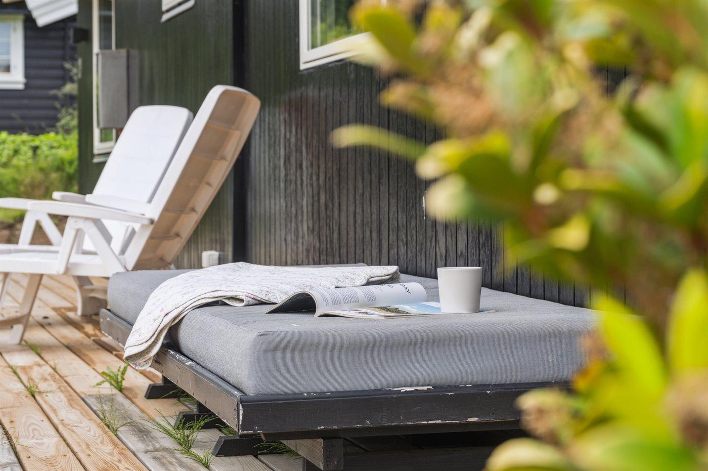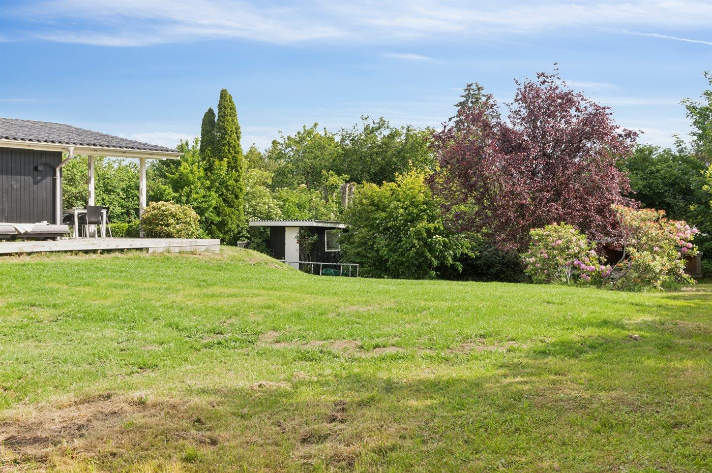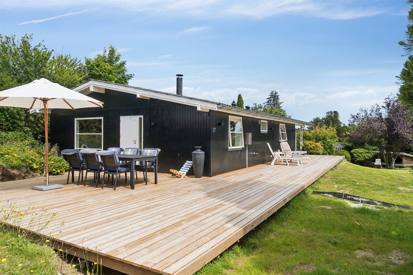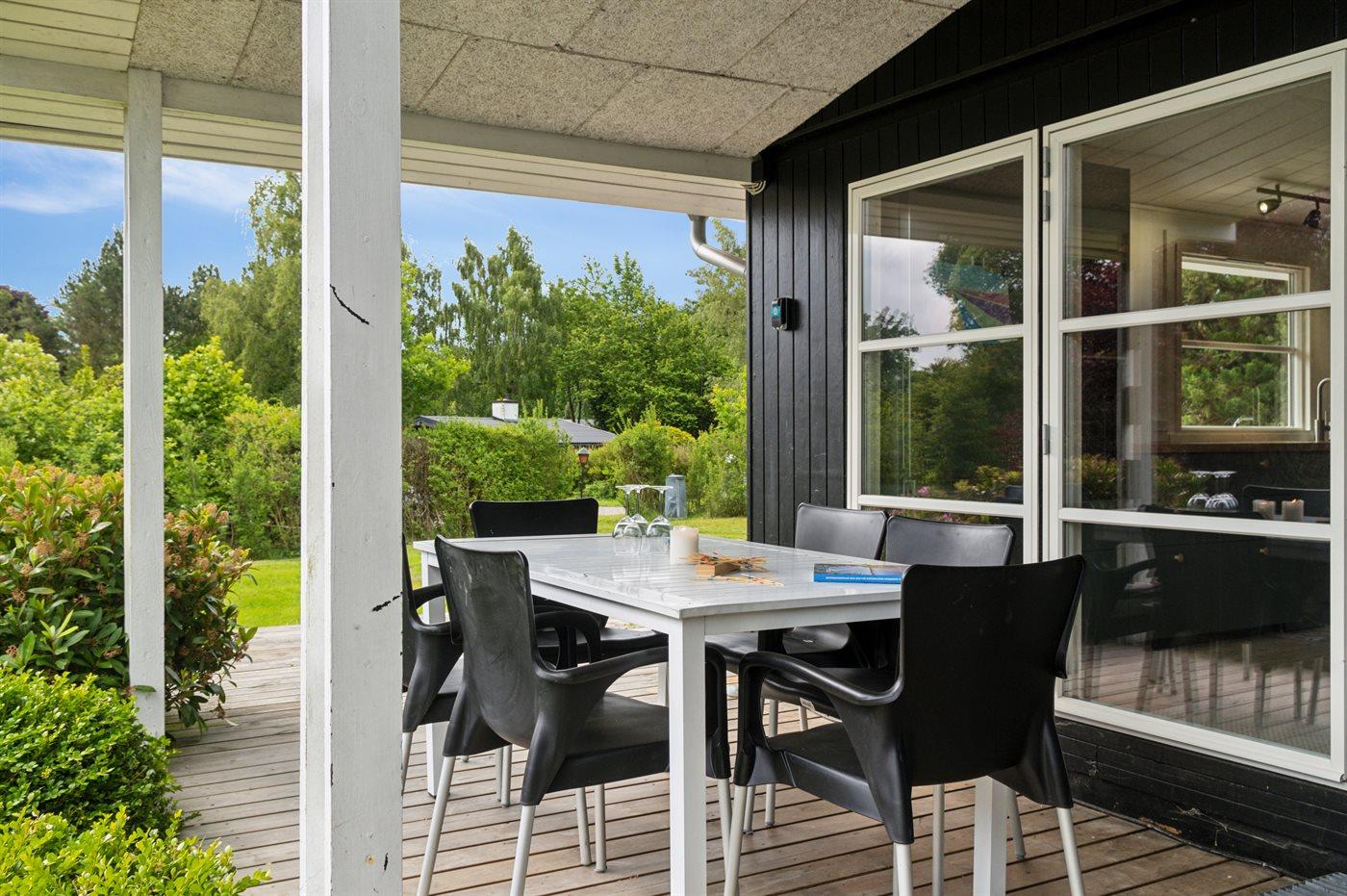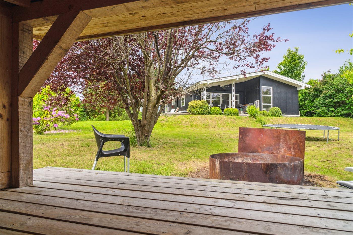 Ferieboligen er beliggende på en 1200 m² stor havegrund. Der er 600 m til havet. Nærmeste forretning er beliggende i en afstand af 2100 m. Til ferieboligen hører åbent terrasseareal. Desuden er der overdækket terrasse. Bålsted. Shelter. Grill til rådighed. Der er installeret stik til opladning af elbil. Type 2 stik. Med 11 kW ladeeffekt. Parkering ved ferieboligen.