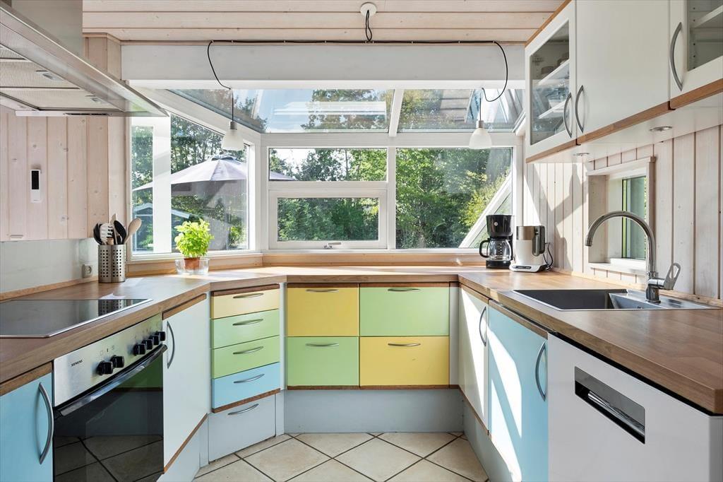 Når du træder ind i sommerhuset, mærker du straks den varme og indbydende atmosfære. Husets åbne køkken ligger i forlængelse af spisepladsen, hvor familie og venner kan samles omkring måltiderne. Fra spisepladsen fører et par trin ned til opholdsstuen, som skaber en hyggelig stemning med sine niveauforskelle. Her kan I slænge jer i de bløde sofaer, mens brændeovnen knitrer i baggrunden – perfekt til afslappende aftener med brætspil eller en god film.