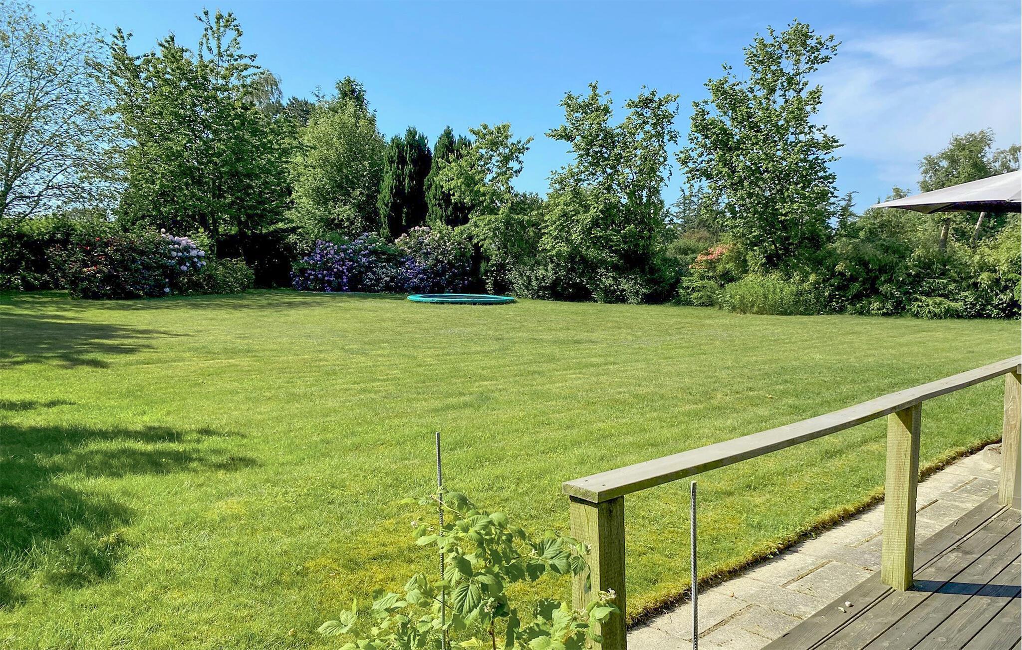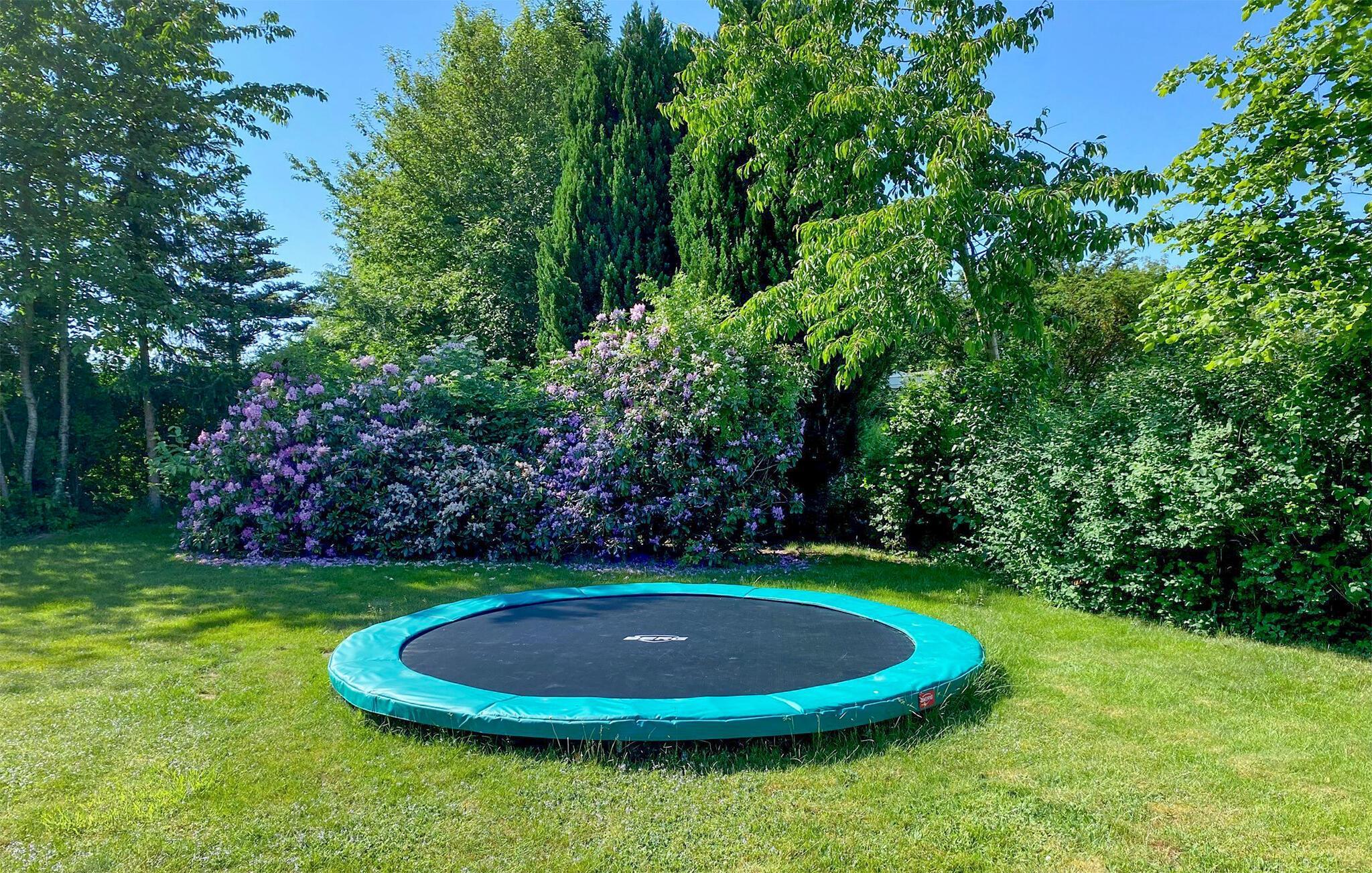 Huset ligger på en stor og dejlig grund, hvor I kan nyde solen fra morgen til aften. Der er masser af plads i haven og en trampolin, som de kan brænde energi af på, mens de voksne tager den lidt med ro med en kop kaffe og et krydsord på terrassen.