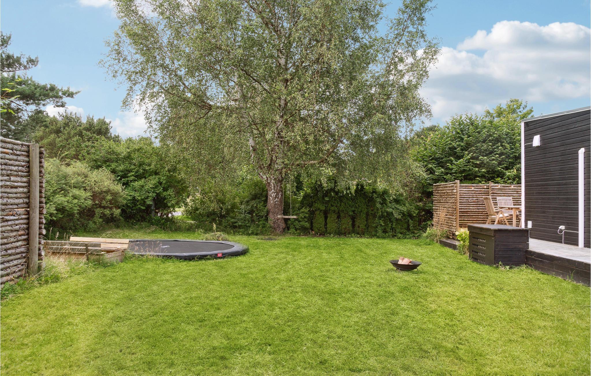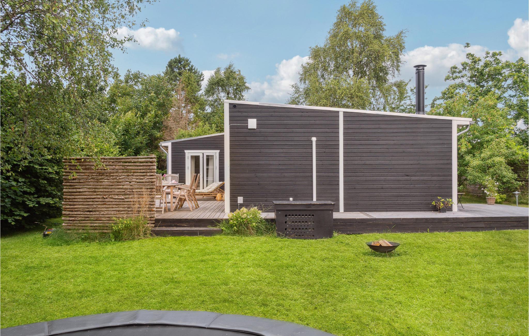 Hyggeligt sommerhus i Dronningmølle med brændeovn, terrasse, sandkasse og trampolin nær børnevenlig strand.
