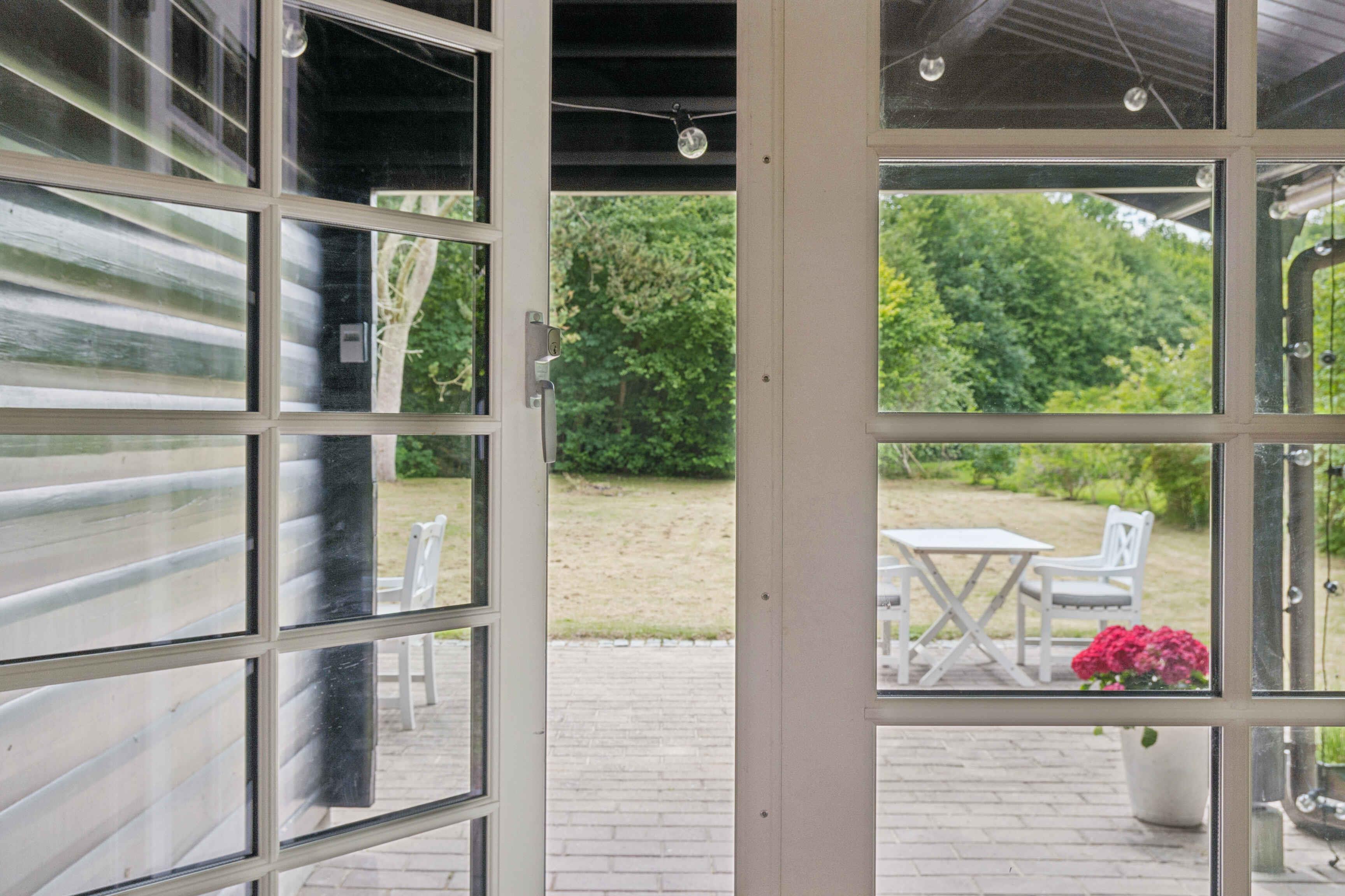 Charmerende bjælketræshus tæt på privat strand med dejlig terrasse og rolig naturudsigt.