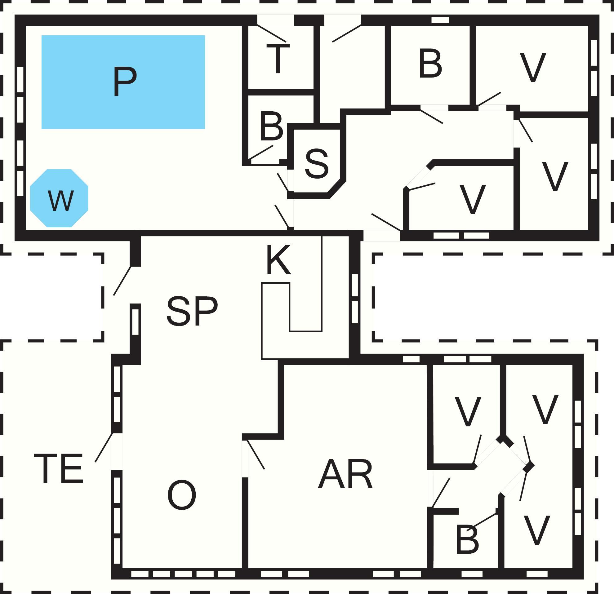 Huset er bygget op omkring to separate soveafdelinger med hver 3 soveværelser, i alt 3 badeværelser, poolrum, sauna, stor kombineret opholds- og spisestue med åbent køkken, et stort aktivitetsrum samt en hems med 4 sovepladser og tv. Der er gulvvarme i alle rum og huset opvarmes via jordvarme.