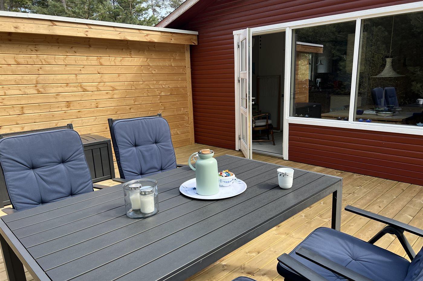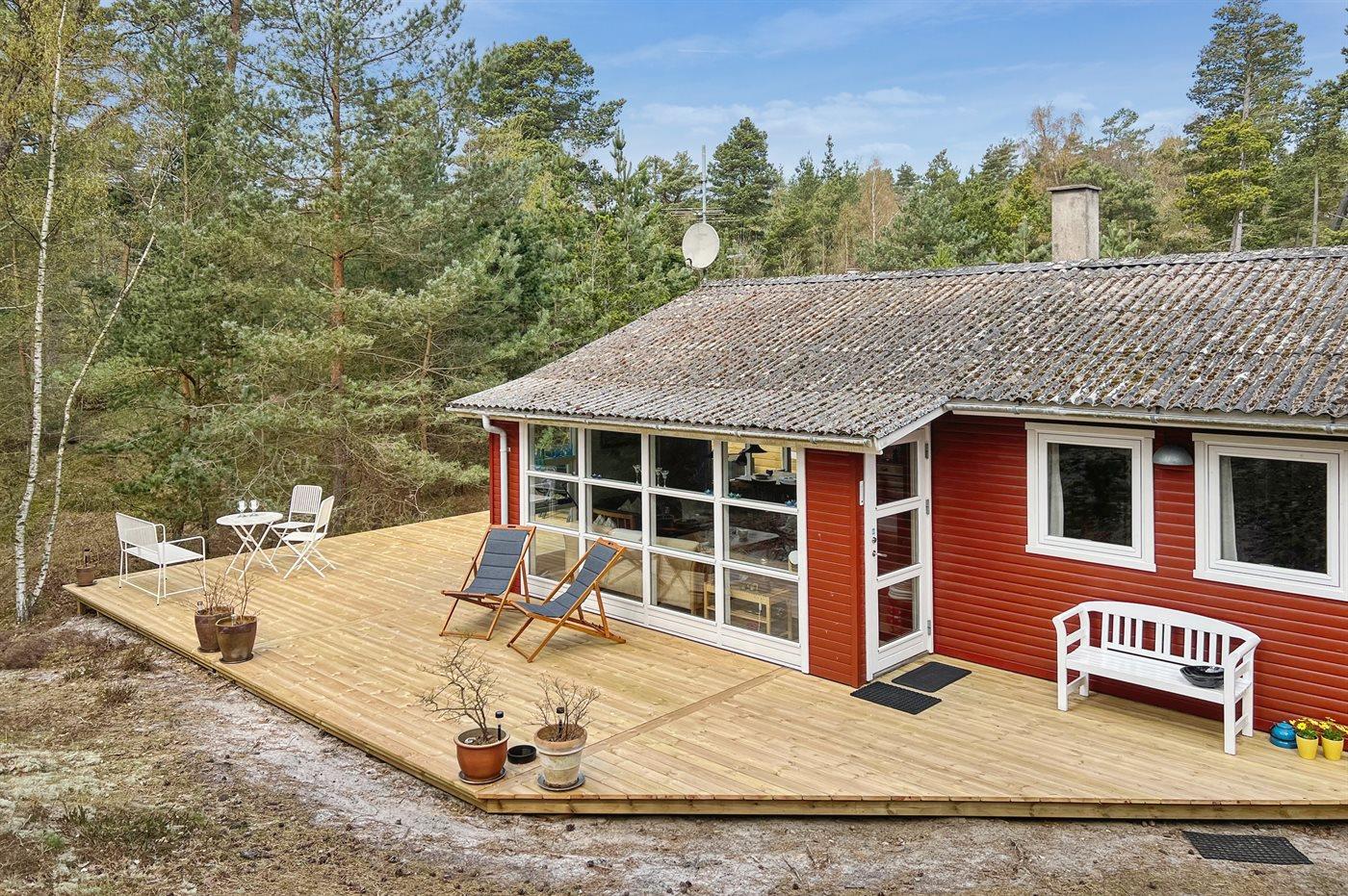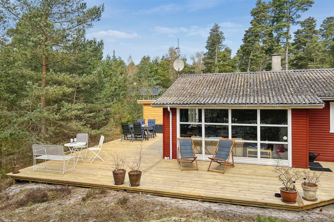 Hyggeligt sommerhus nær Dueoddes sandstrand med stor terrasse og naturgrund.