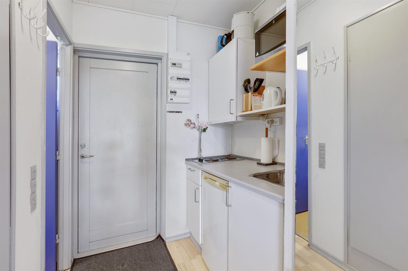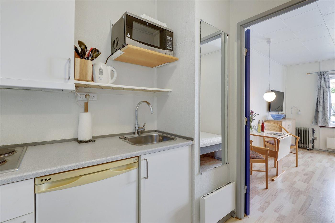 Køkkenet er udstyret med 1 køleskab. Der er 2 elkogeplader, miniovn.