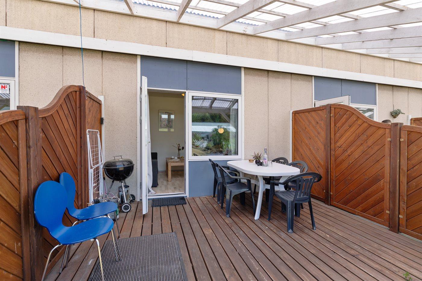 Lys ferielejlighed nær Dueoddes sandstrand med overdækket terrasse og adgang til opvarmet pool.