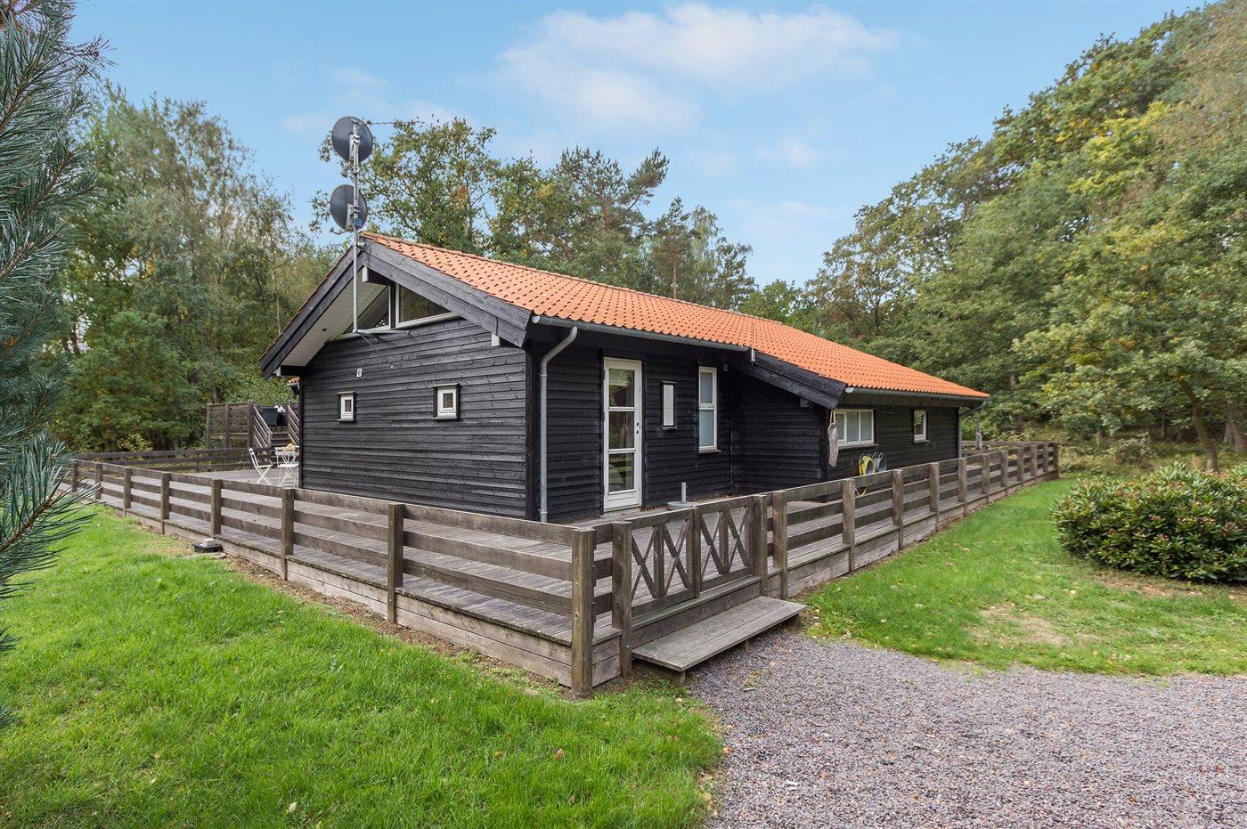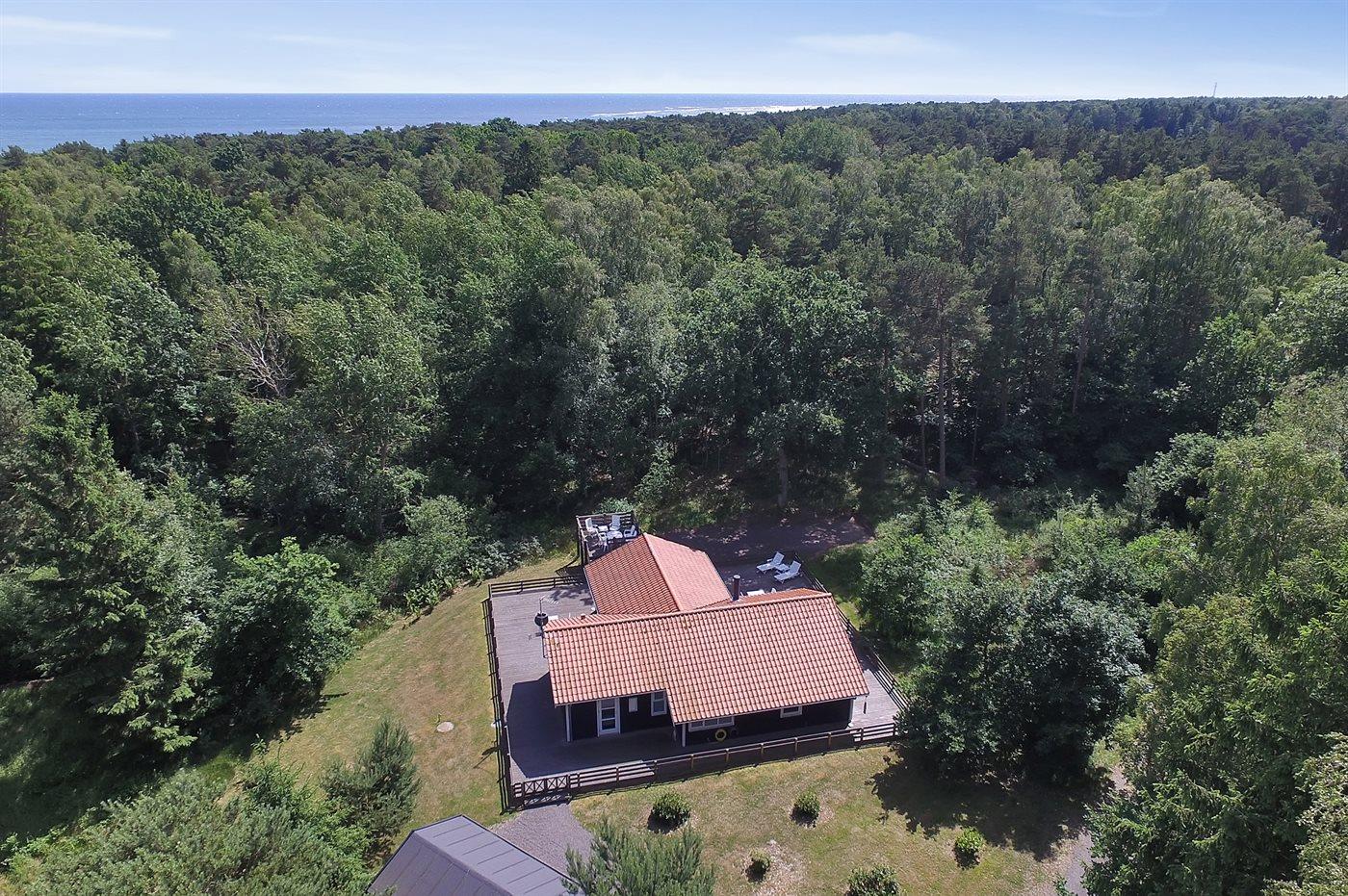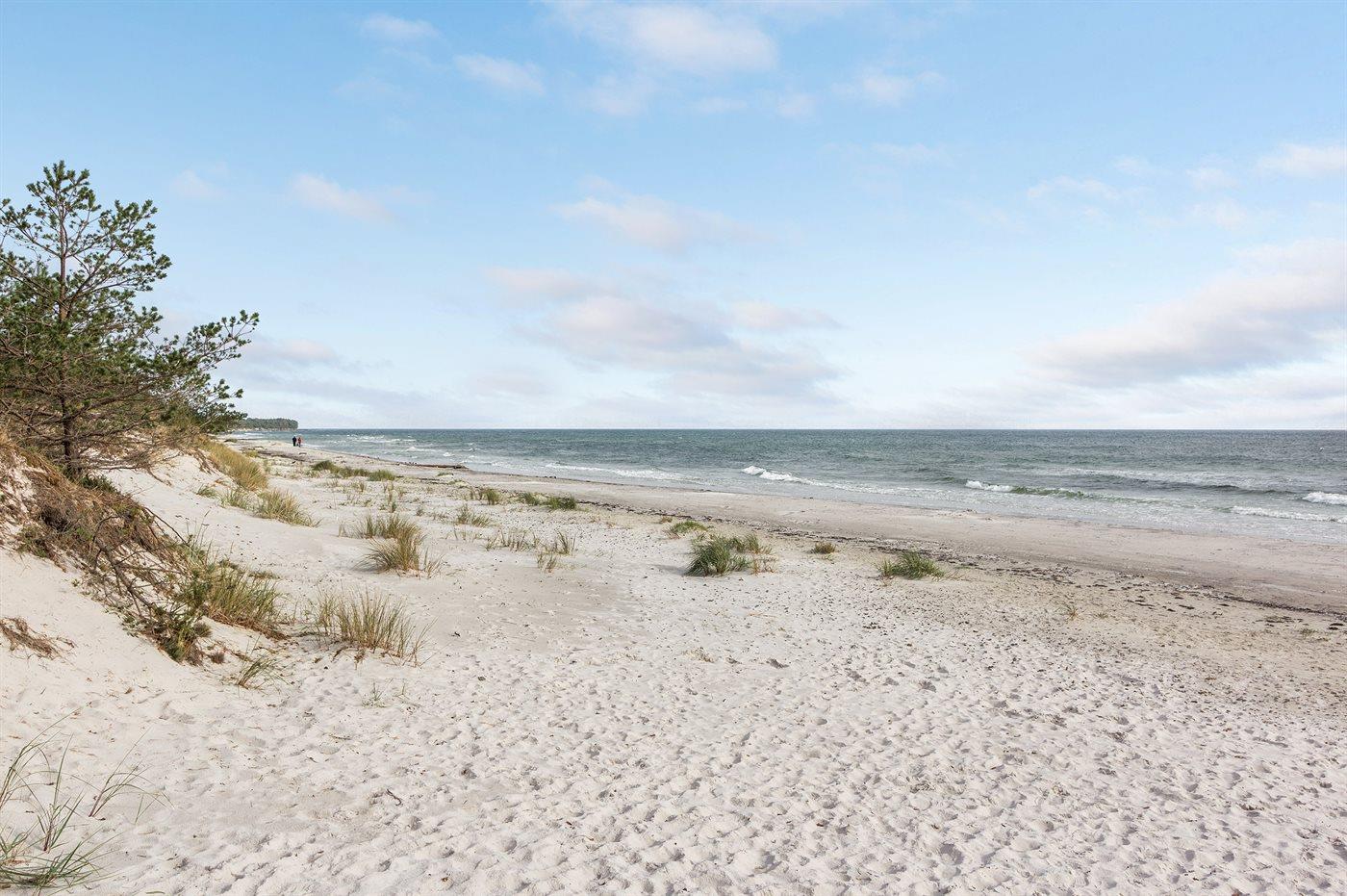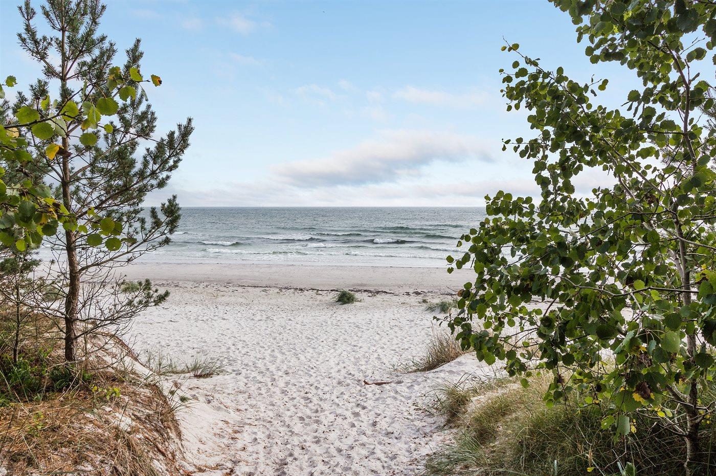 Flot luksussommerhus i træ - beliggende på en stor naturgrund, der er omkranset af skov, tæt på de hvide sandstrande ved Dueodde. Huset ligger ugeneret i rolige omgivelser, kun 300 m fra vandet. Rundt om huset er der en meget stor og afskærmet terrasse med havemøbler og med adgang til en træbalkon til ugeneret solbadning, der er hævet et par meget over jorden. Indvendig er huset flot indrettet med et dejligt køkken med bl.a. fryser, varmluftovn, mikrobølgeovn, espresso og almindelig kaffemaskine, opvaskemaskine og komfur med induktionskogeplader. Køkkenet ligger i åben forbindelse til den dejlige, store opholdsstue med spiseafdeling, brændeovn, TV, hvor der er installeret chromecast, DVD-afspiller, stereoanlæg samt direkte udgang til terrassen. Endvidere er ferieboligen udstyret med 1 energibesparende varmepumpe. Husets sovepladser fordeler sig på 3 dejlige, store soveværelser med dobbeltseng samt en rummelig hems med 2 sovepladser. I huset er der 2 dejlige badeværelser med bruseniche. Det store er endvidere indrettet med 2-pers. spa og direkte adgang til saunaen og det andet er udstyret med vaskemaskine og tørretumbler. Huset er endvidere udstyret med gratis, trådløs internetforbindelse (egen computer skal medbringes). Der er flotte klinkegulve overalt i huset. Der findes gynge på grunden. Det dejlige sommerhus er velegnet til 2 familier eller flere par og ligger i et dejligt ferieområde i naturskønne omgivelser, tæt på aktivitetsmuligheder og seværdigheder for hele familien.
