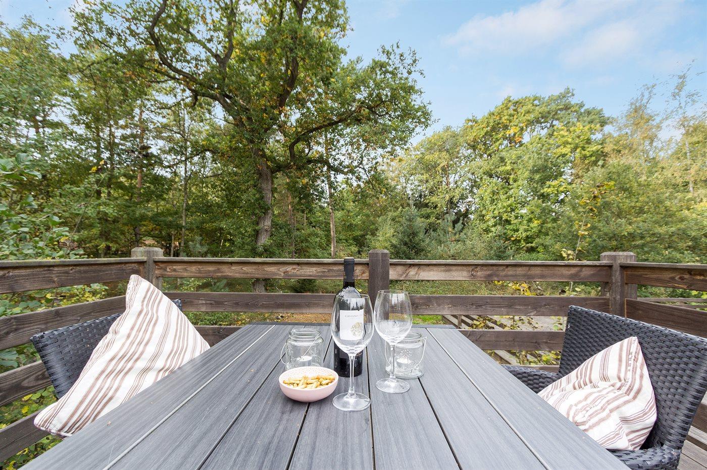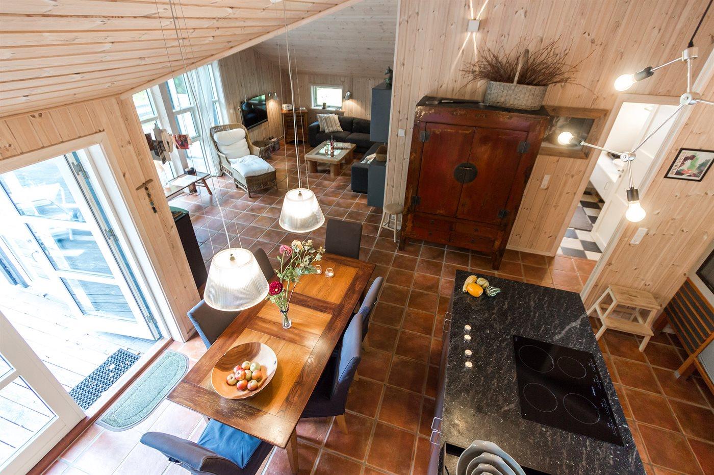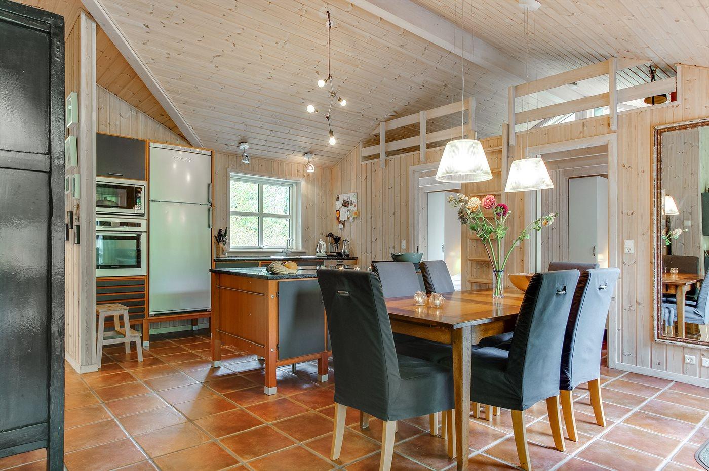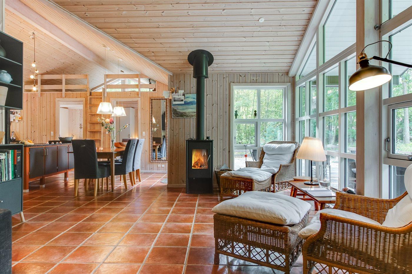 Flot luksussommerhus i træ - beliggende på en stor naturgrund, der er omkranset af skov, tæt på de hvide sandstrande ved Dueodde. Huset ligger ugeneret i rolige omgivelser, kun 300 m fra vandet. Rundt om huset er der en meget stor og afskærmet terrasse med havemøbler og med adgang til en træbalkon til ugeneret solbadning, der er hævet et par meget over jorden. Indvendig er huset flot indrettet med et dejligt køkken med bl.a. fryser, varmluftovn, mikrobølgeovn, espresso og almindelig kaffemaskine, opvaskemaskine og komfur med induktionskogeplader. Køkkenet ligger i åben forbindelse til den dejlige, store opholdsstue med spiseafdeling, brændeovn, TV, hvor der er installeret chromecast, DVD-afspiller, stereoanlæg samt direkte udgang til terrassen. Endvidere er ferieboligen udstyret med 1 energibesparende varmepumpe. Husets sovepladser fordeler sig på 3 dejlige, store soveværelser med dobbeltseng samt en rummelig hems med 2 sovepladser. I huset er der 2 dejlige badeværelser med bruseniche. Det store er endvidere indrettet med 2-pers. spa og direkte adgang til saunaen og det andet er udstyret med vaskemaskine og tørretumbler. Huset er endvidere udstyret med gratis, trådløs internetforbindelse (egen computer skal medbringes). Der er flotte klinkegulve overalt i huset. Der findes gynge på grunden. Det dejlige sommerhus er velegnet til 2 familier eller flere par og ligger i et dejligt ferieområde i naturskønne omgivelser, tæt på aktivitetsmuligheder og seværdigheder for hele familien.