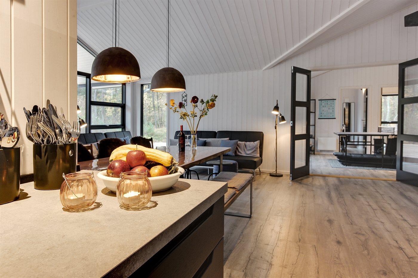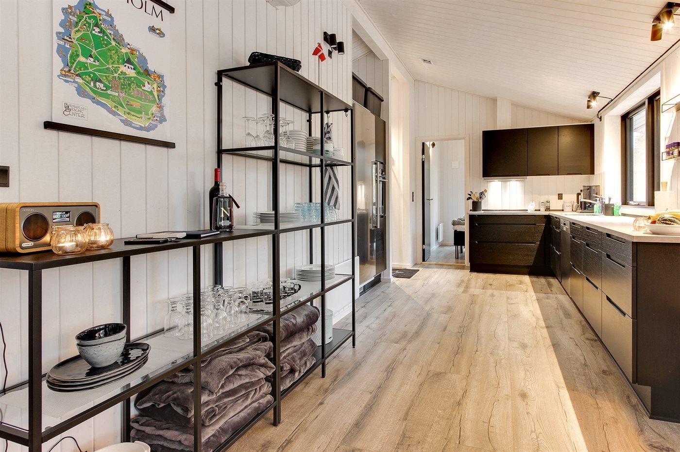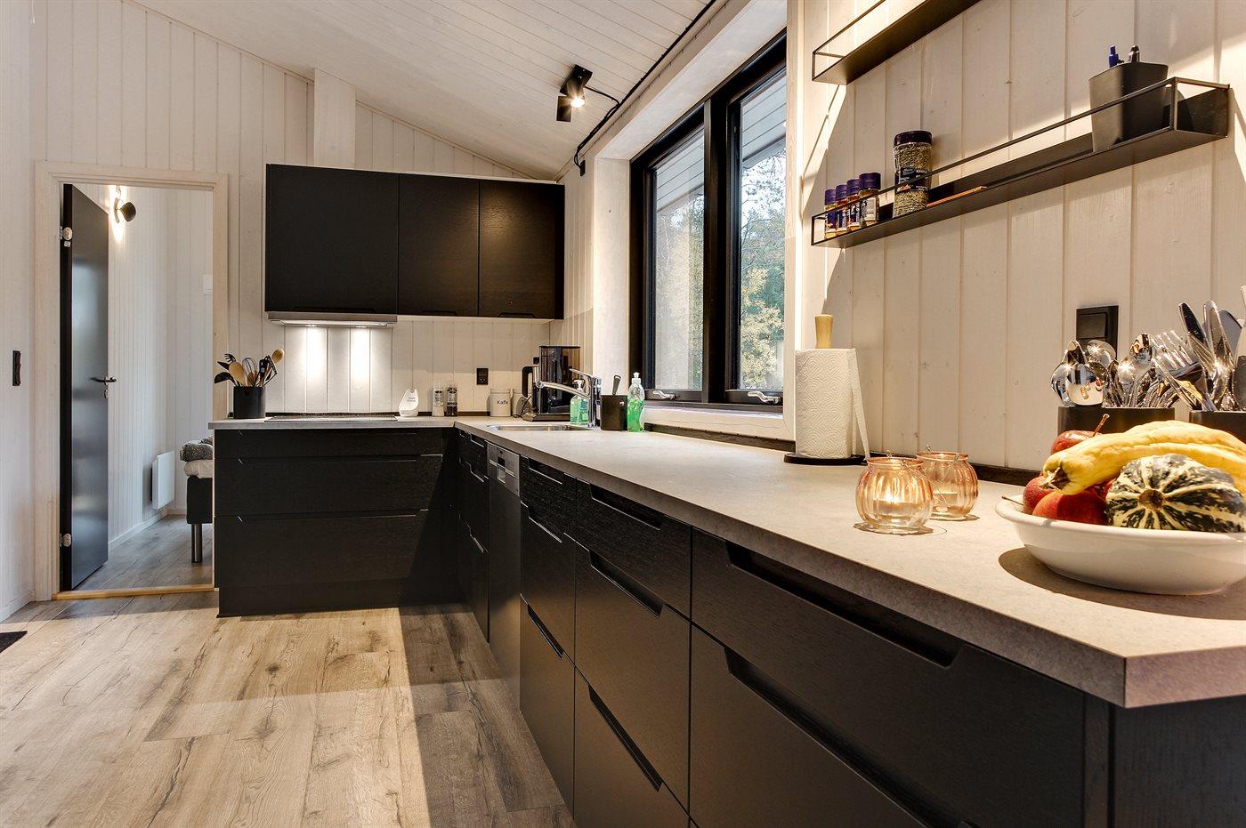 Køkkenet er udstyret med 1 køleskab. Der er 4 induktionskogeplader, varmluftovn, mikrobølgeovn samt opvaskemaskine.
