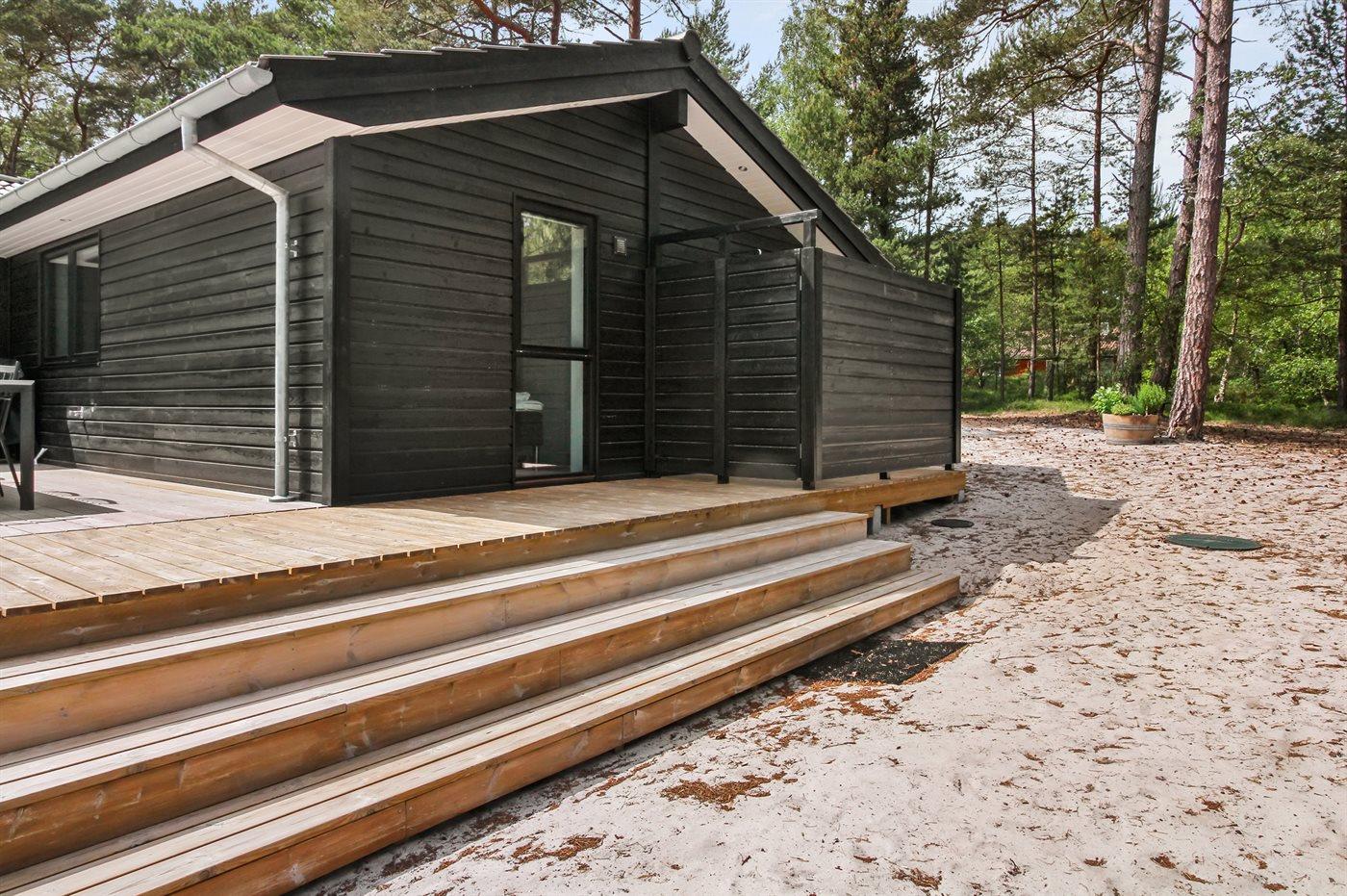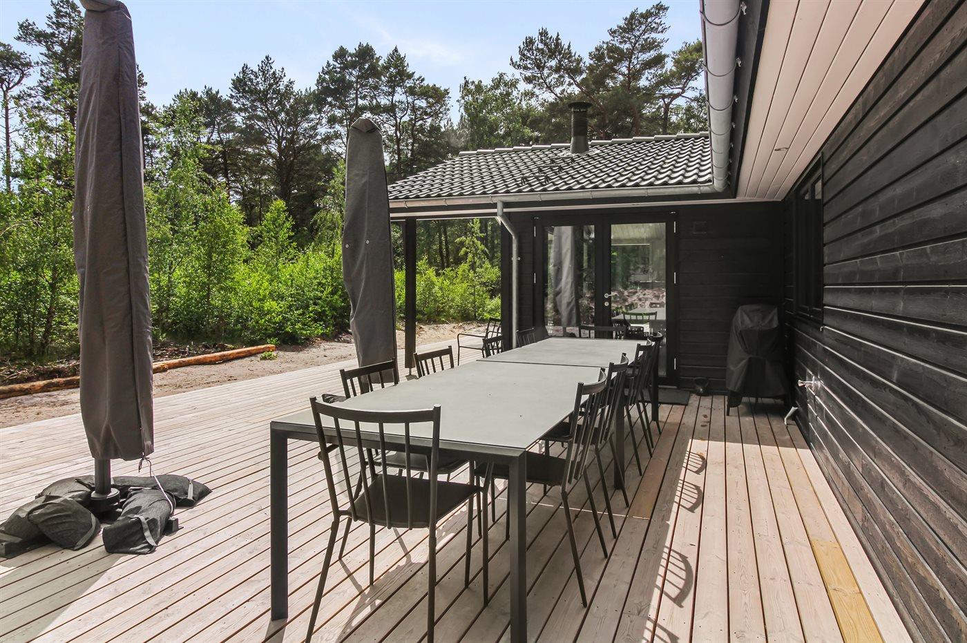 Nær de imponerende klitområder på Dueodde ligger dette herlige og velindrettede sommerhus på en meget stor grund, som er omkranset af birk og fyr. Til huset hører store flotte træterrasser – her kan I sidde og nyde solen er eller nyde de skønne sommeraftener.