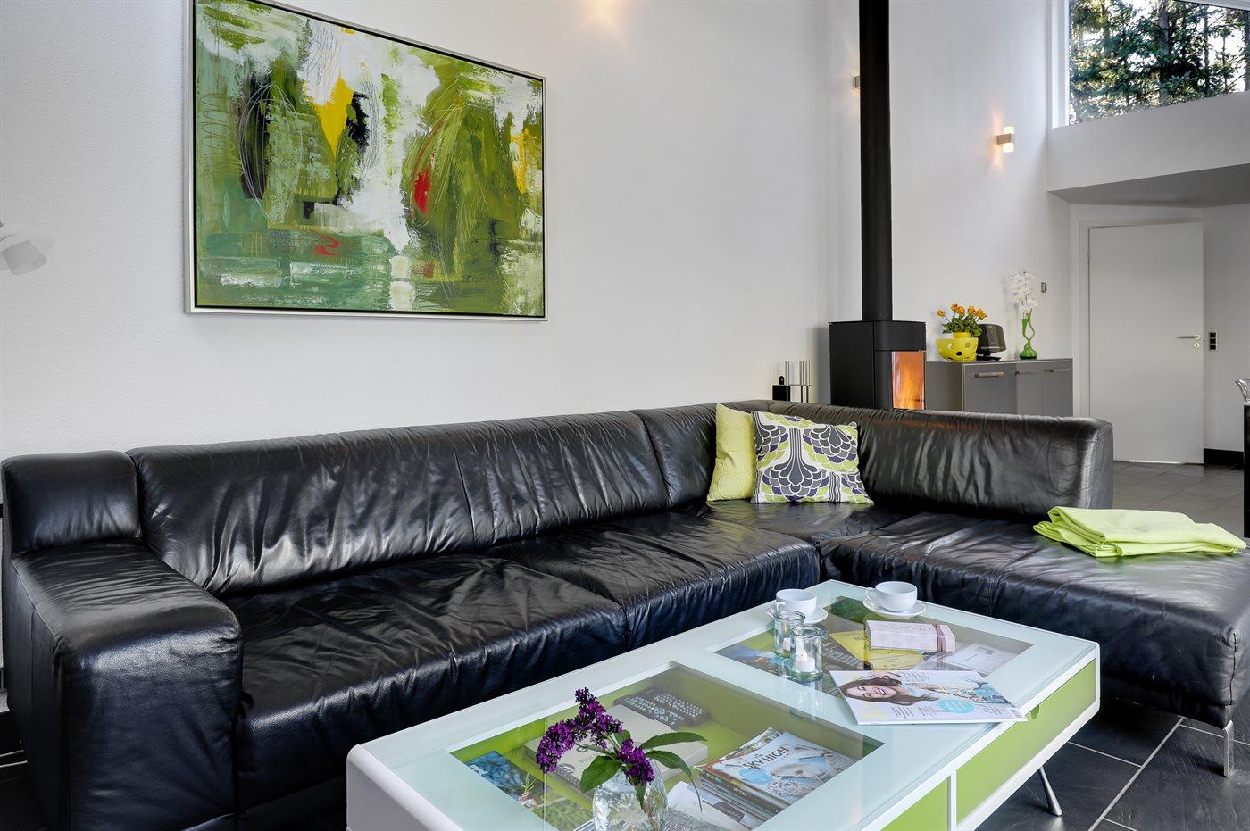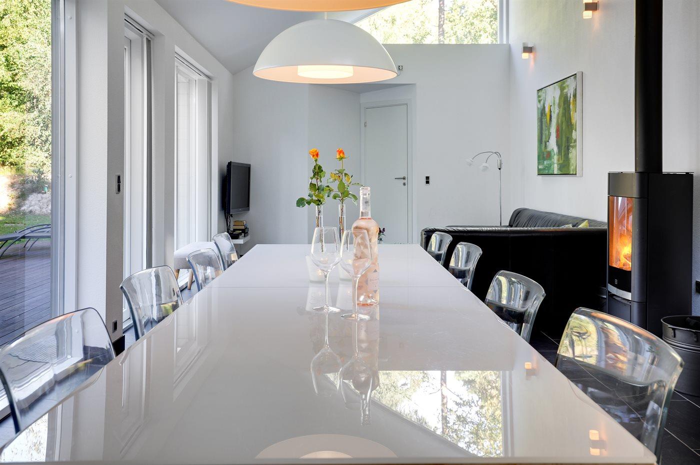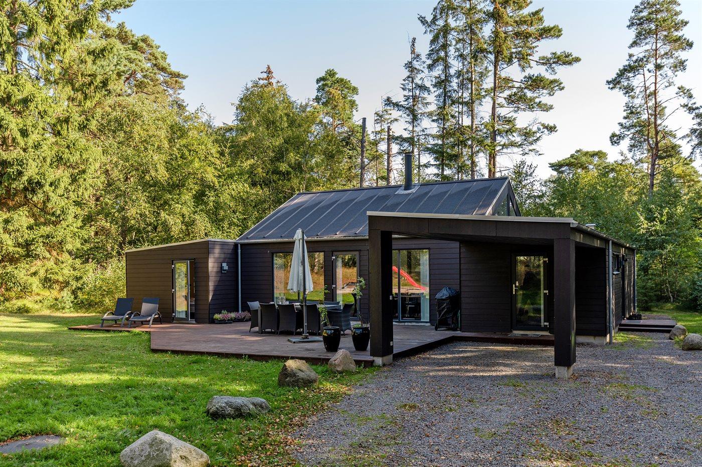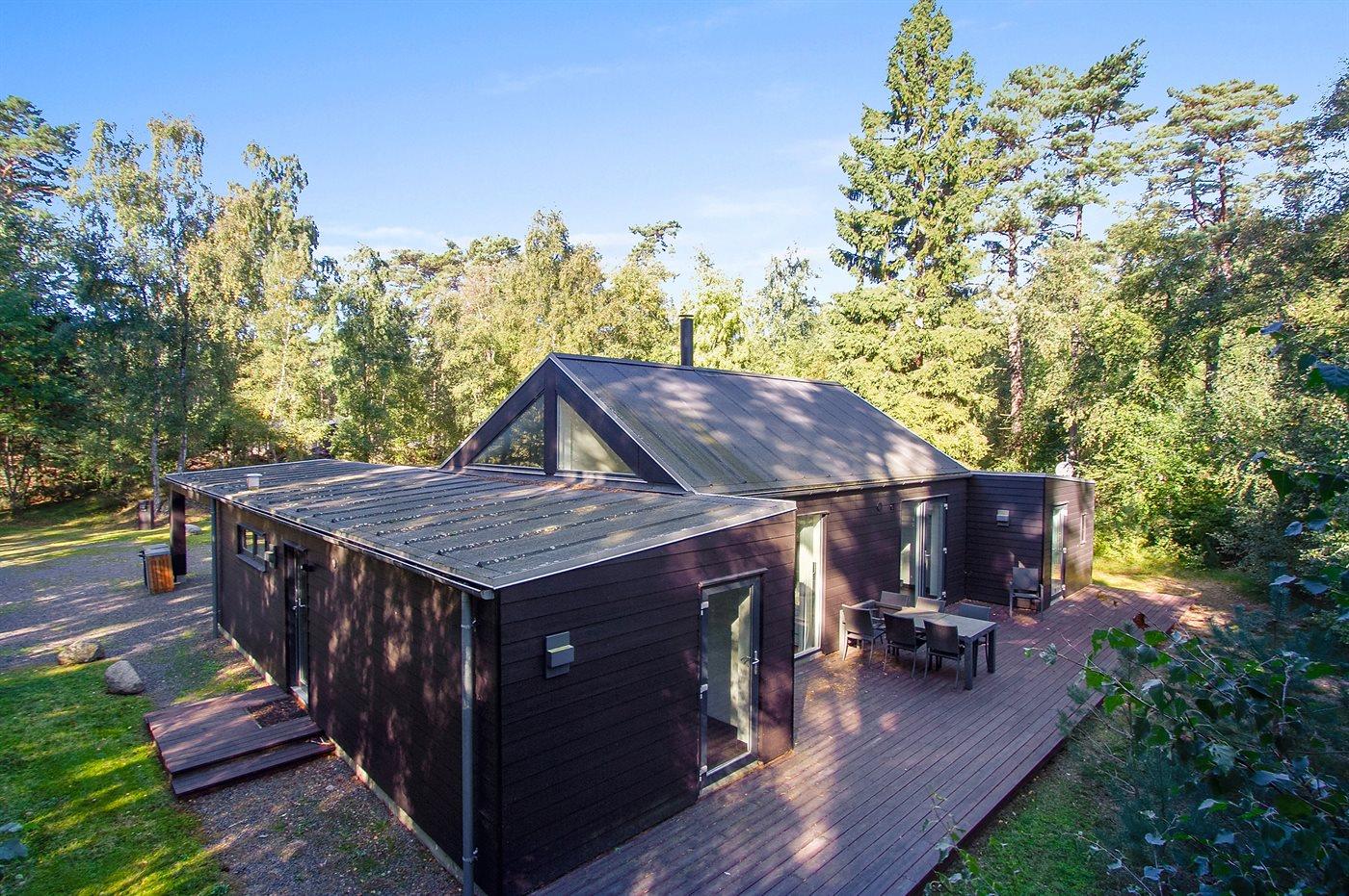 Flot og unikt sommerhus, hvor der er lagt vægt på gennemført kvalitet, spændende arkitektur og velovervejet gedigen indretning. Huset har dejlige lysindfald igennem panoramavinduer, og en særlig dørindretning gør at man kan lukke naturen helt indenfor en varm sommeraften. En skøn træterrasse hører til huset, og på den store grund findes legeområde til børnene.