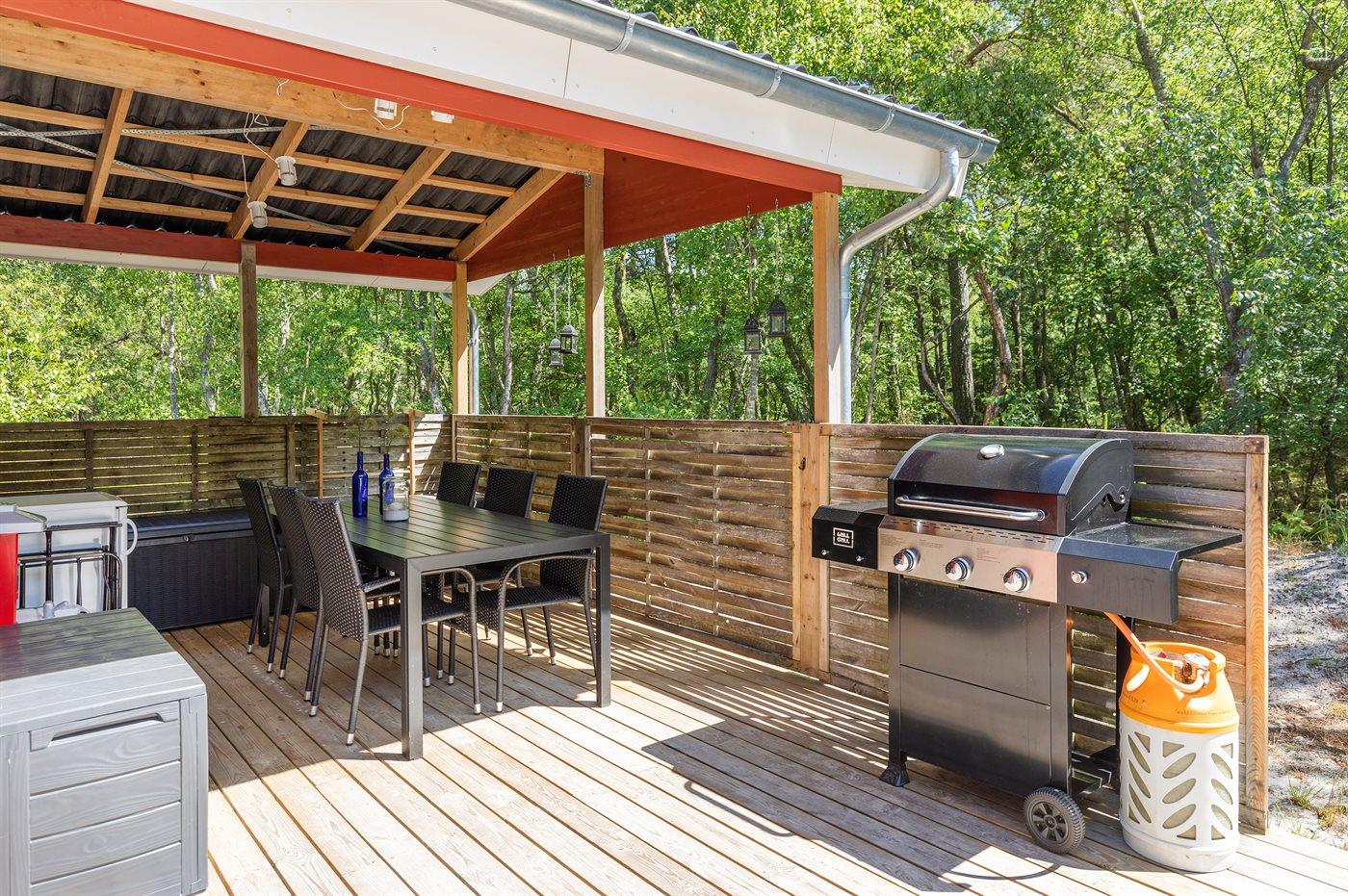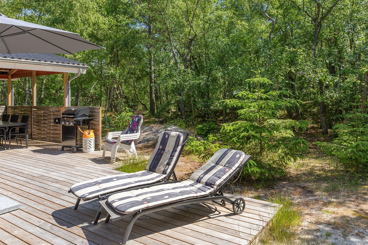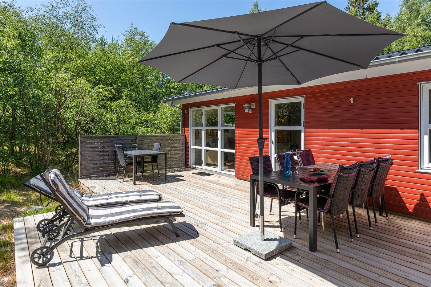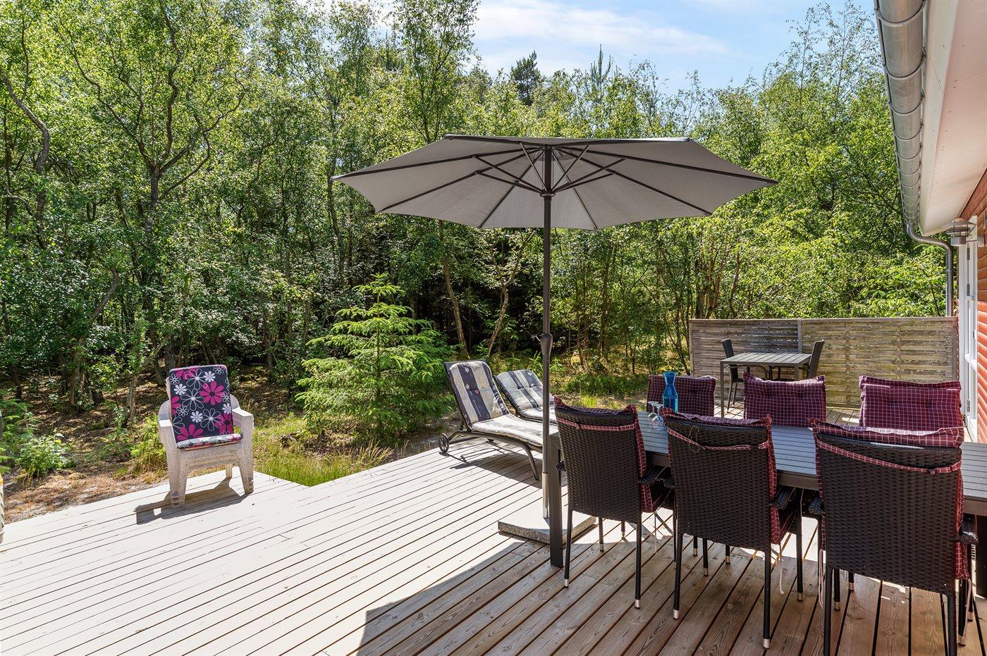 Ferieboligen er beliggende på en 2500 m² stor naturgrund. Der er 650 m til havet. Nærmeste forretning er beliggende i en afstand af 500 m. Til ferieboligen hører 40 m² terrasseareal. Desuden er der 12 m² overdækket terrasse. Grill til rådighed. Parkering ved ferieboligen.