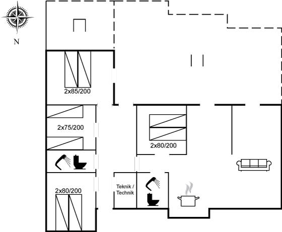 Der er i alt 4 soveværelser. Sovepladserne fordeler sig på: 6 sovepladser i dobbeltsenge. 2 sovepladser i enkeltsenge.