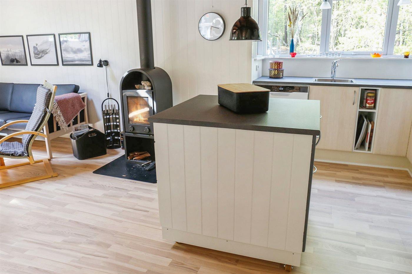 Køkkenet er udstyret med 1 køleskab. Der er 4 keramiske kogeplader, varmluftovn samt opvaskemaskine.