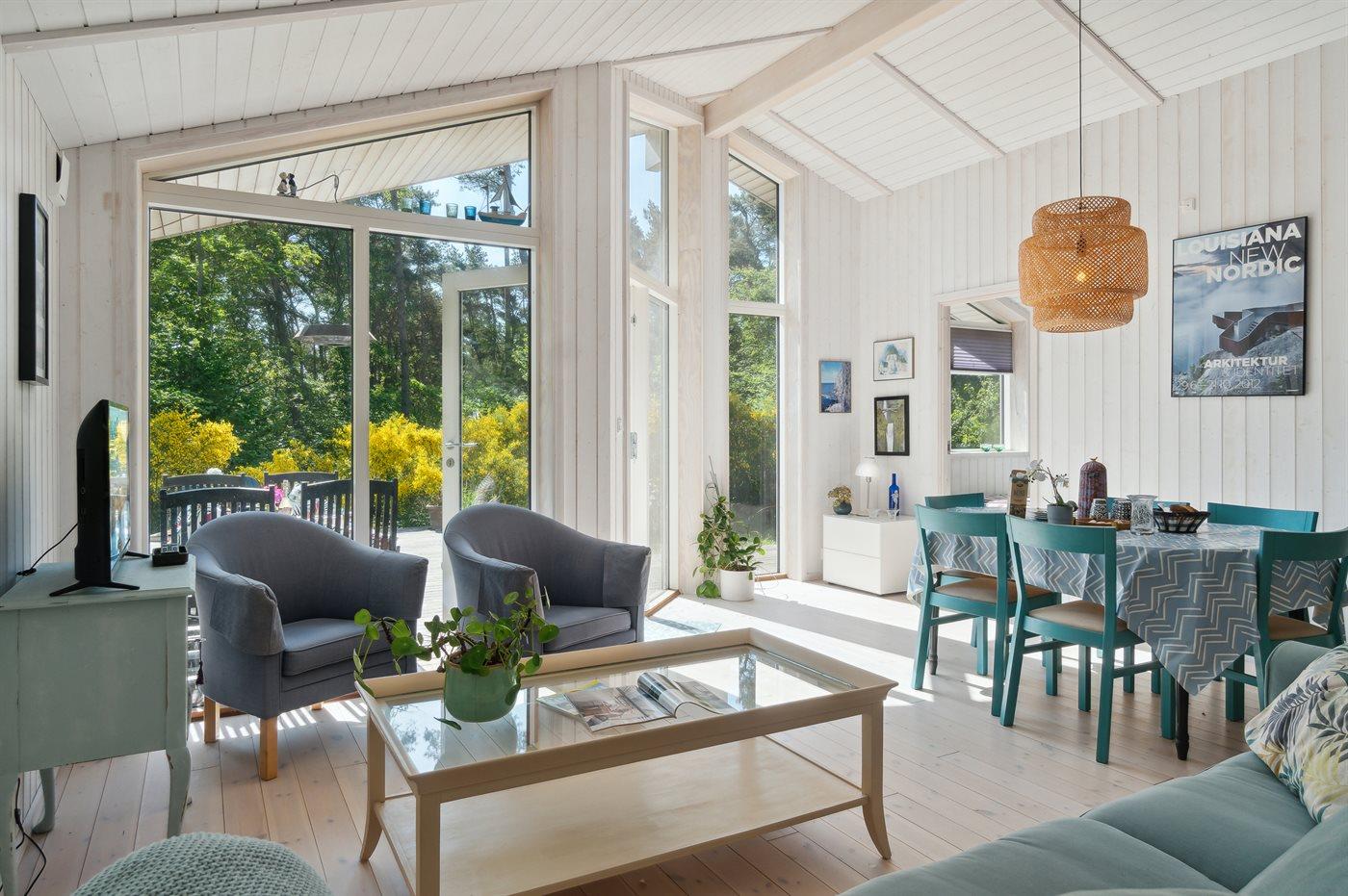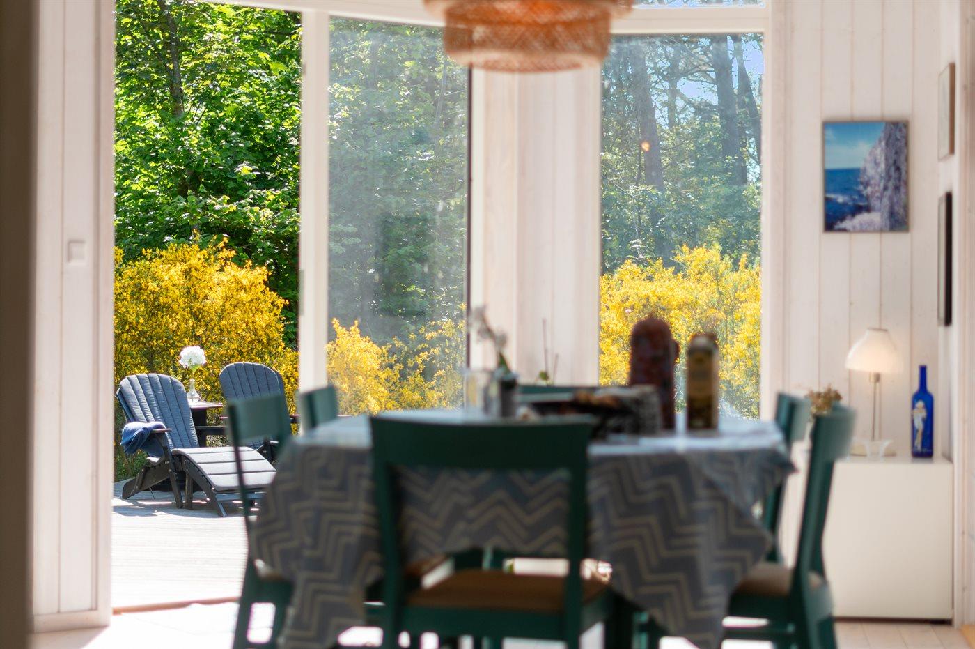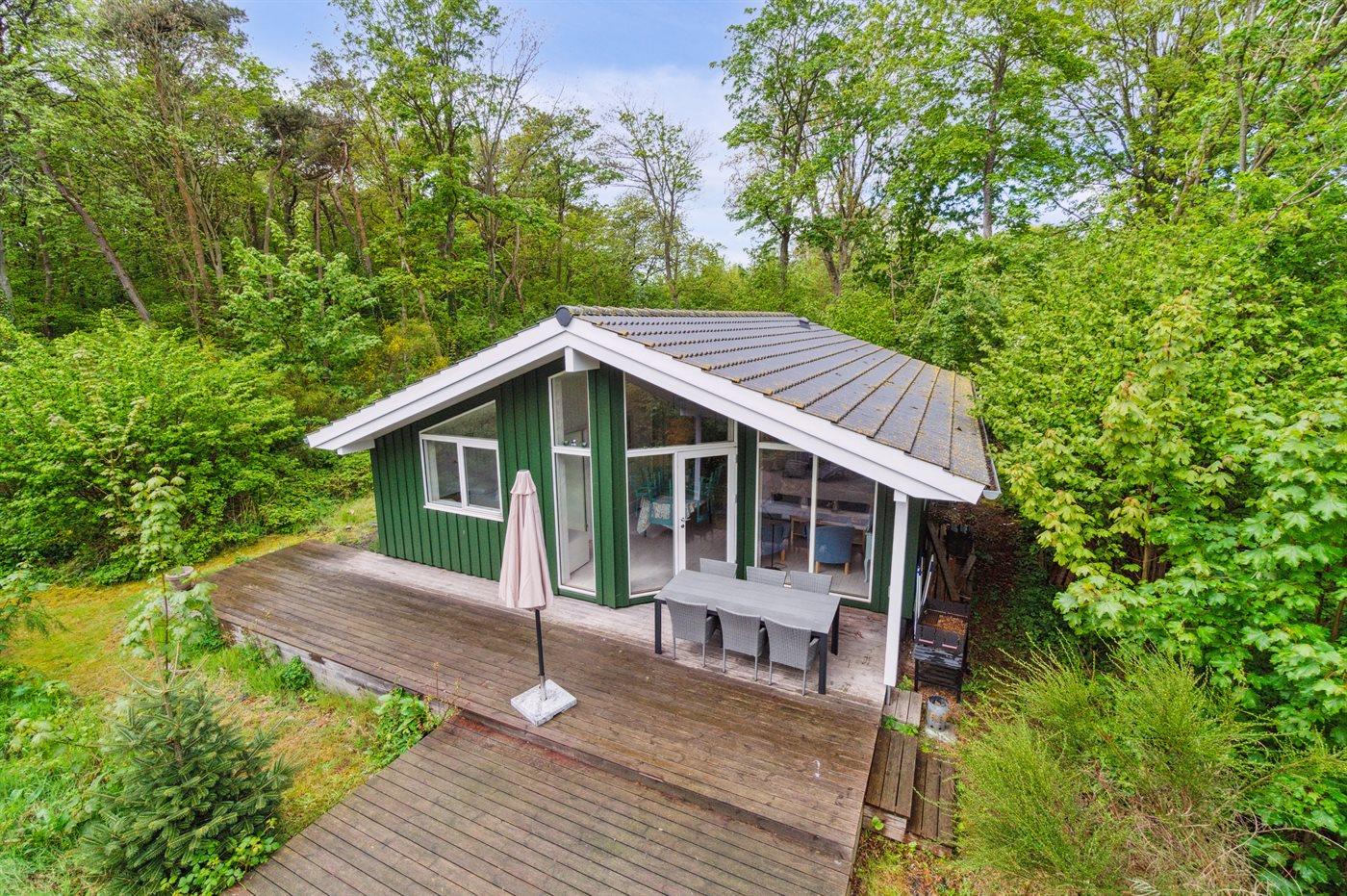 Stort vinduesparti direkte ud i naturen, der omgiver sommerhuset, med en større terrasse, hvor solen kan nydes. Snogebæk ligger nær og byder både på supermarked, restauranter, håndlavet chokolade, detailbutikker, pizzeria og Sørens Værtshus.