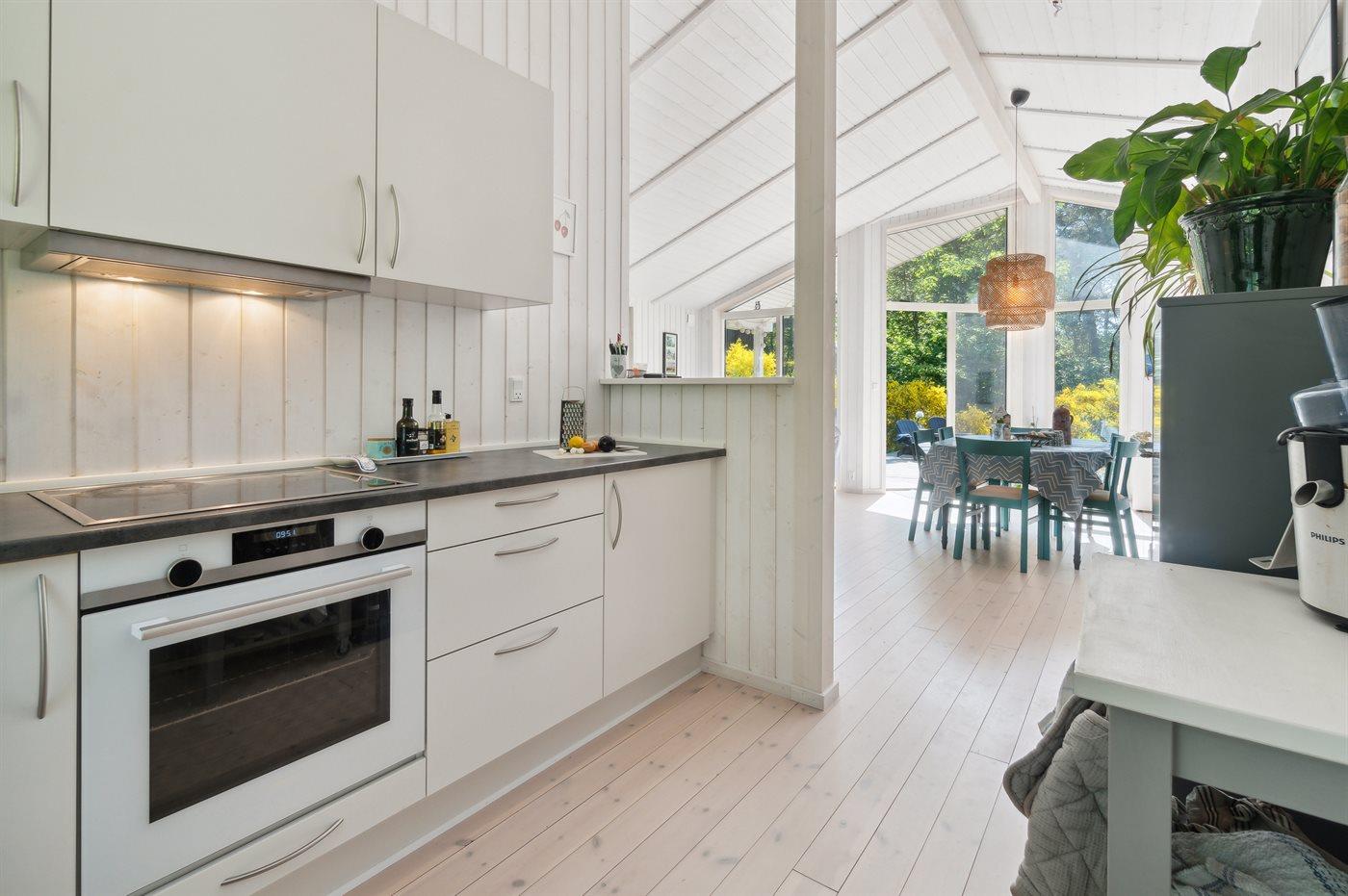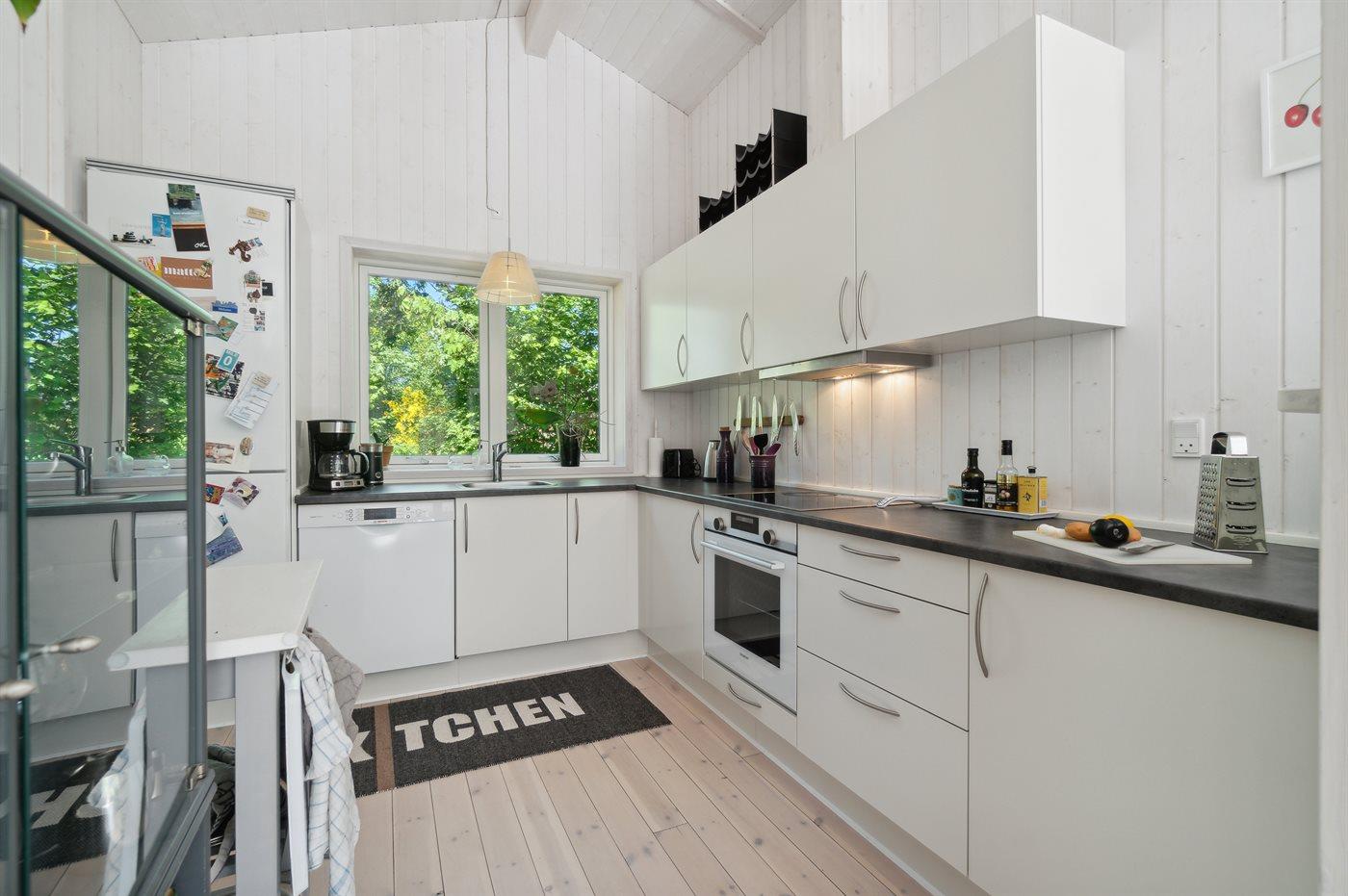 Køkkenet er udstyret med 1 køleskab. Der er 4 keramiske kogeplader, varmluftovn samt opvaskemaskine.