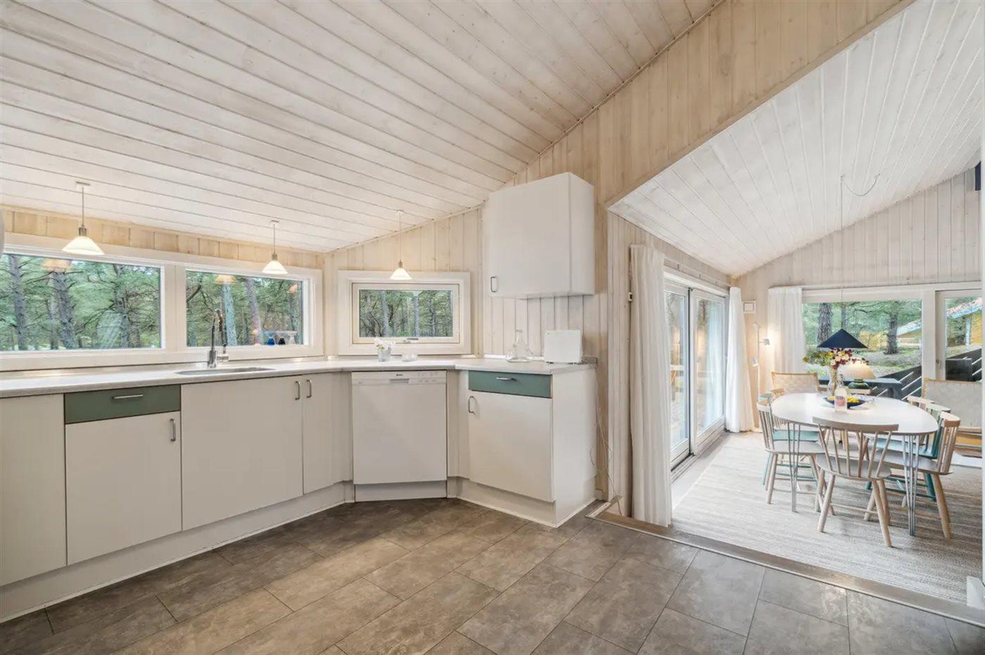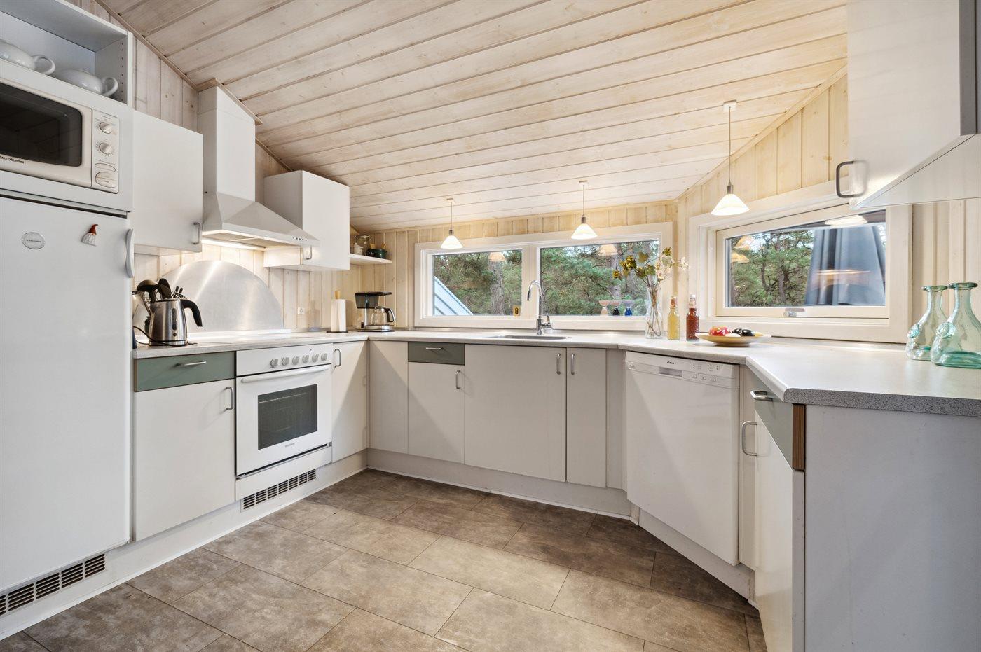 Køkkenet er udstyret med 1 køleskab. Der er 4 keramiske kogeplader, varmluftovn, mikrobølgeovn samt opvaskemaskine.