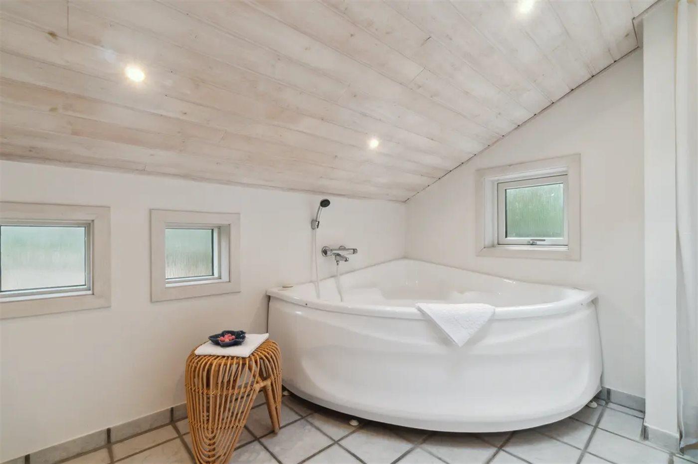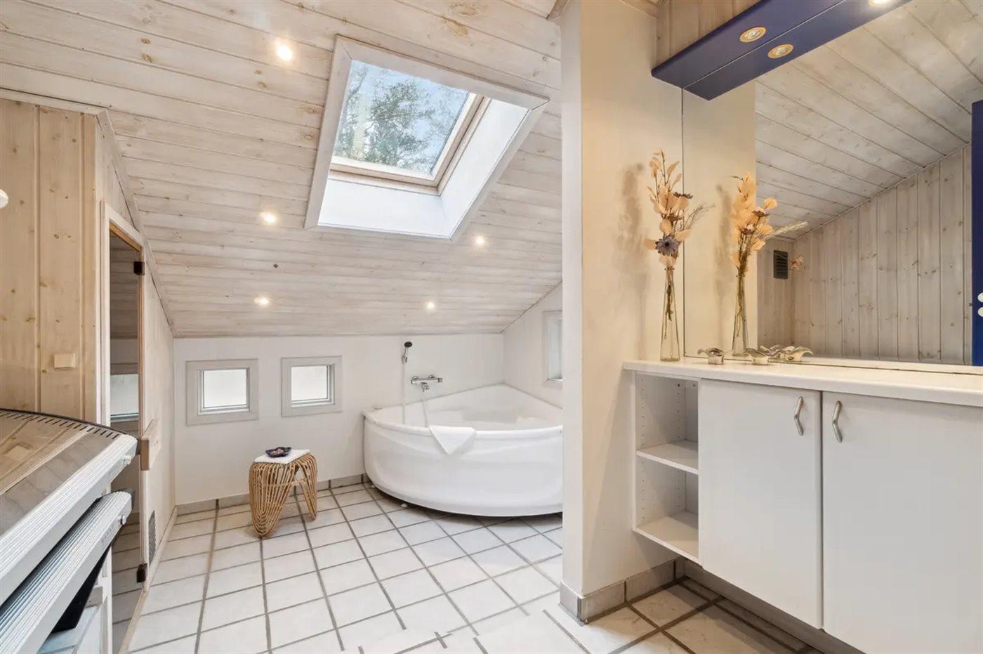 Der er 2 badeværelser med bruseniche og 2 toiletter. Der er gulvvarme på 2 badeværelser. I saunaen er der mulighed for afslapning.